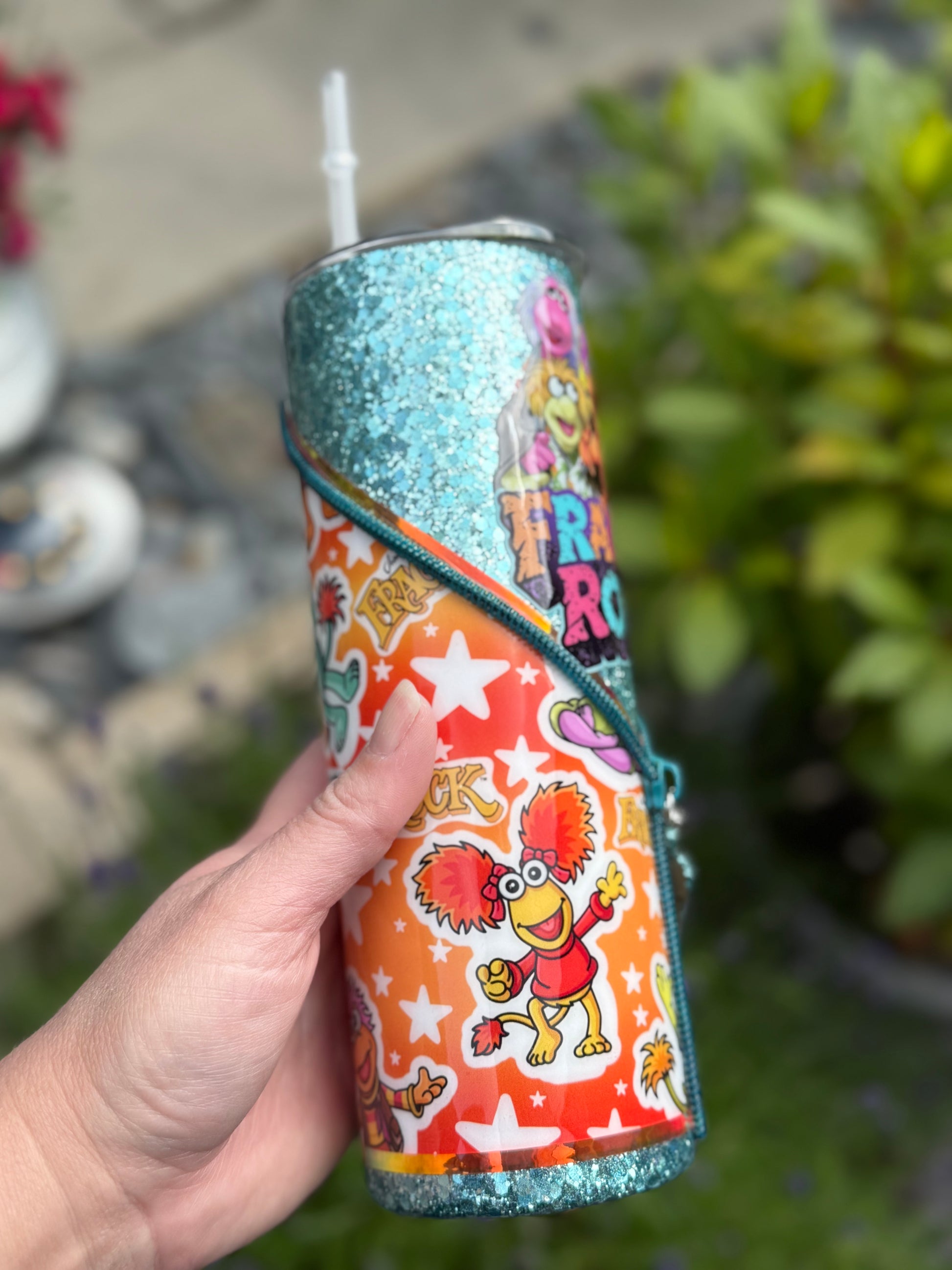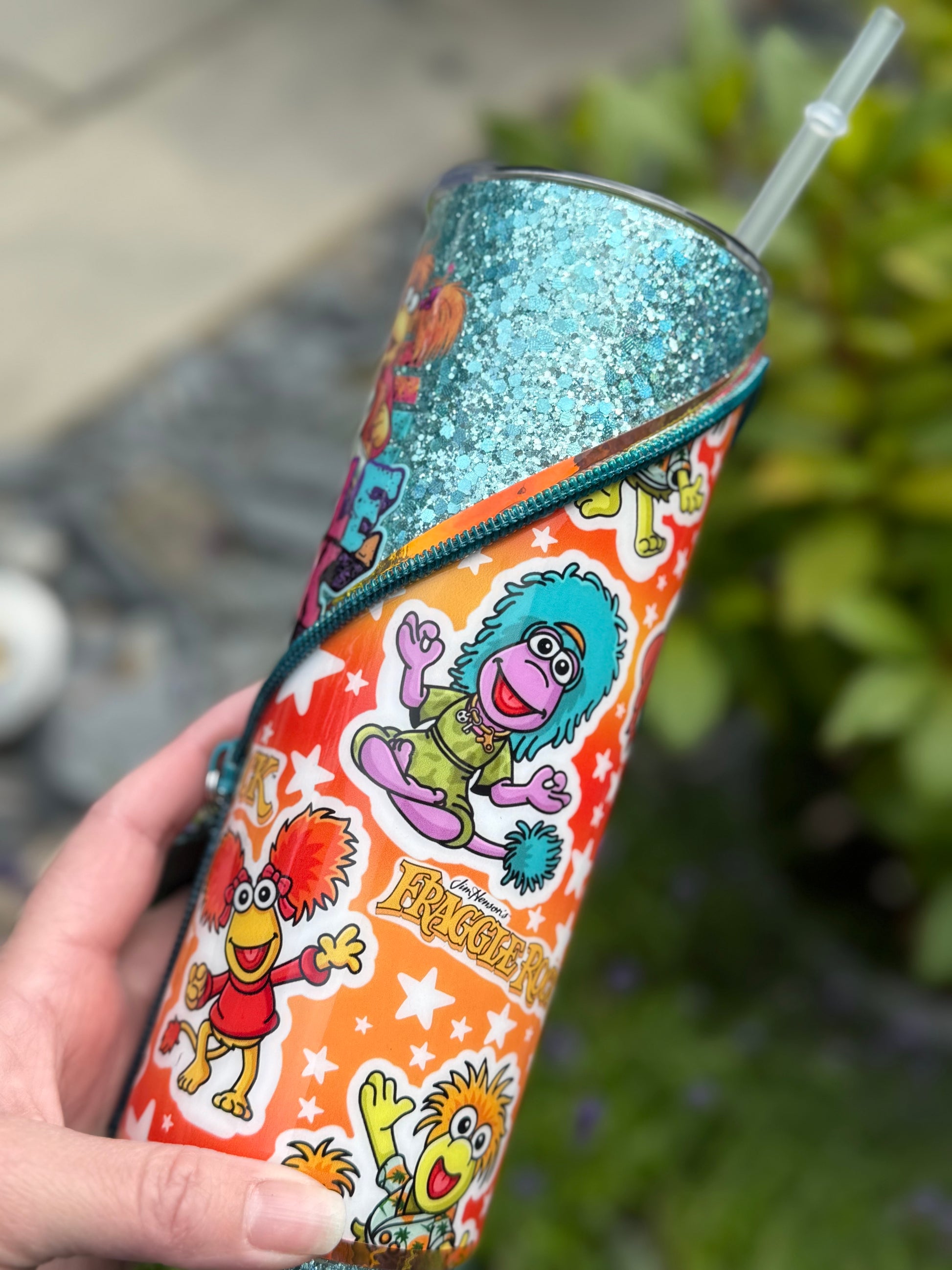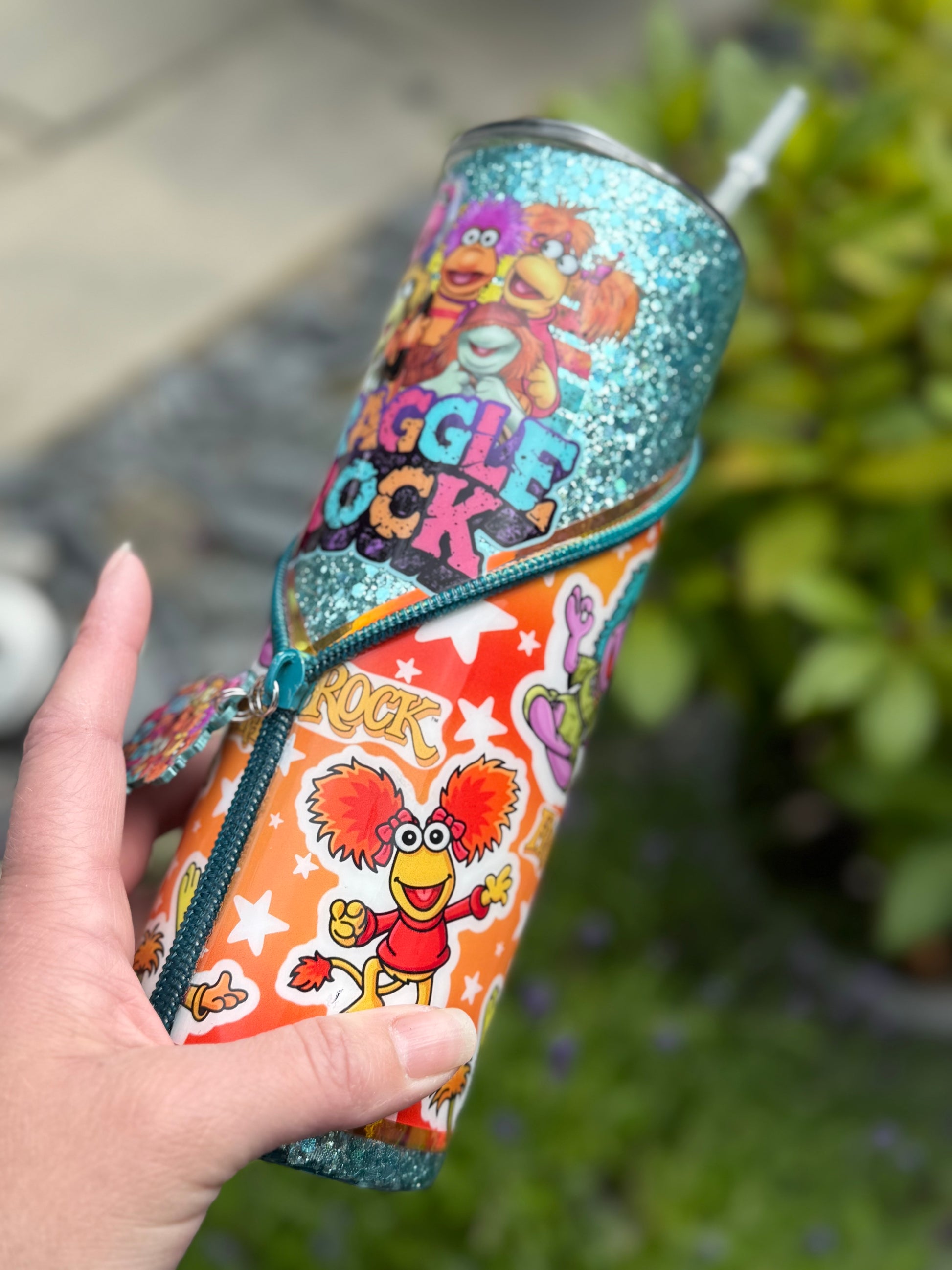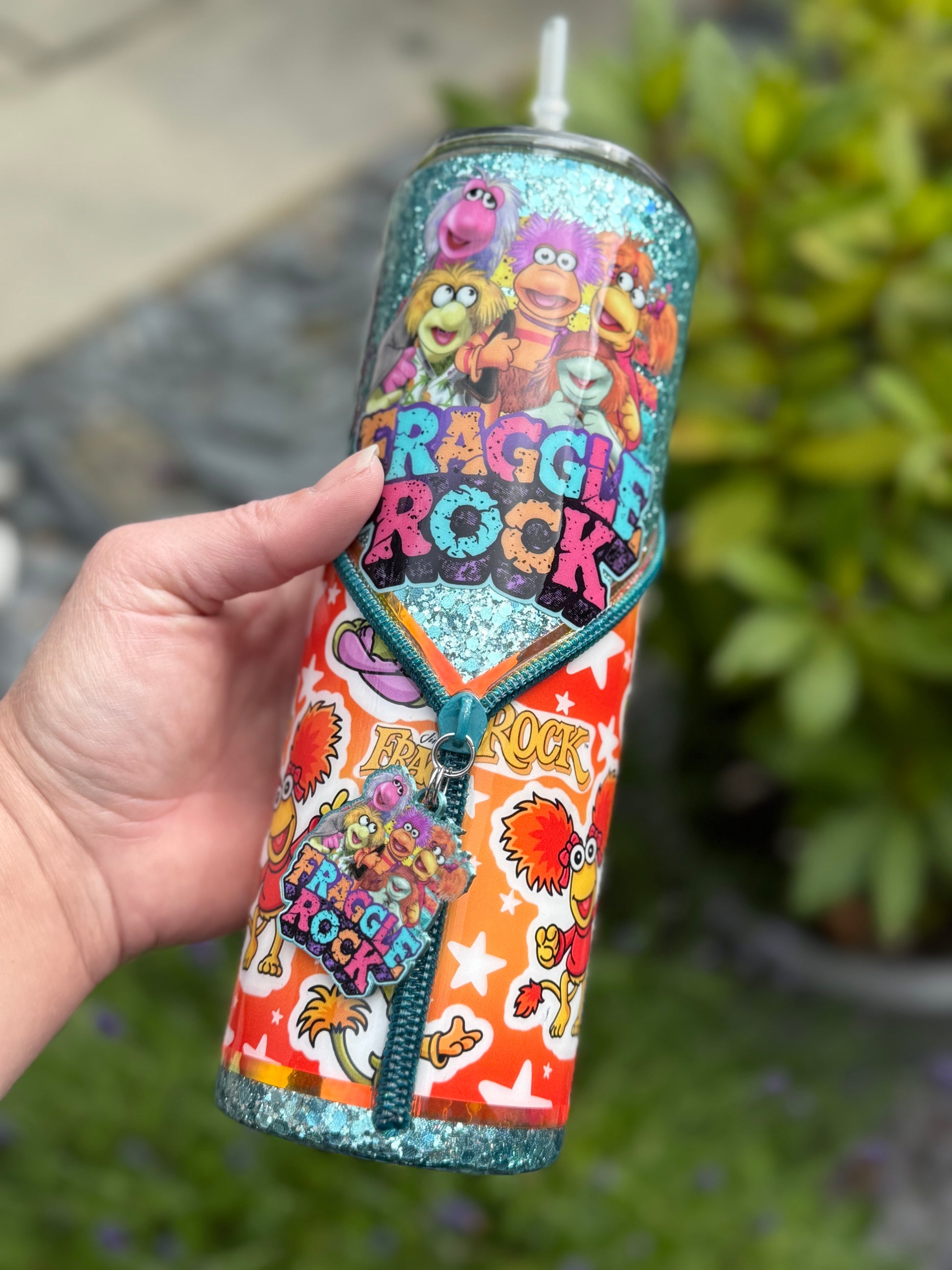 20oz stainless steel tumbler with Fraggle Rock design and stunning glitter, all sealed with Hyperion for a beautiful glass like finish. Added zip detail is for decoration purposes only.