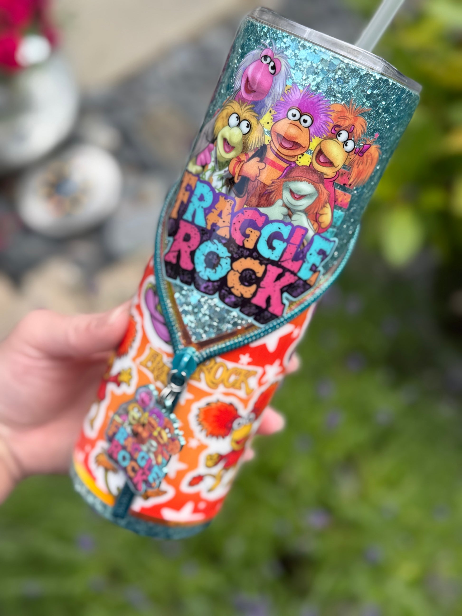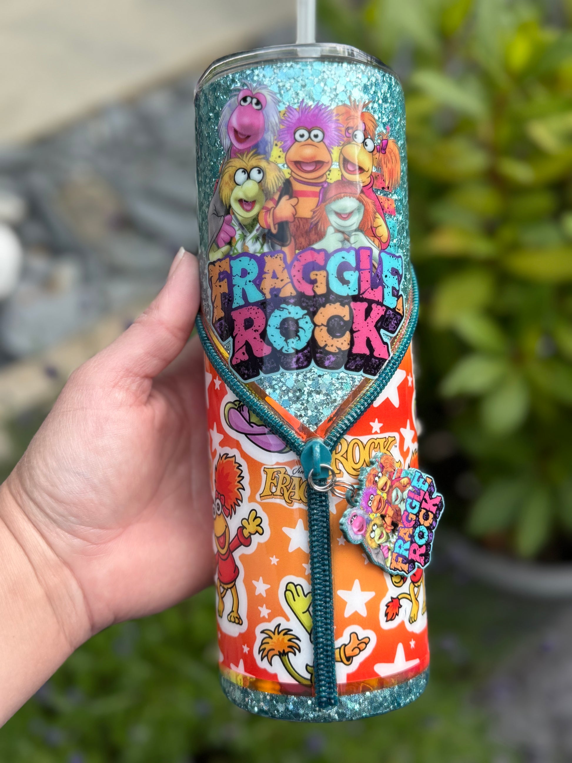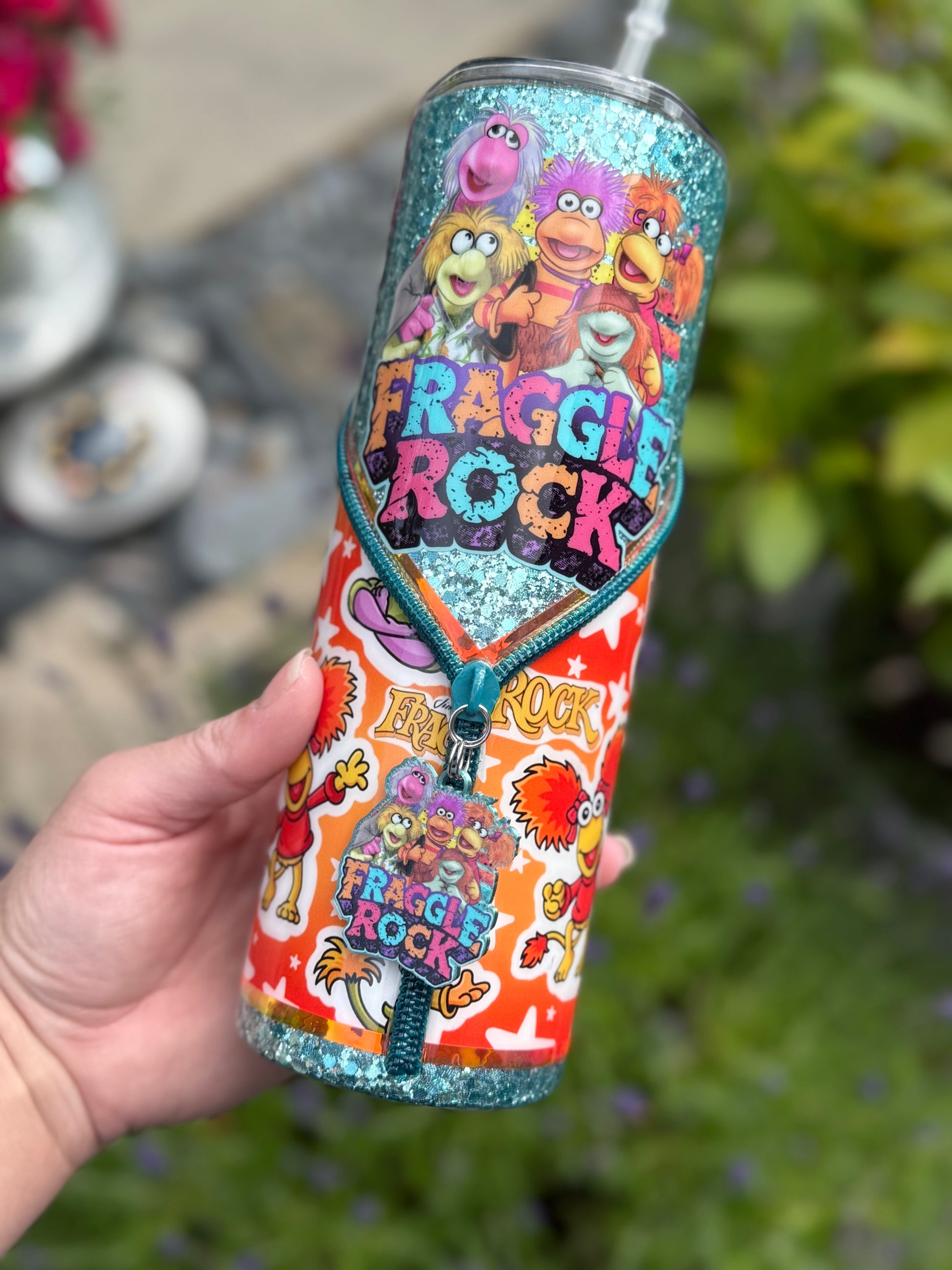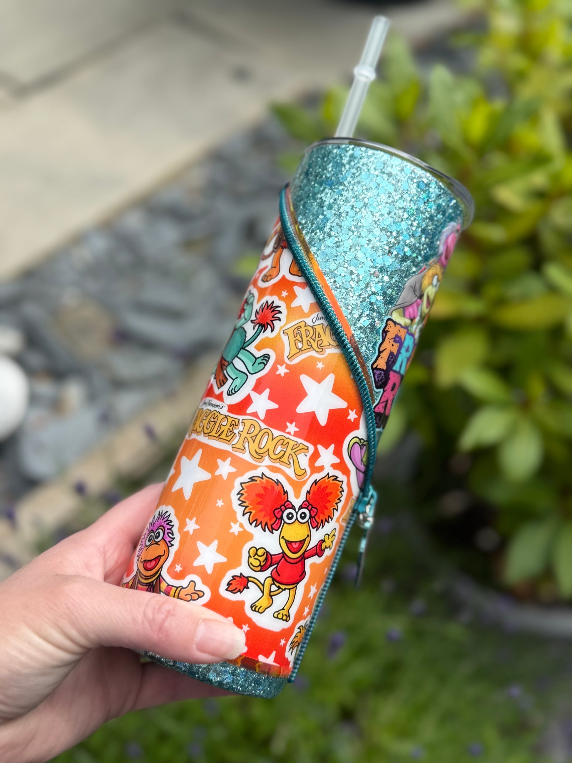 20oz stainless steel tumbler with Fraggle Rock design and stunning glitter, all sealed with Hyperion for a beautiful glass like finish. Added zip detail is for decoration purposes only.