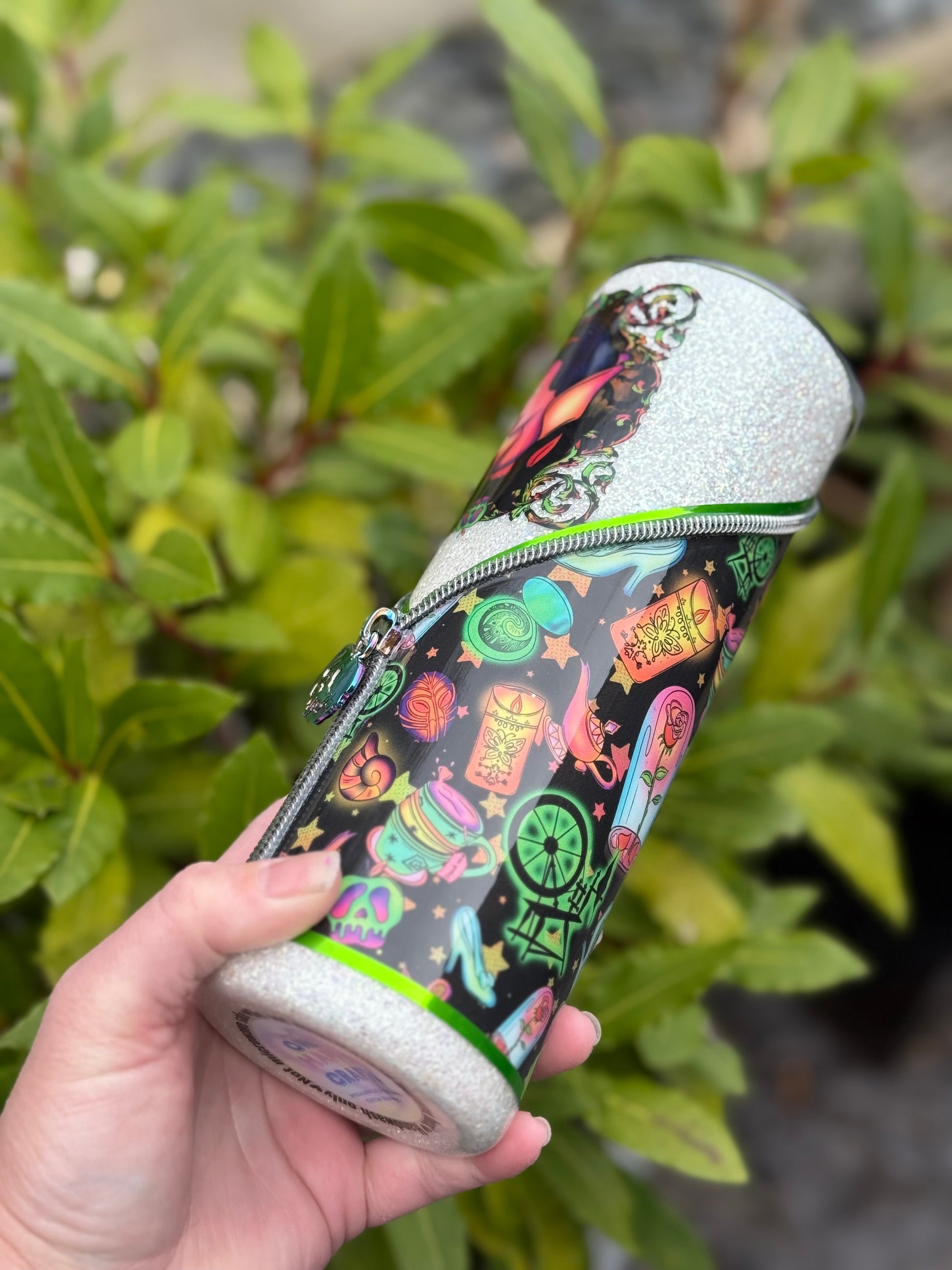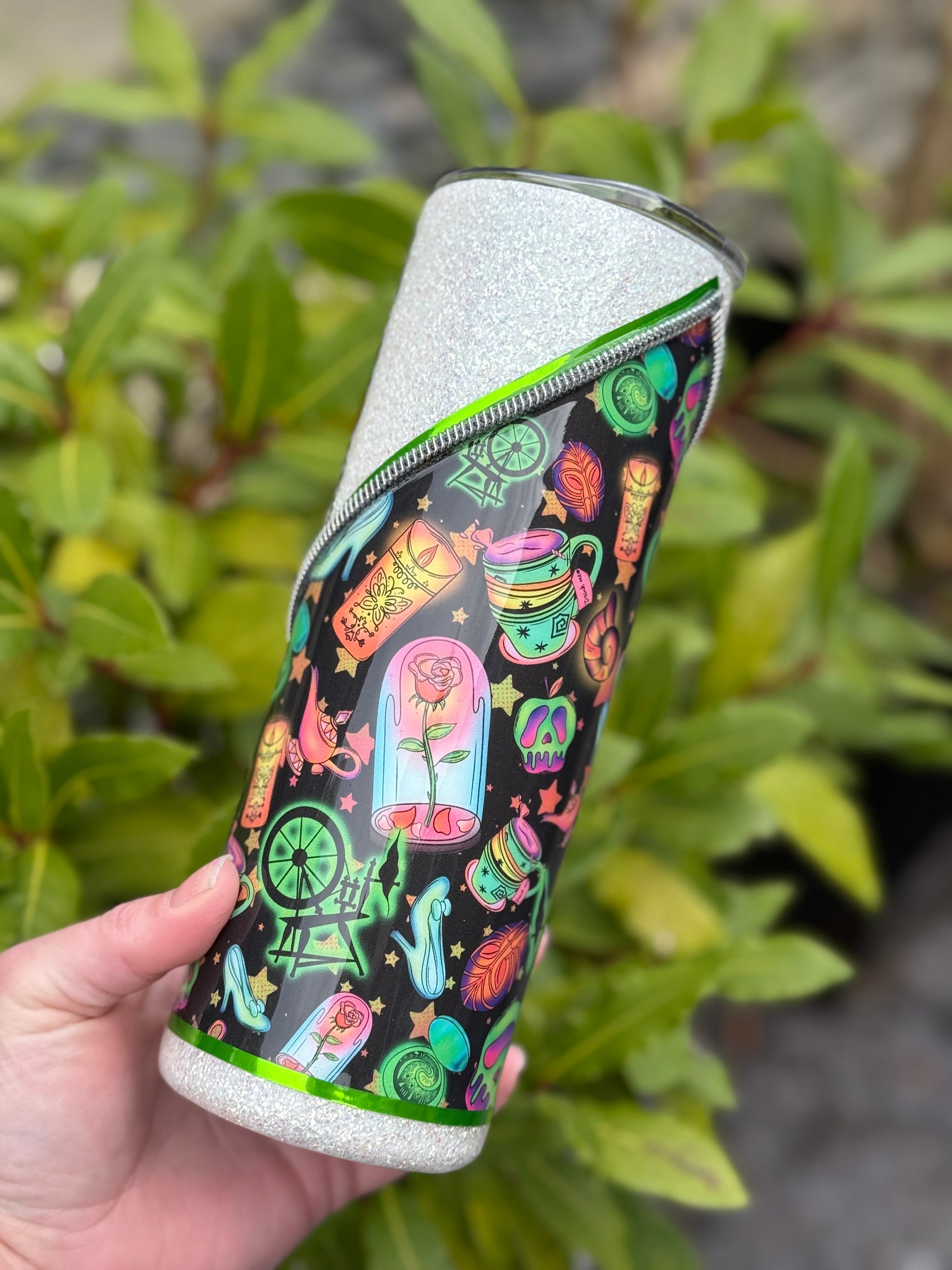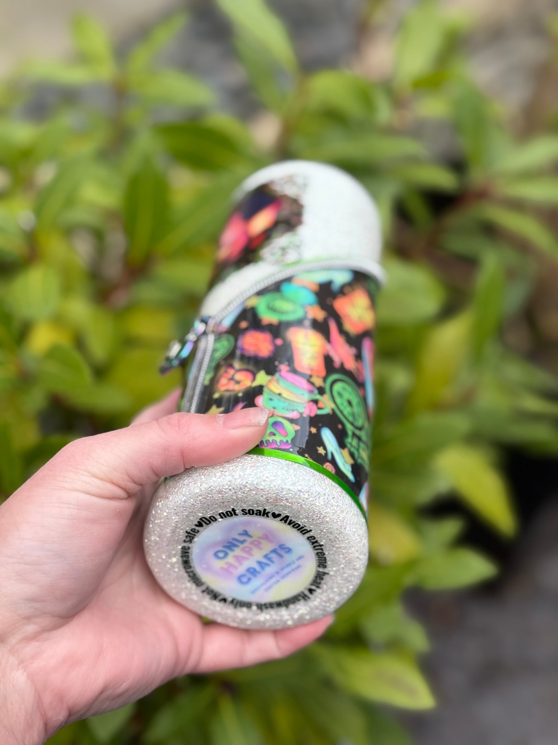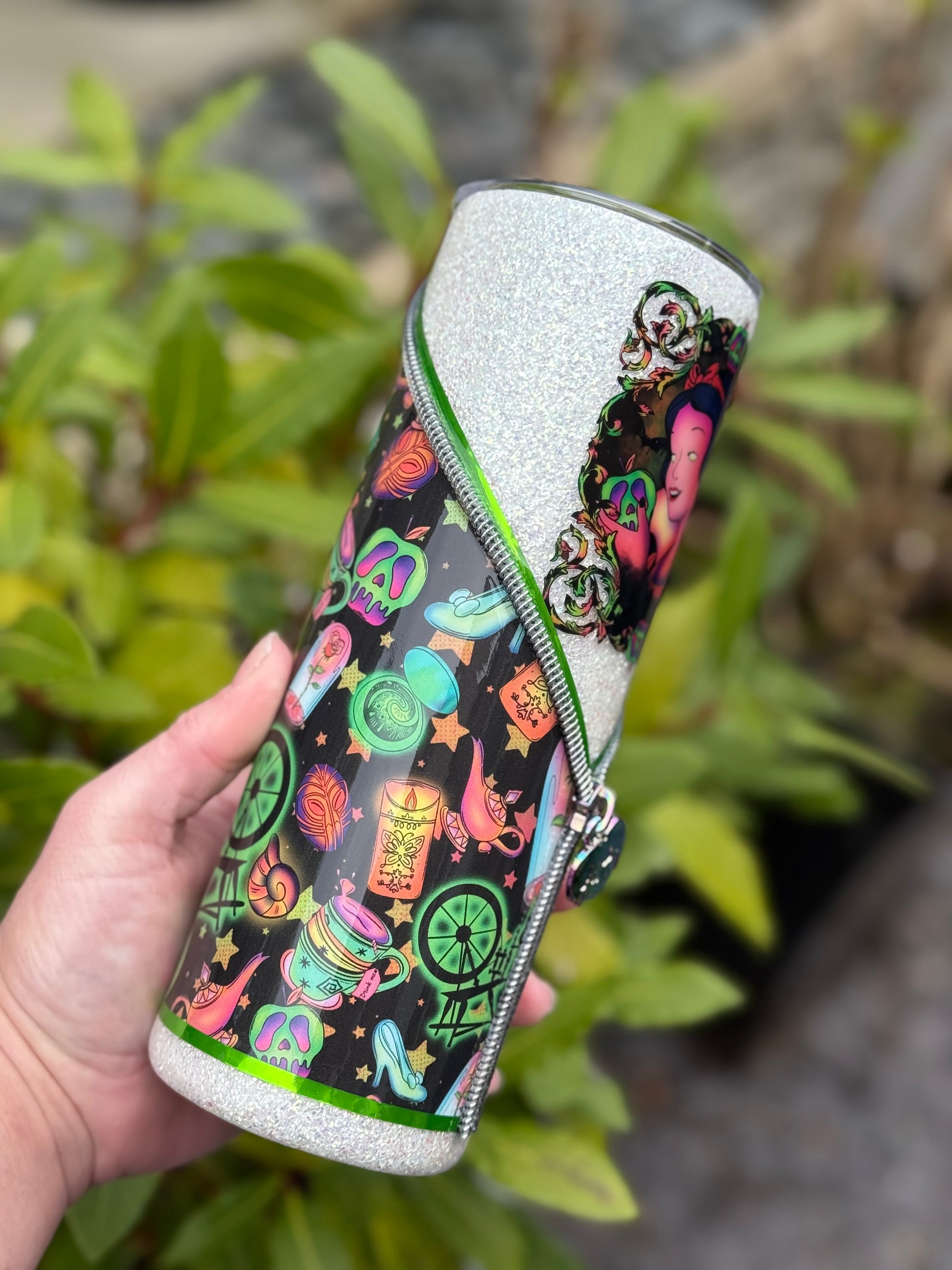 20oz stainless steel tumbler with patterned vinyl and stunning textured glitter all sealed with Hyperion for that beautiful shine.