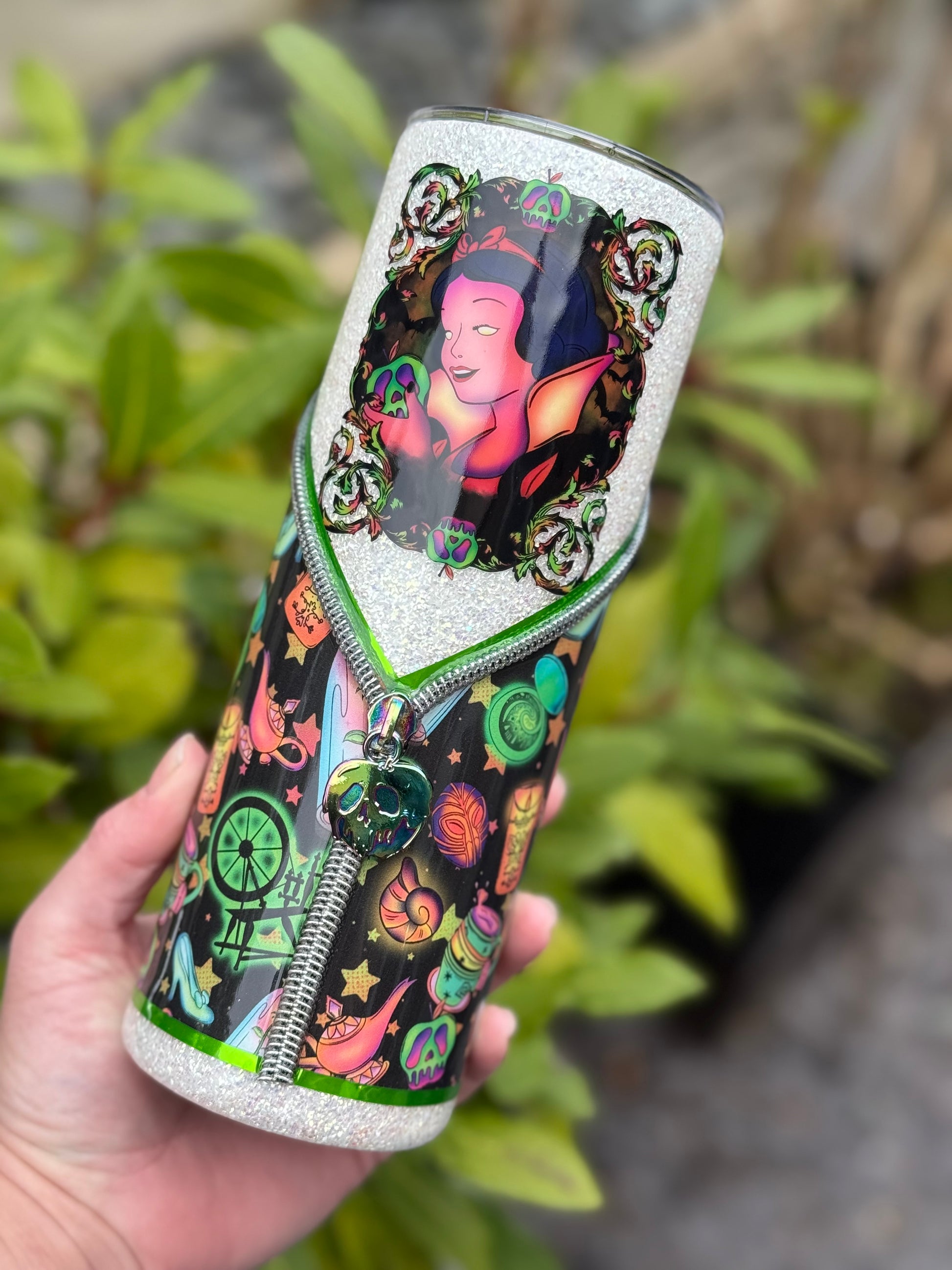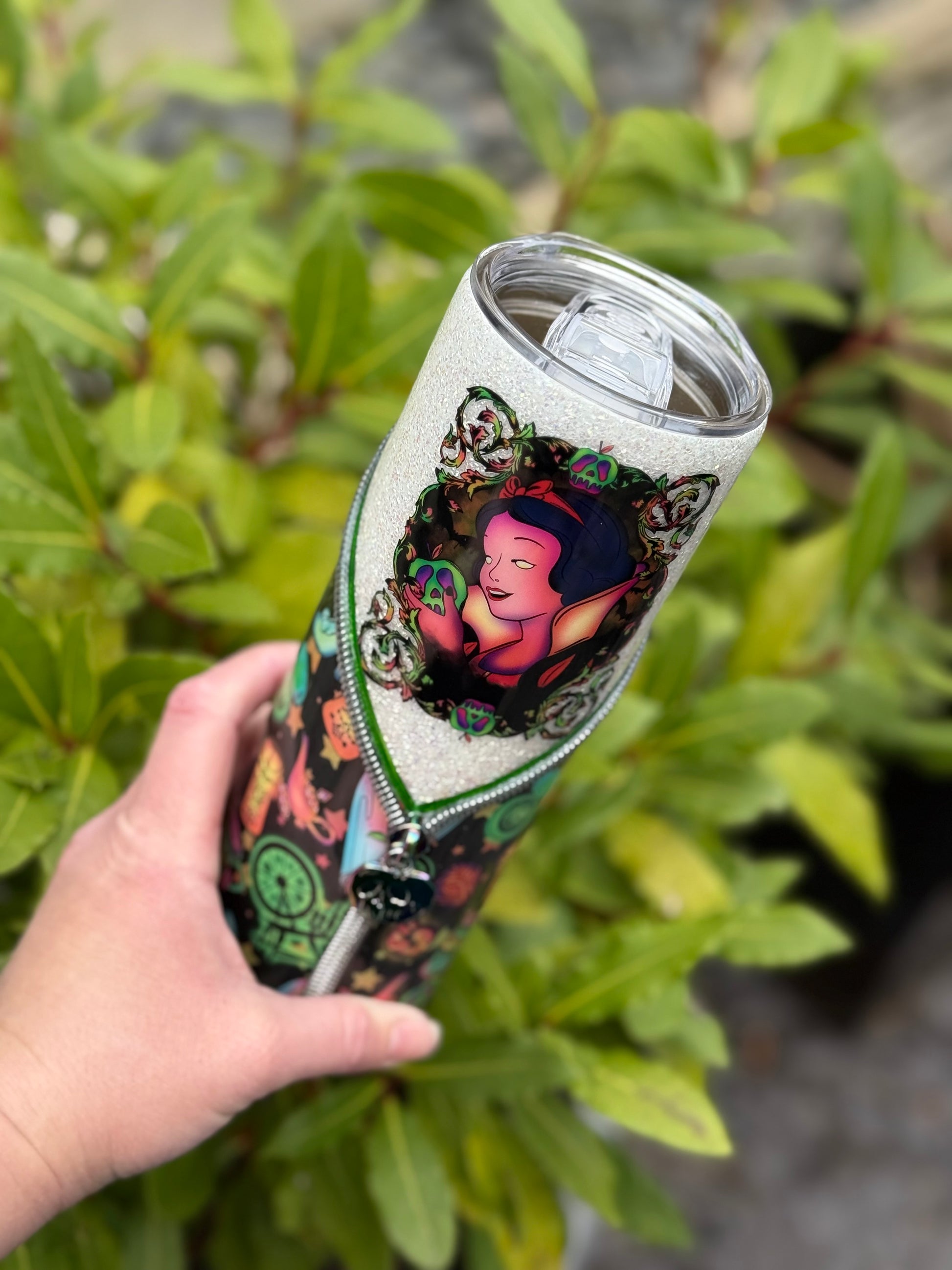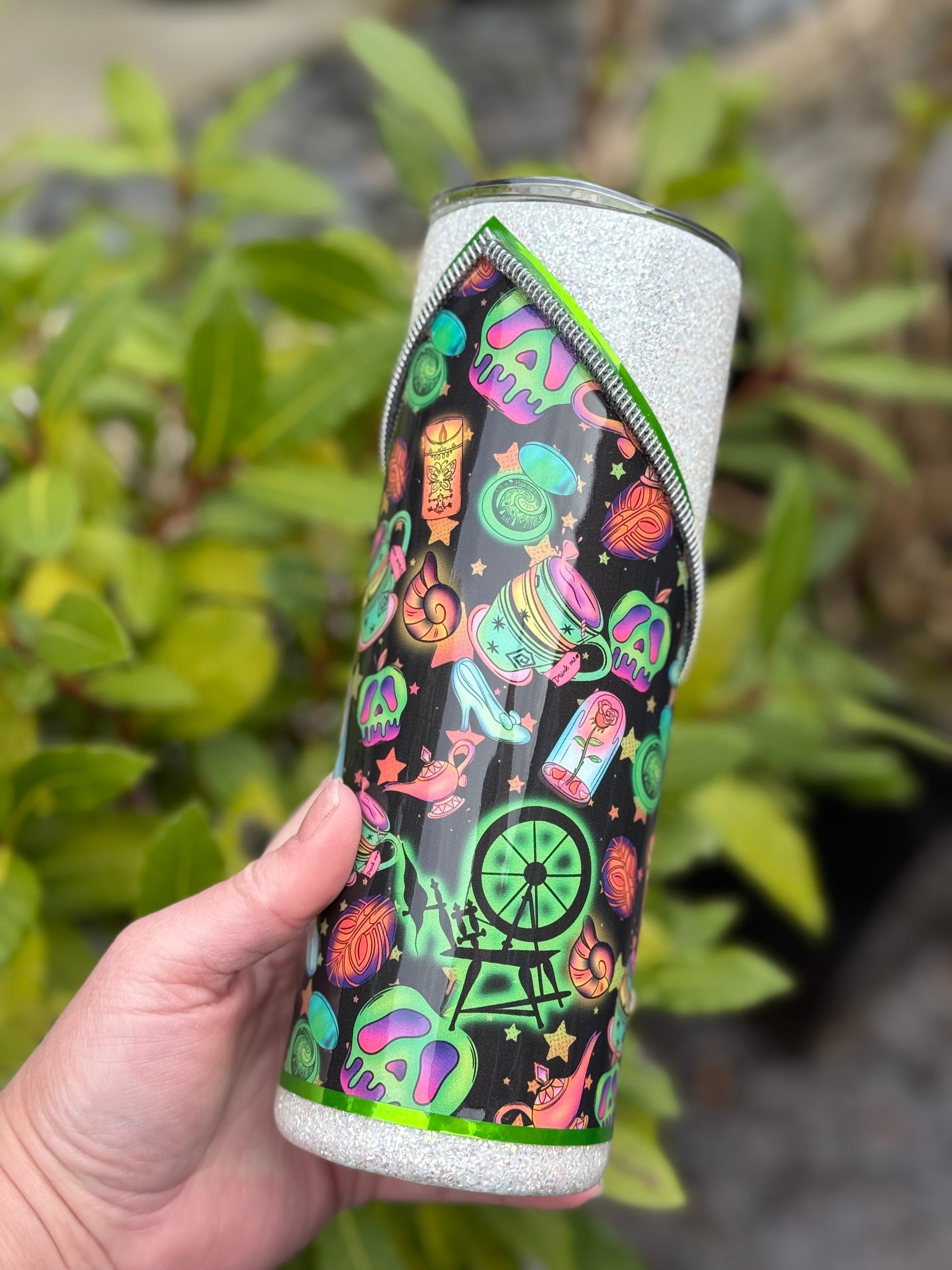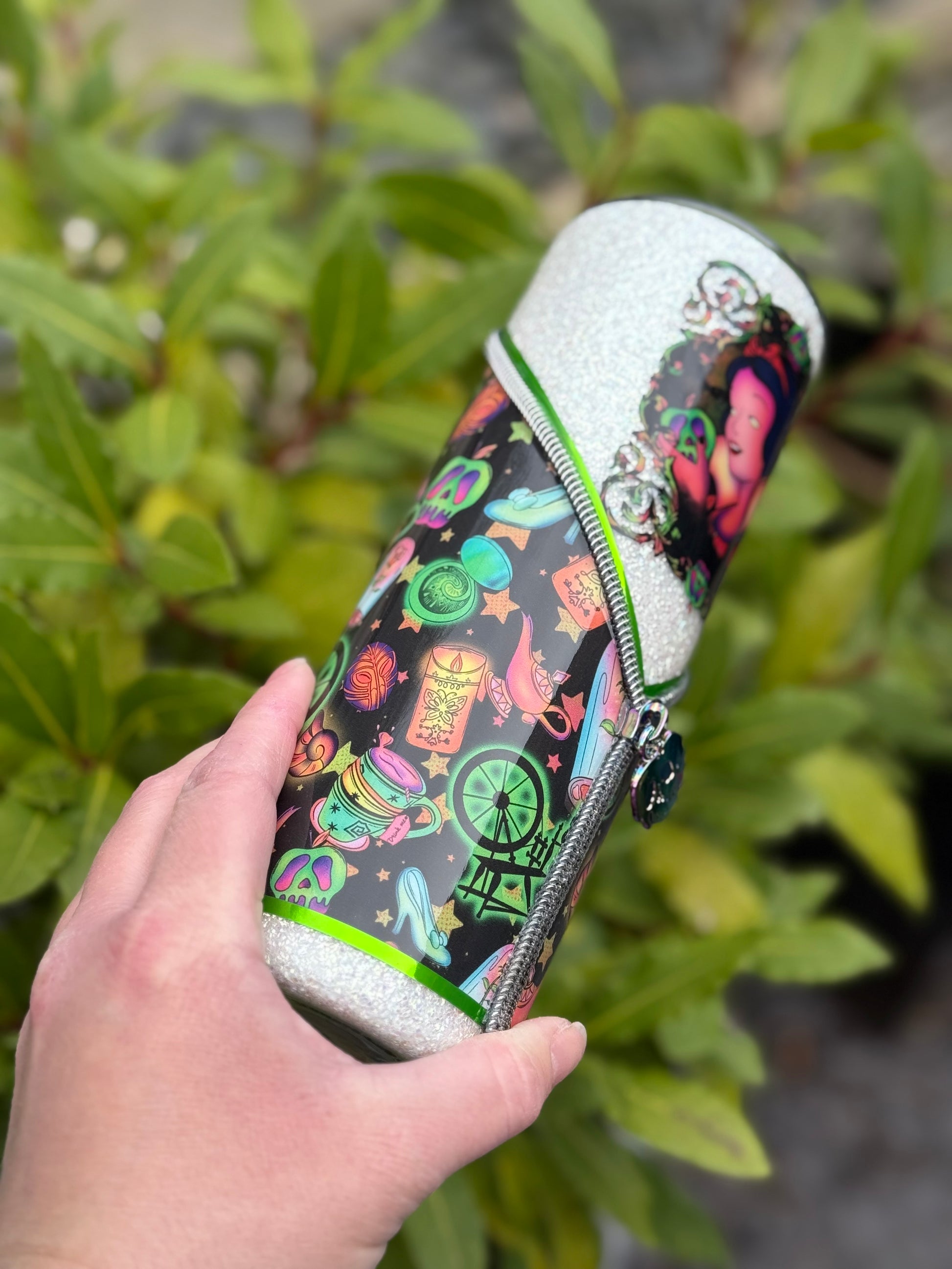 20oz stainless steel tumbler with patterned vinyl and stunning textured glitter all sealed with Hyperion for that beautiful shine.