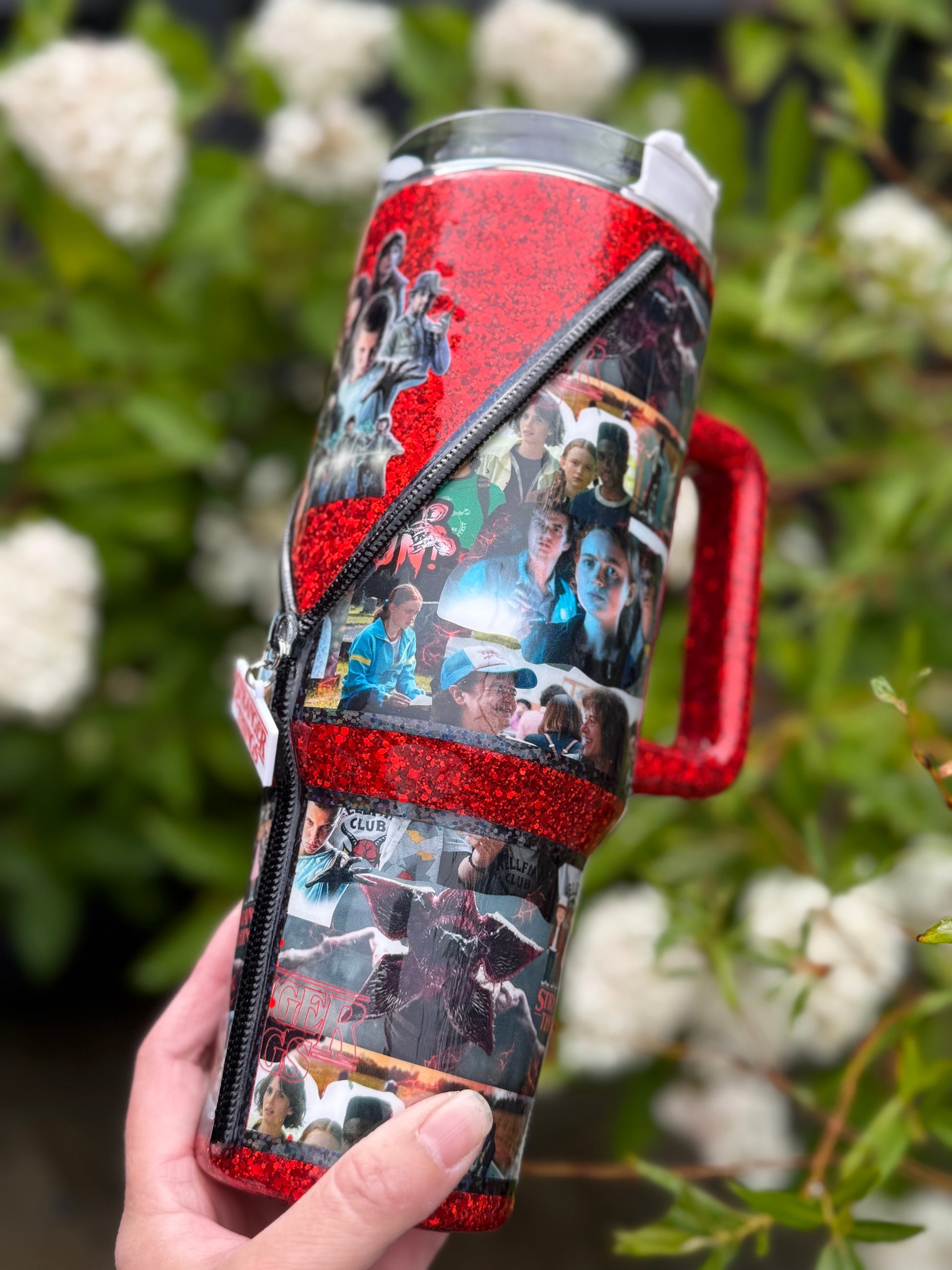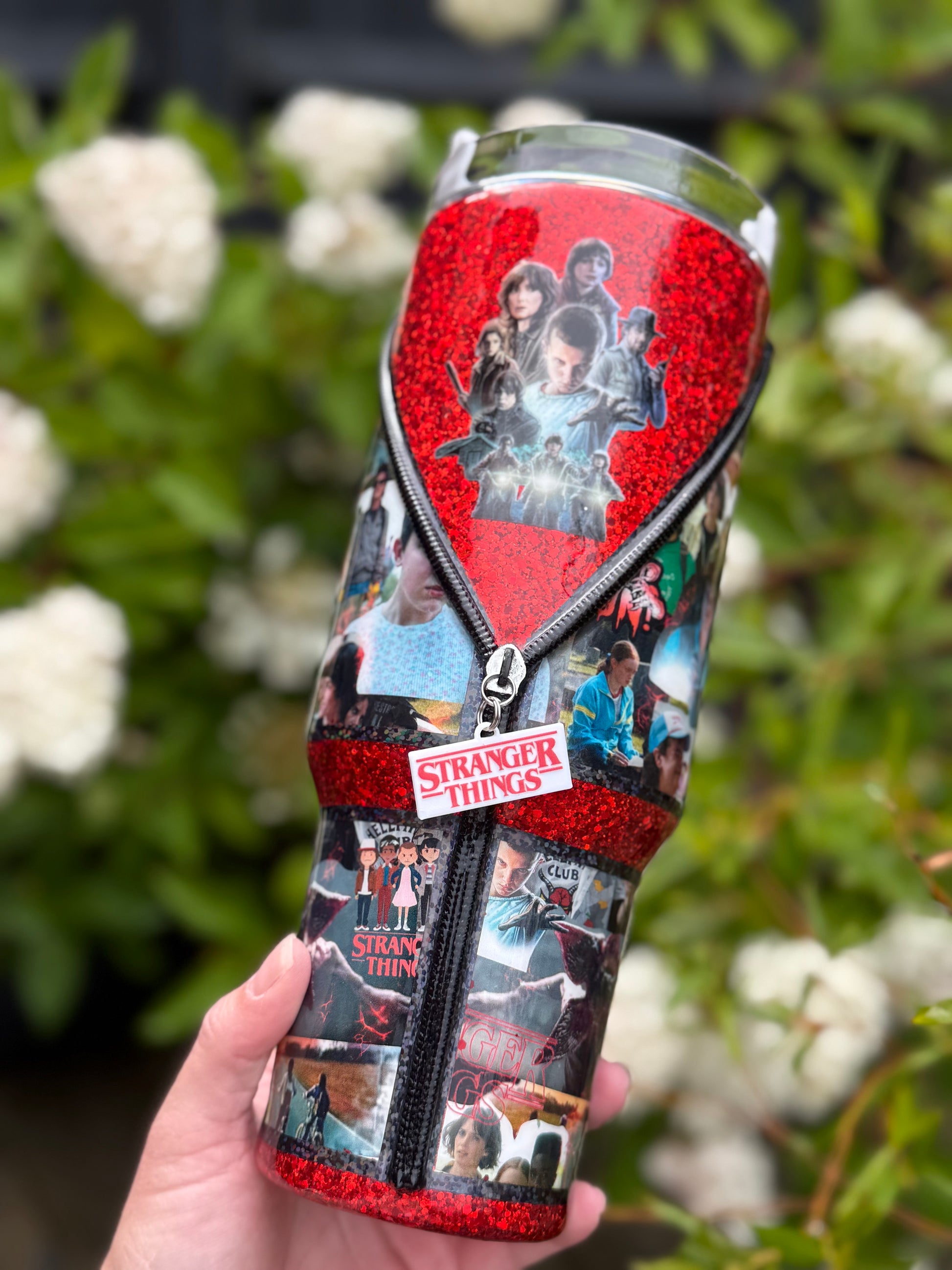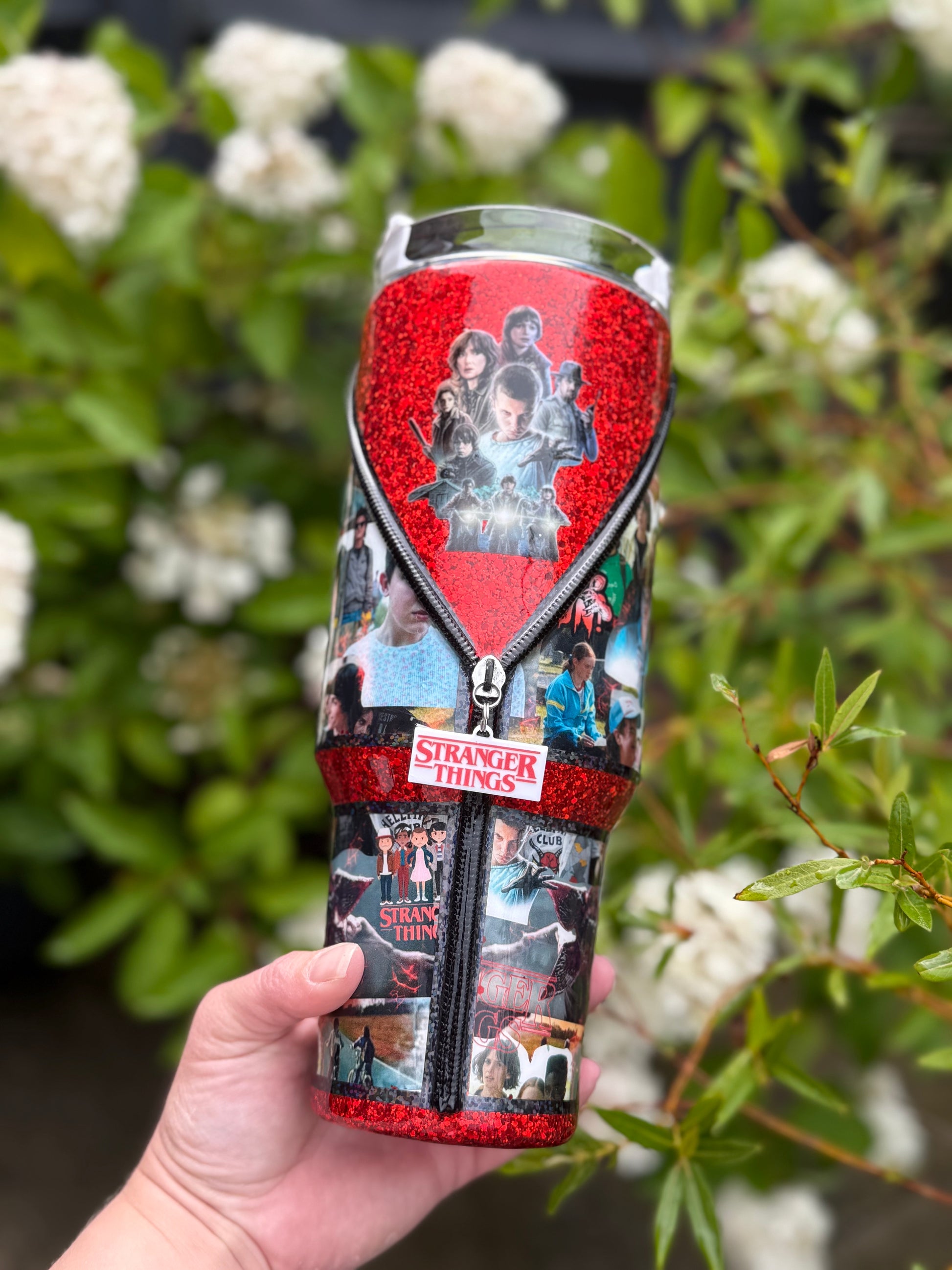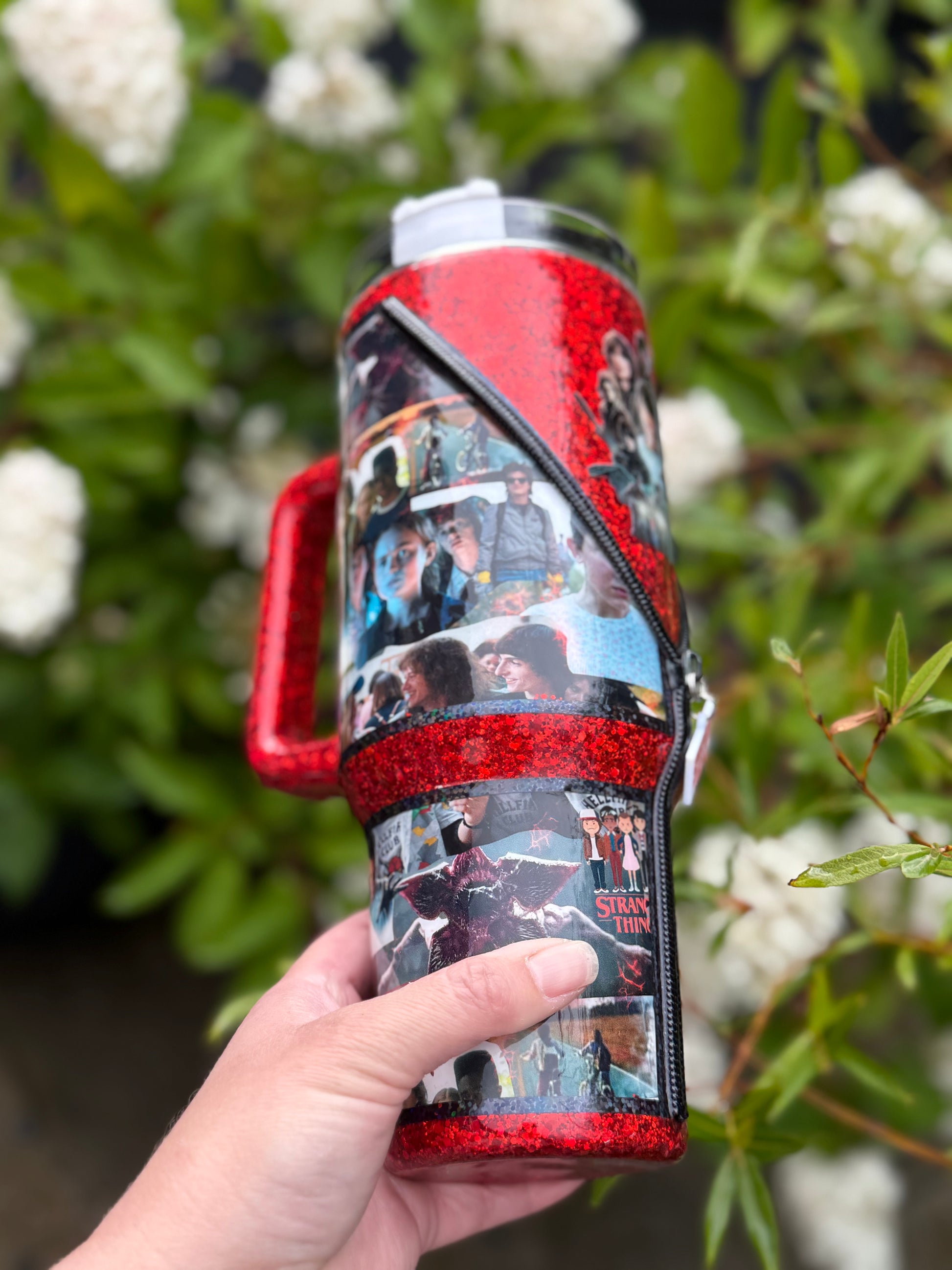 40oz stainless steel tumbler with Stranger Things zipper design and stunning matching glitter, all sealed with Hyperion for a beautiful shine, with added zip detail.