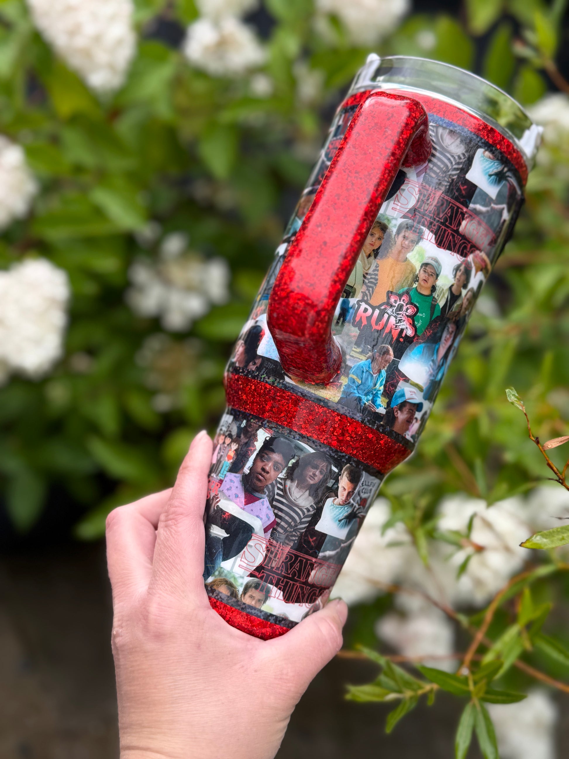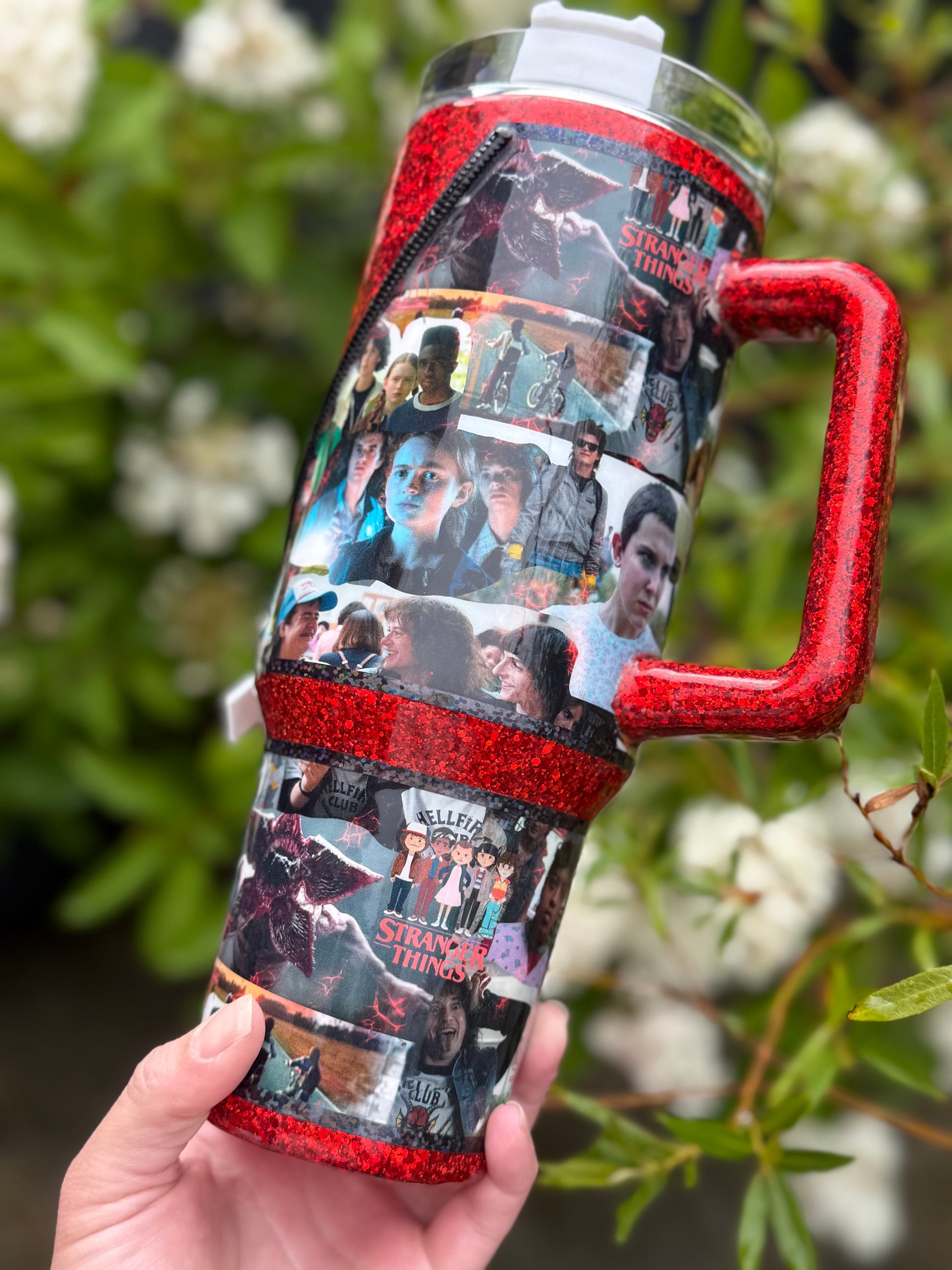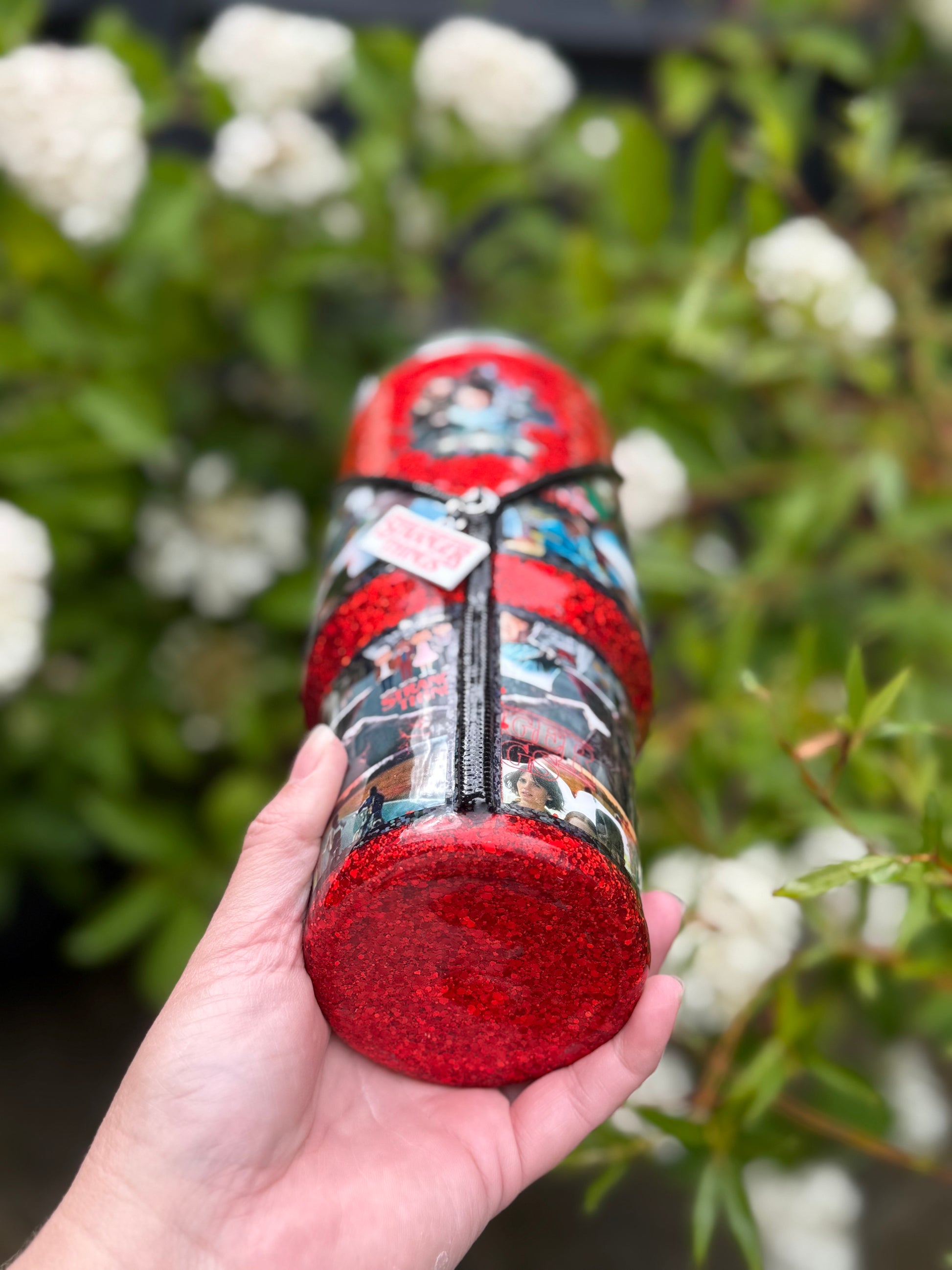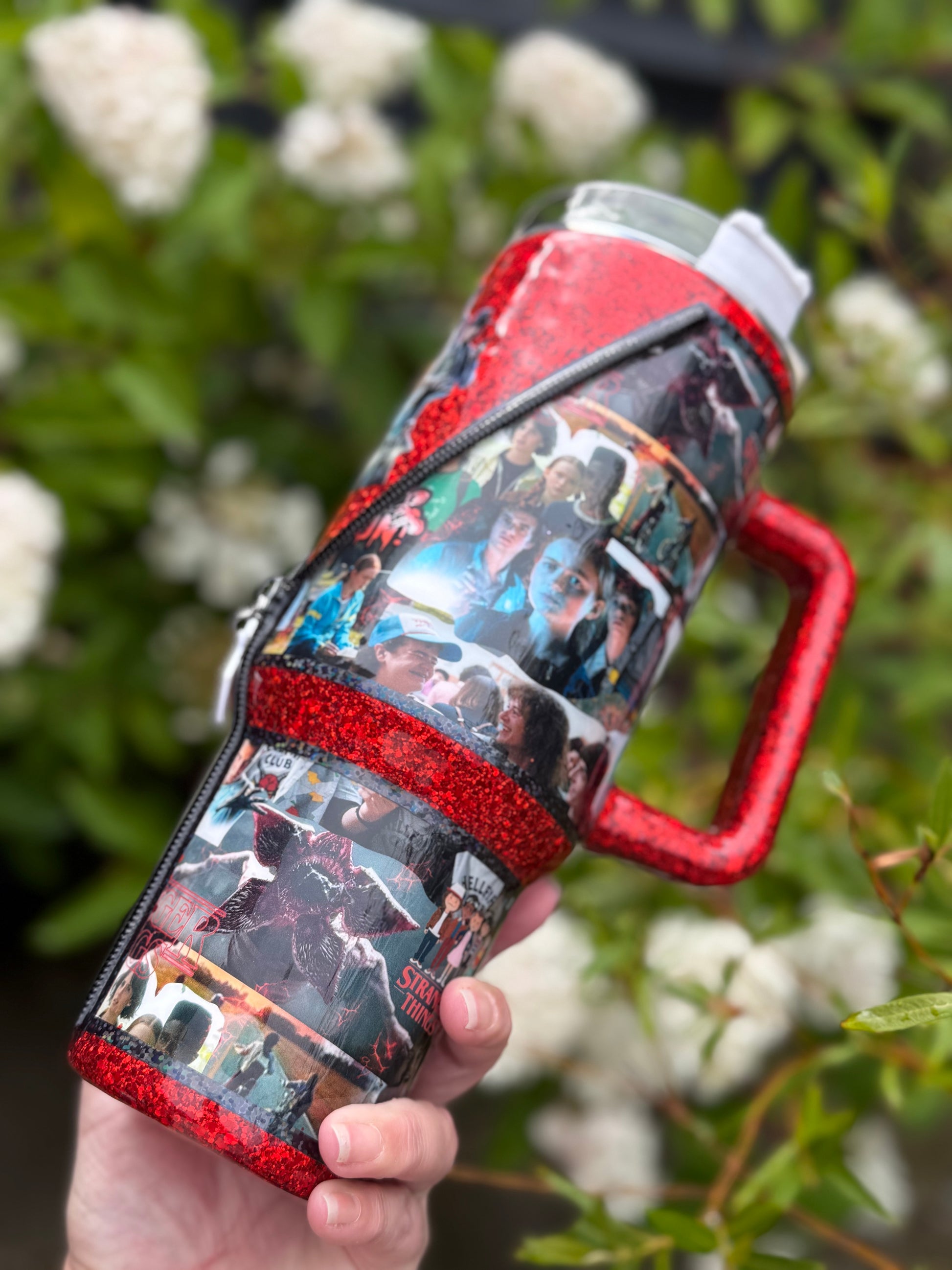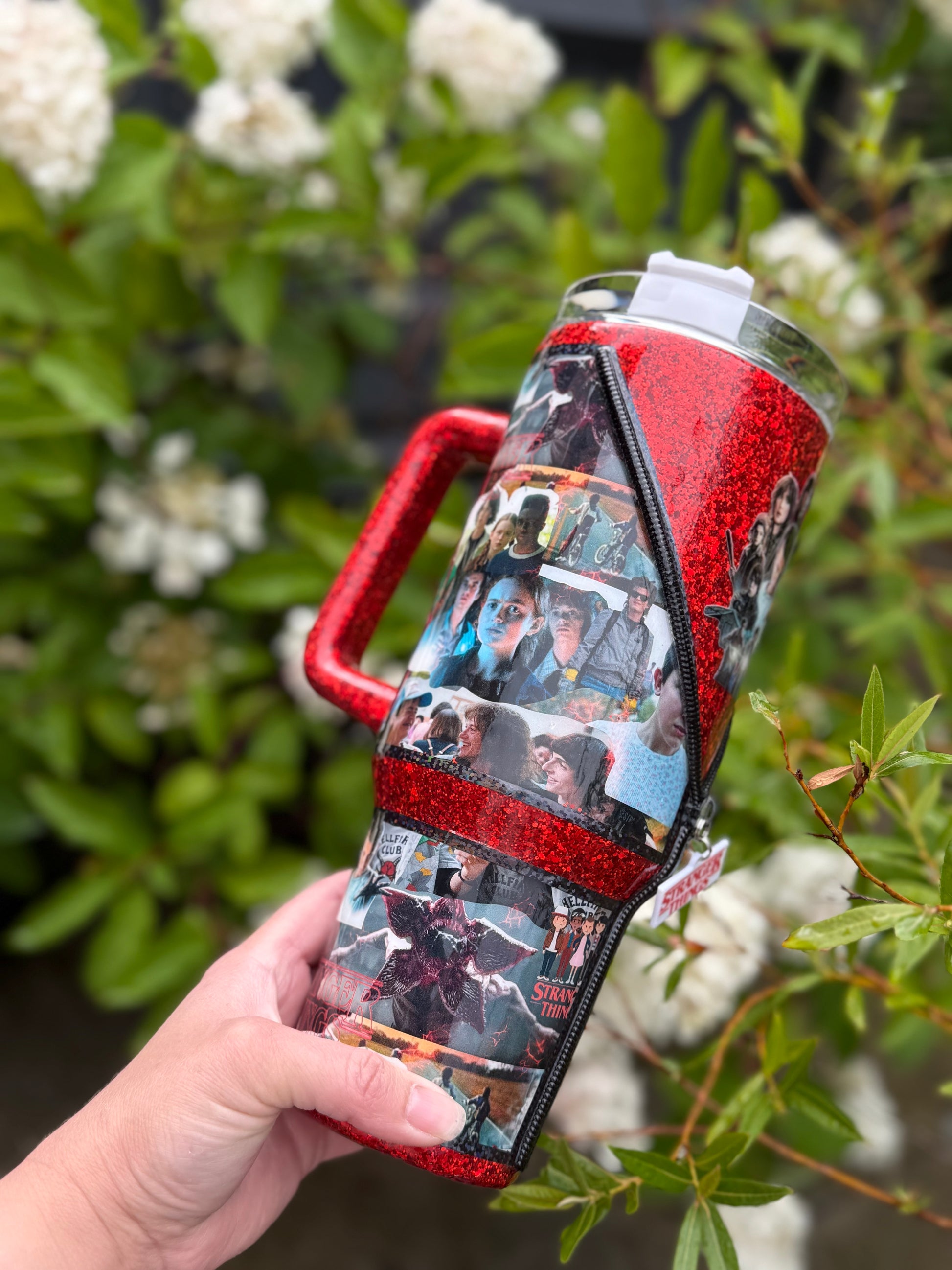 40oz stainless steel tumbler with Stranger Things zipper design and stunning matching glitter, all sealed with Hyperion for a beautiful shine, with added zip detail.