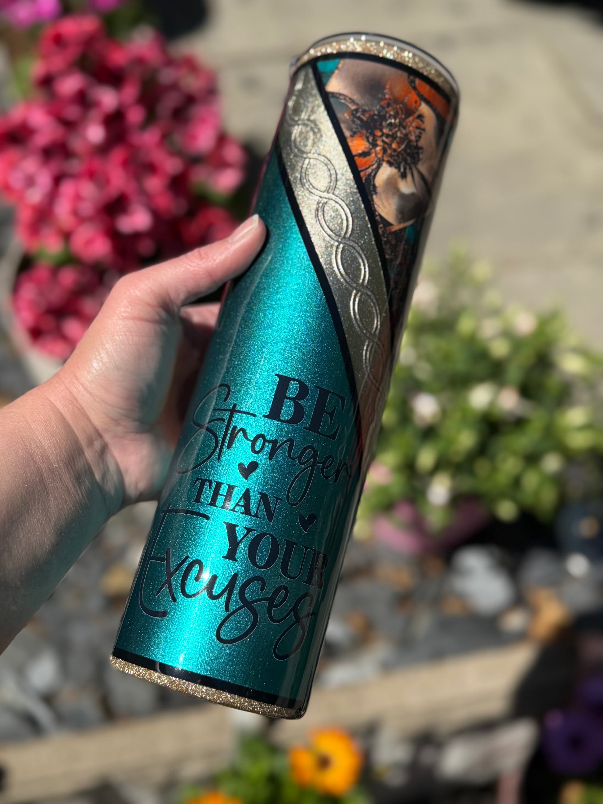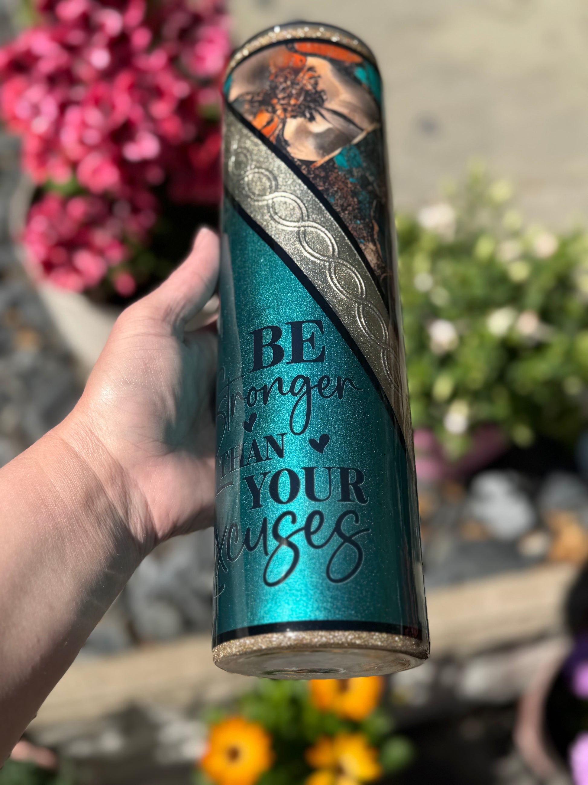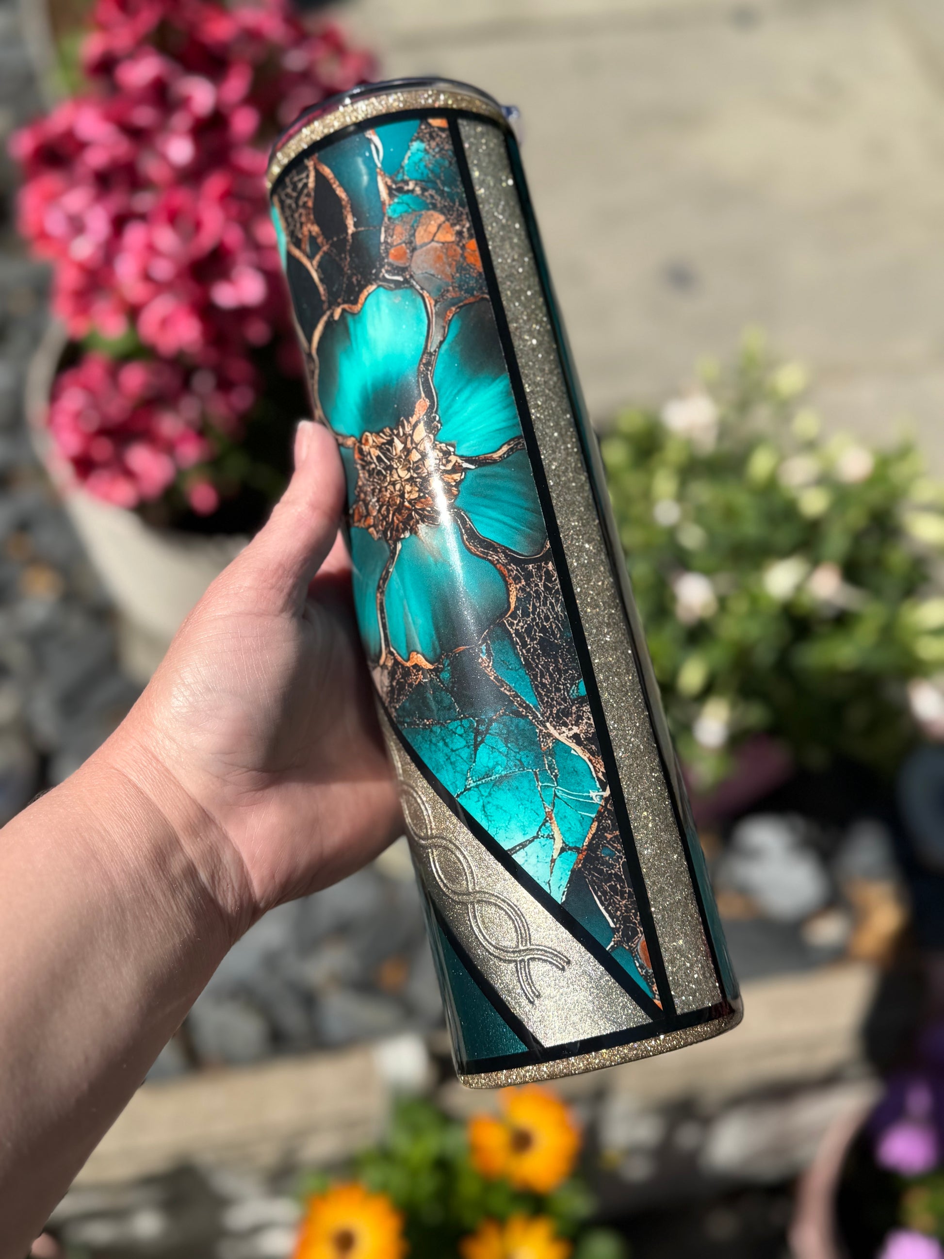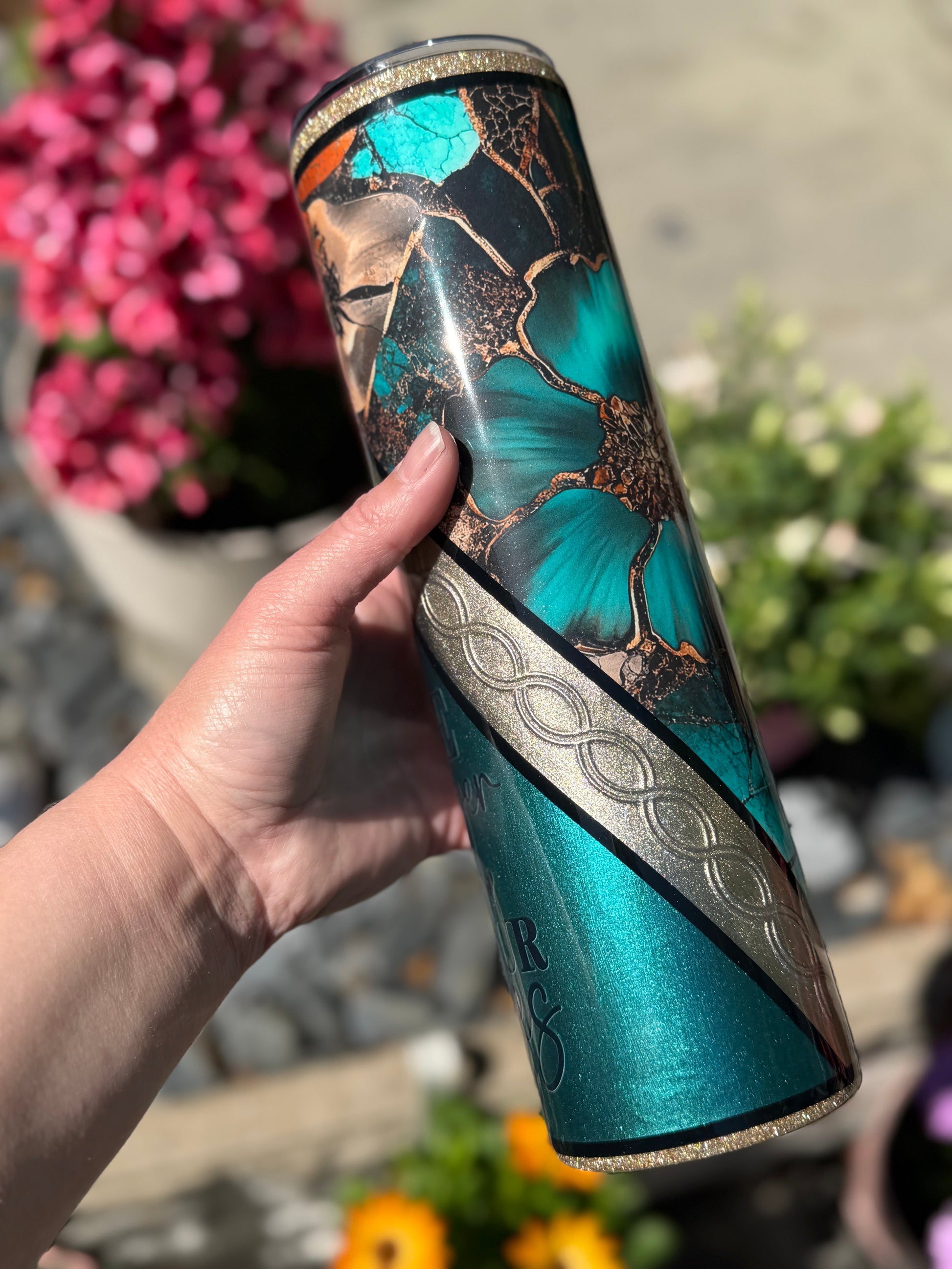 32oz stainless steel tumbler with floral design and stunning mixed media accents, all sealed with Hyperion for a beautiful glass like finish.