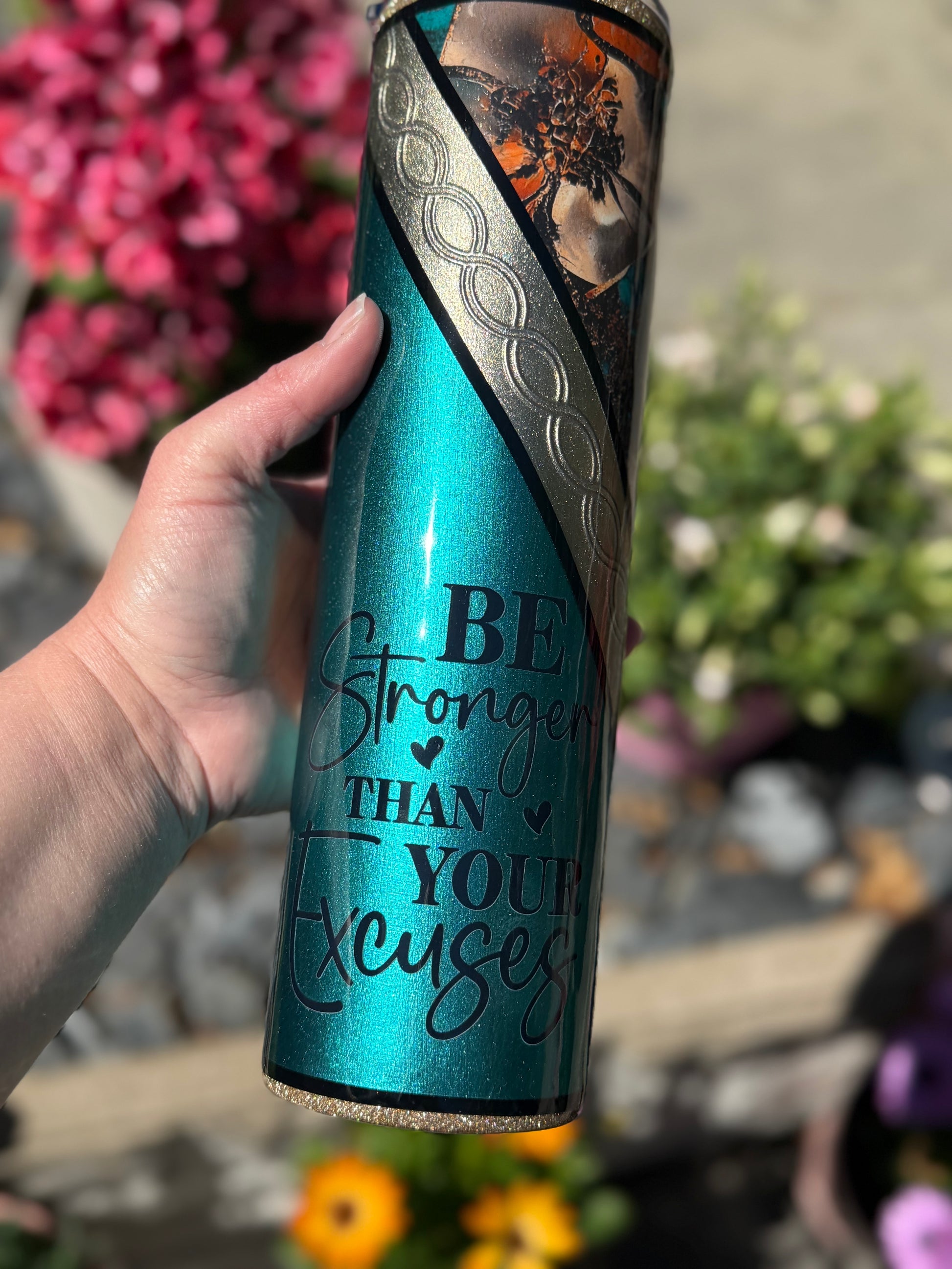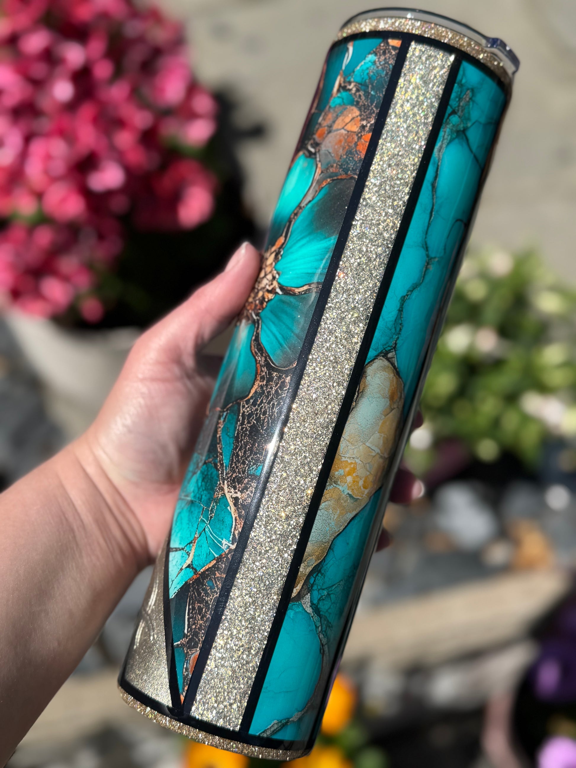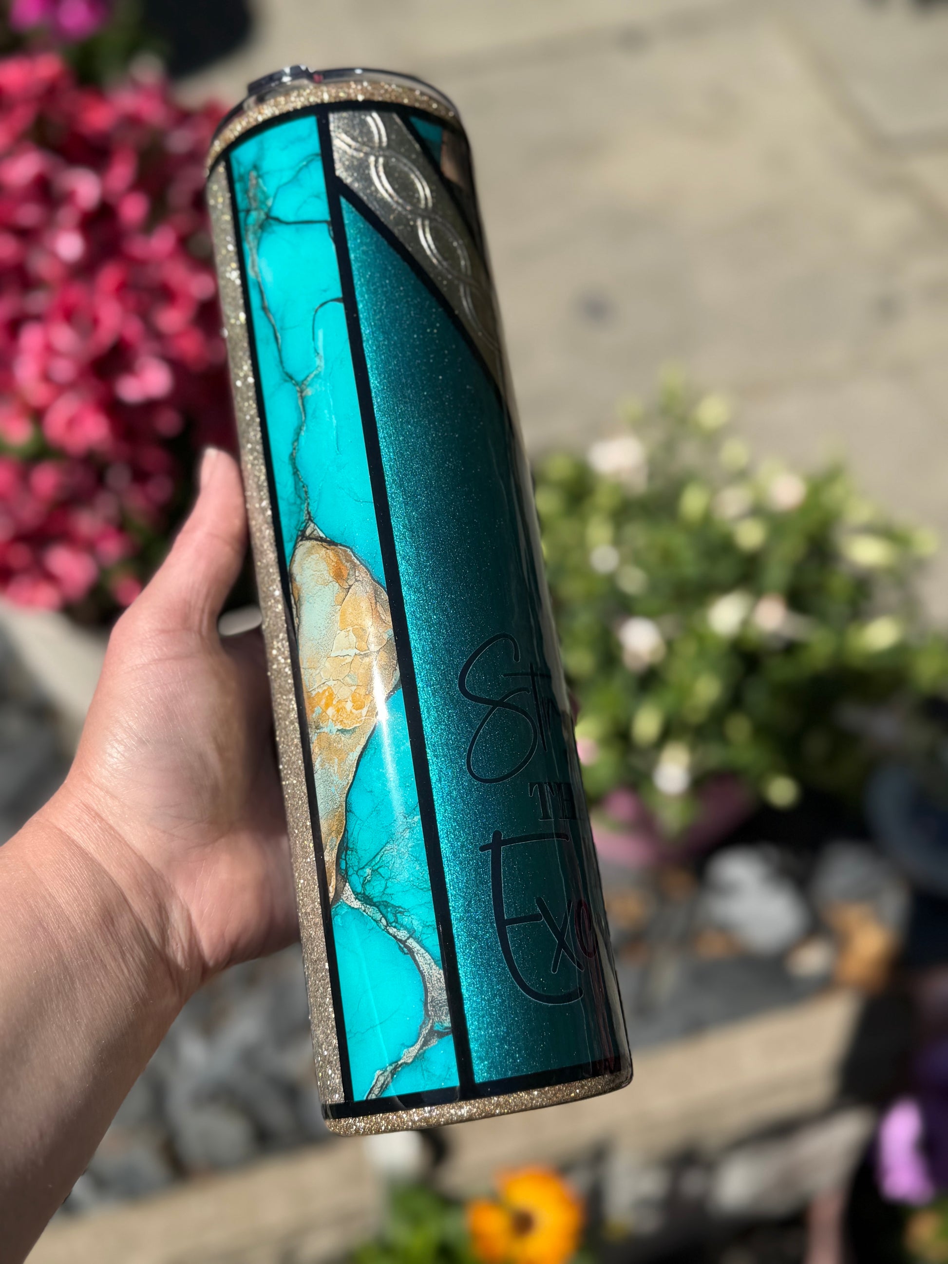32oz stainless steel tumbler with floral design and stunning mixed media accents, all sealed with Hyperion for a beautiful glass like finish.