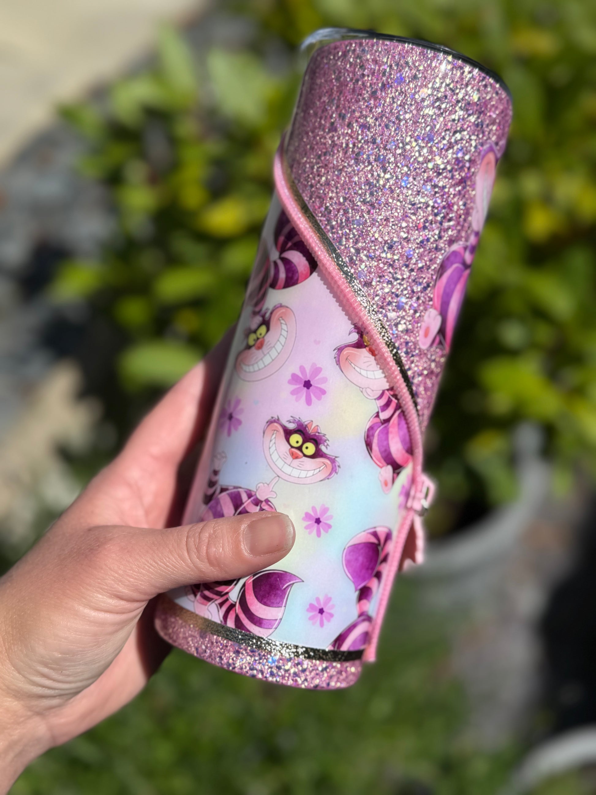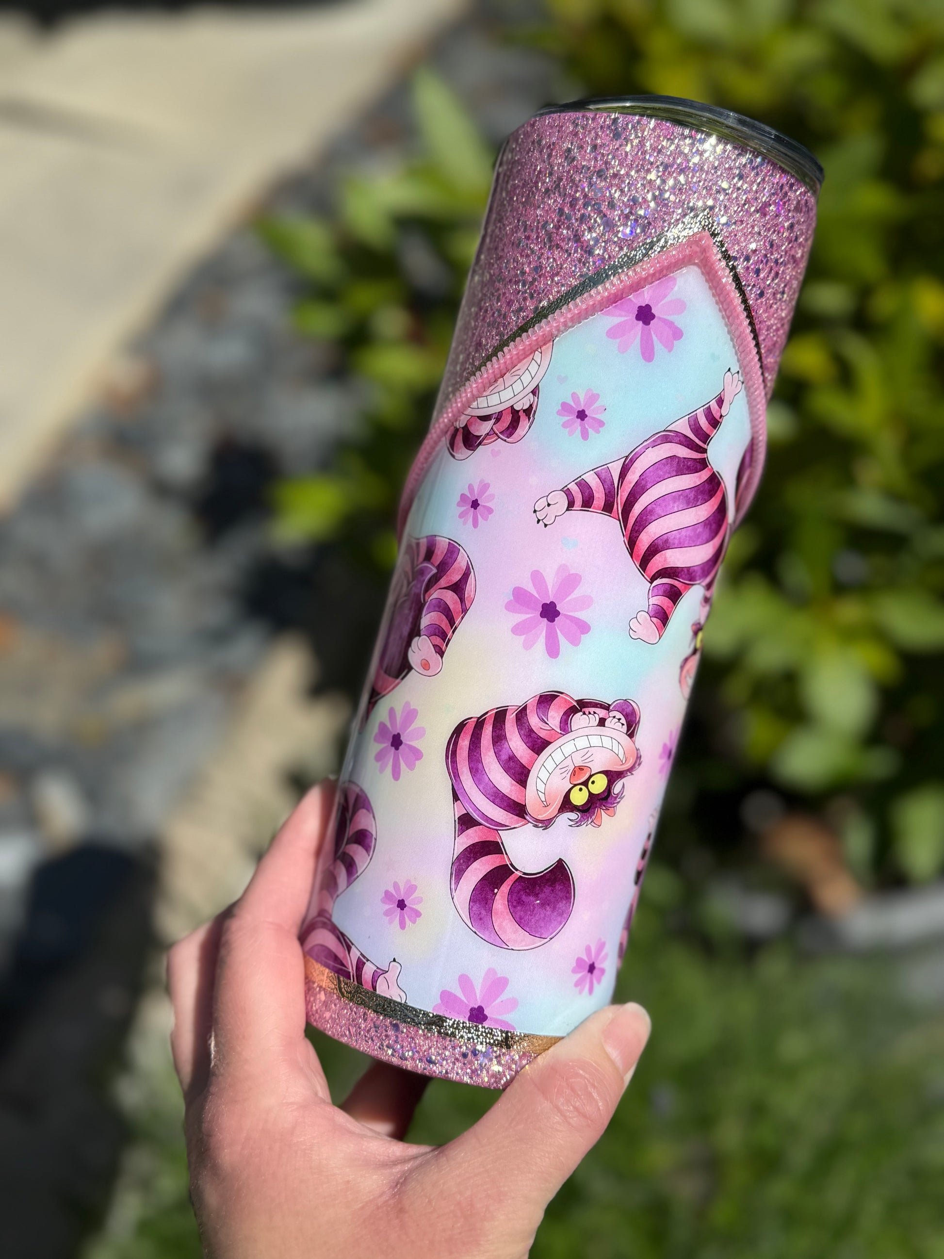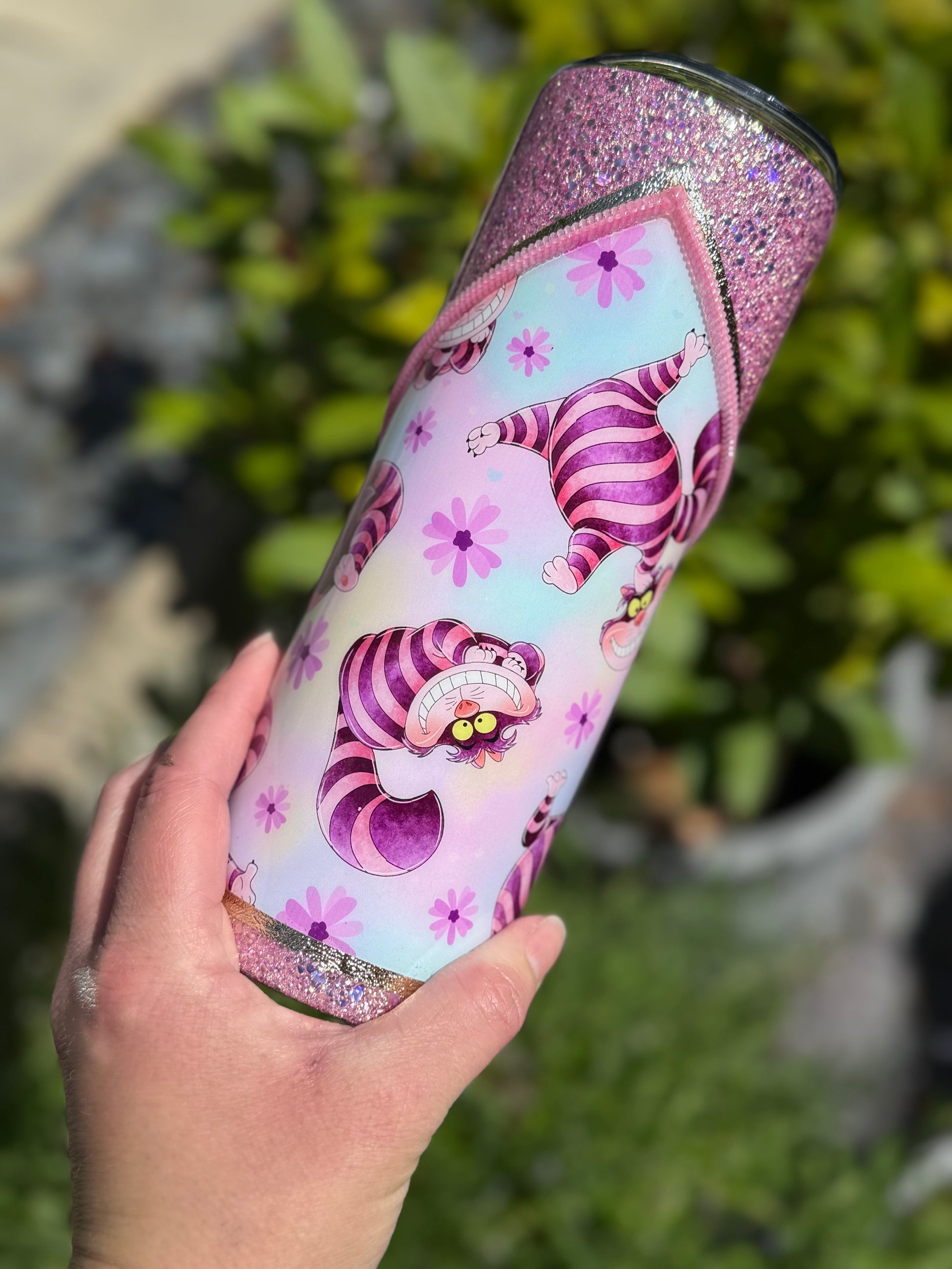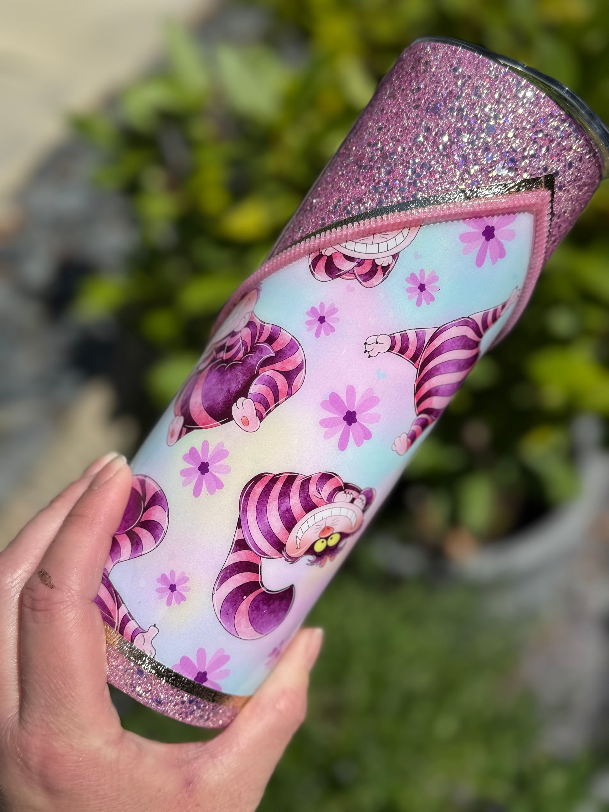 20oz stainless steel tumbler with Cheshire Cat vinyl and stunning pink glitter all sealed in Hyperion for a beautiful glass like finish.