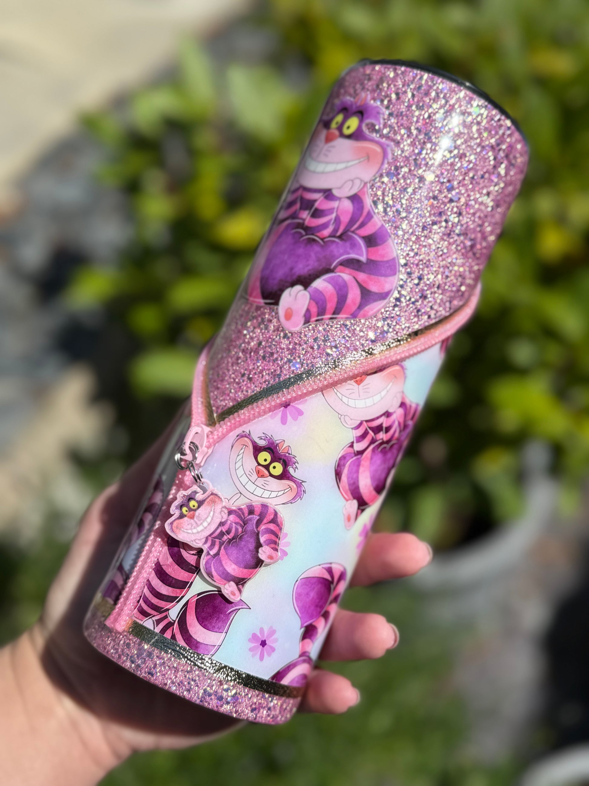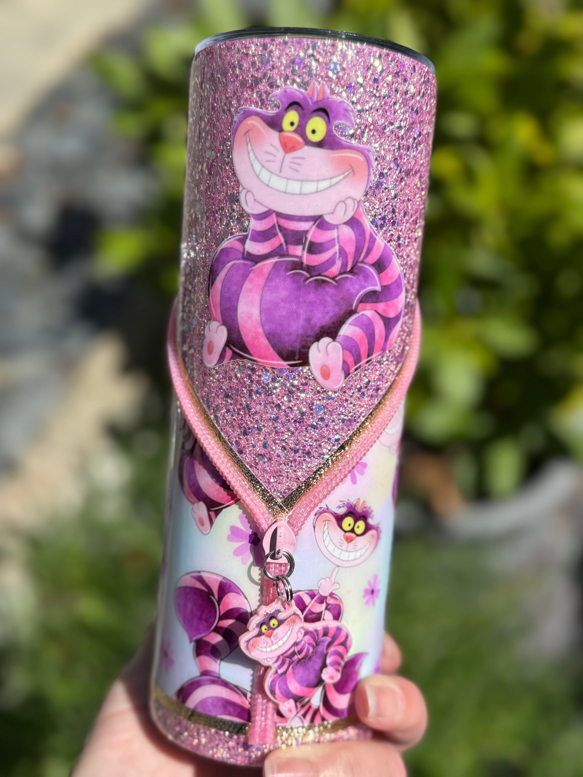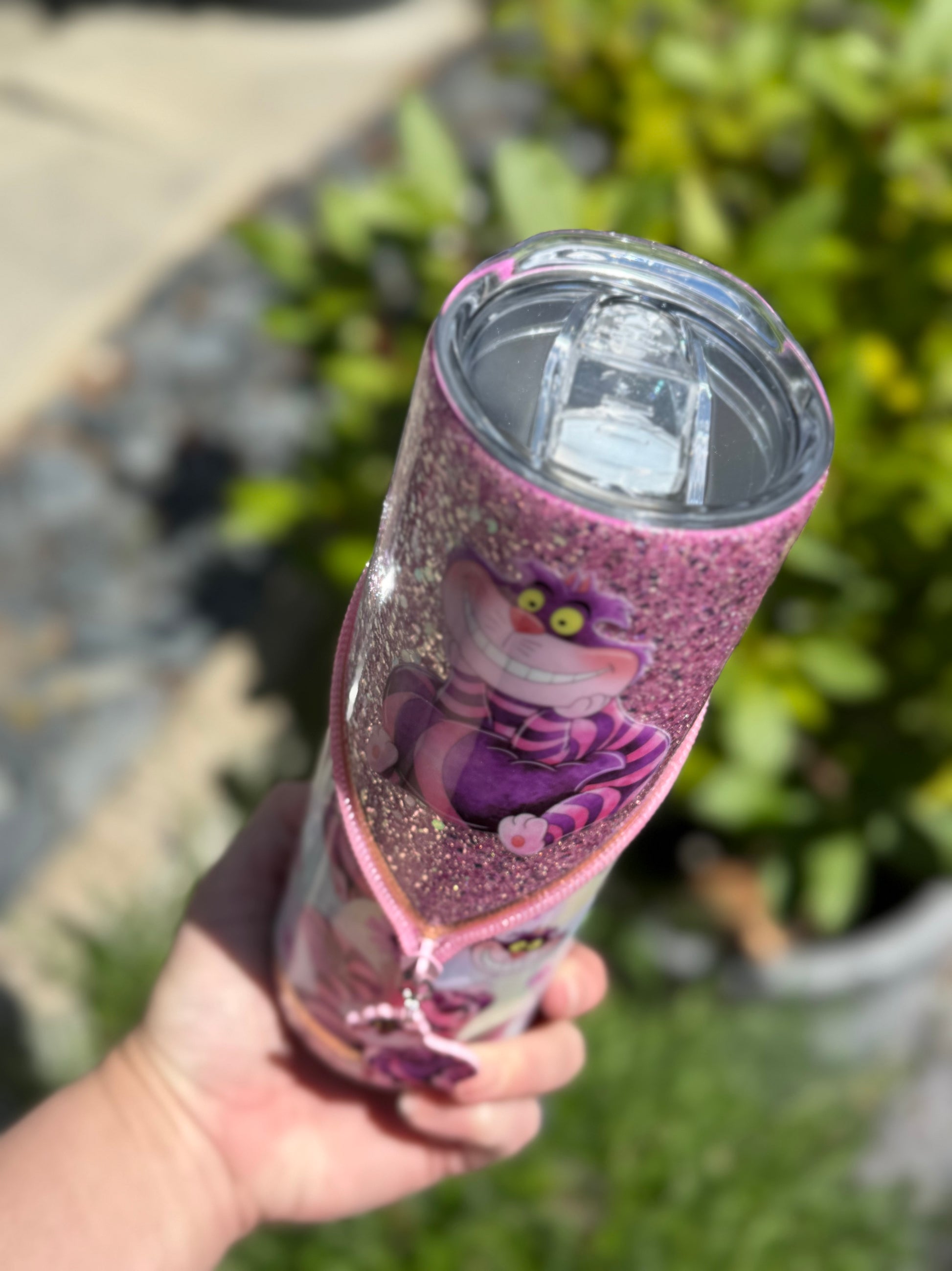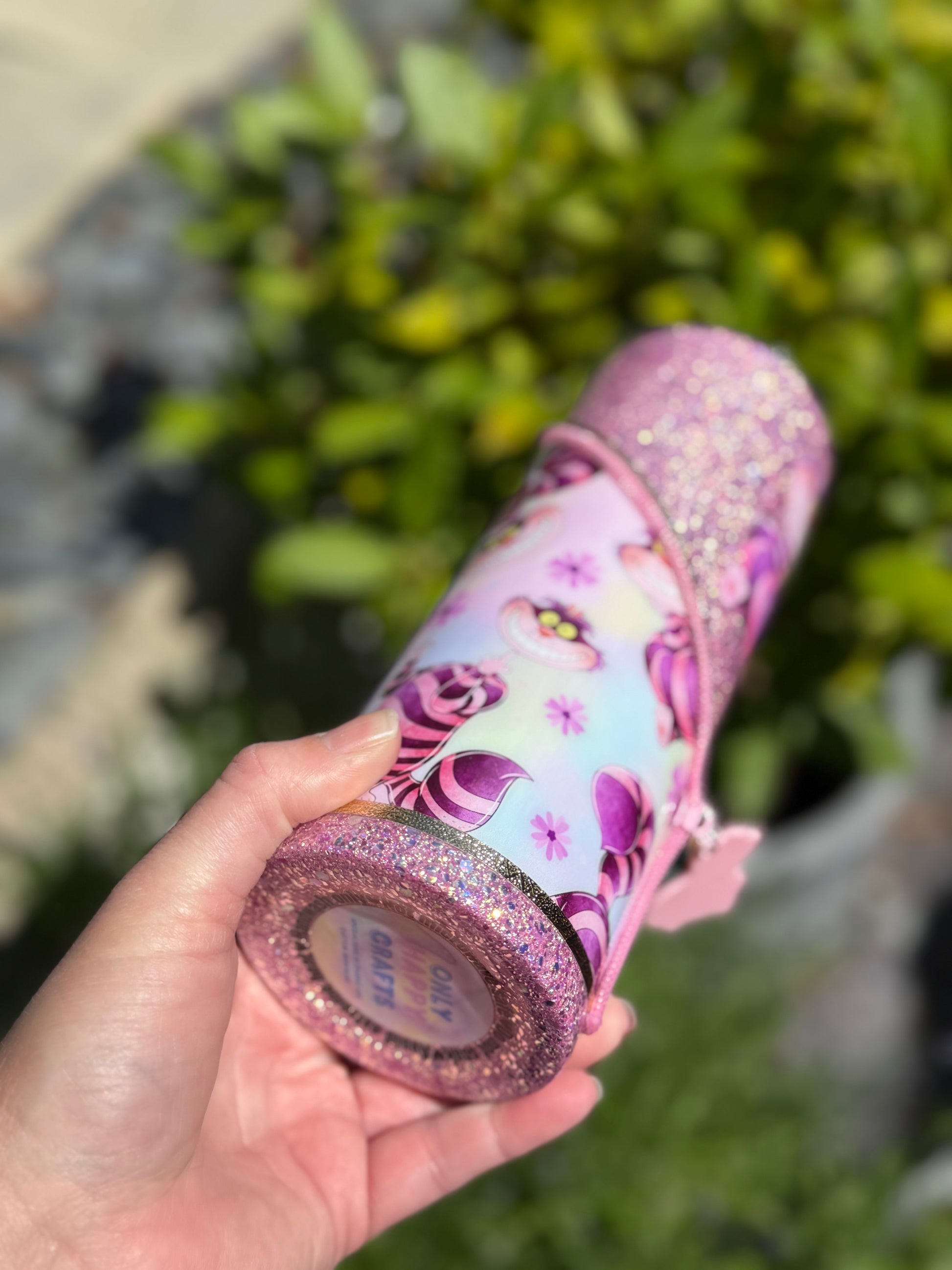 20oz stainless steel tumbler with Cheshire Cat vinyl and stunning pink glitter all sealed in Hyperion for a beautiful glass like finish.