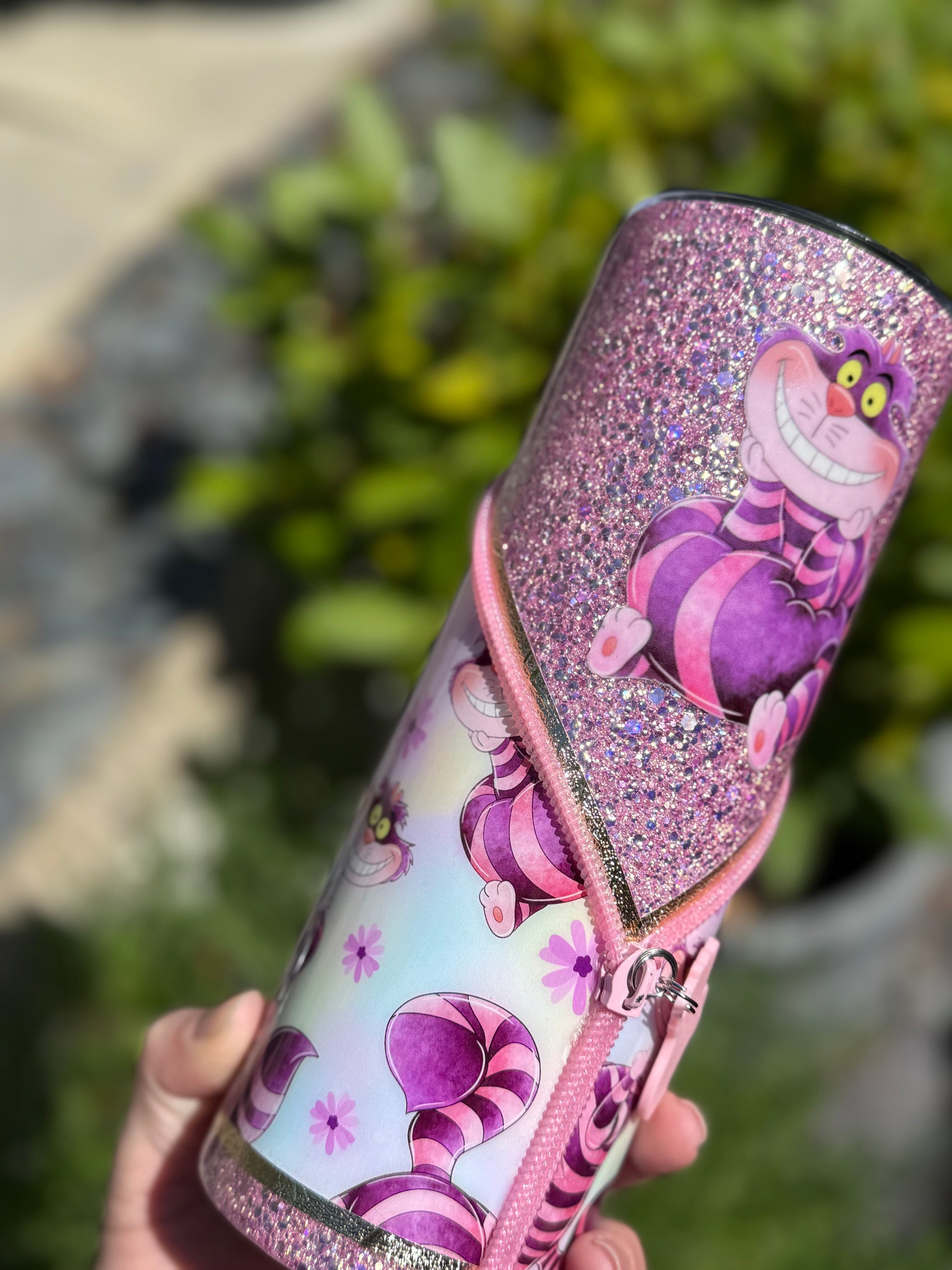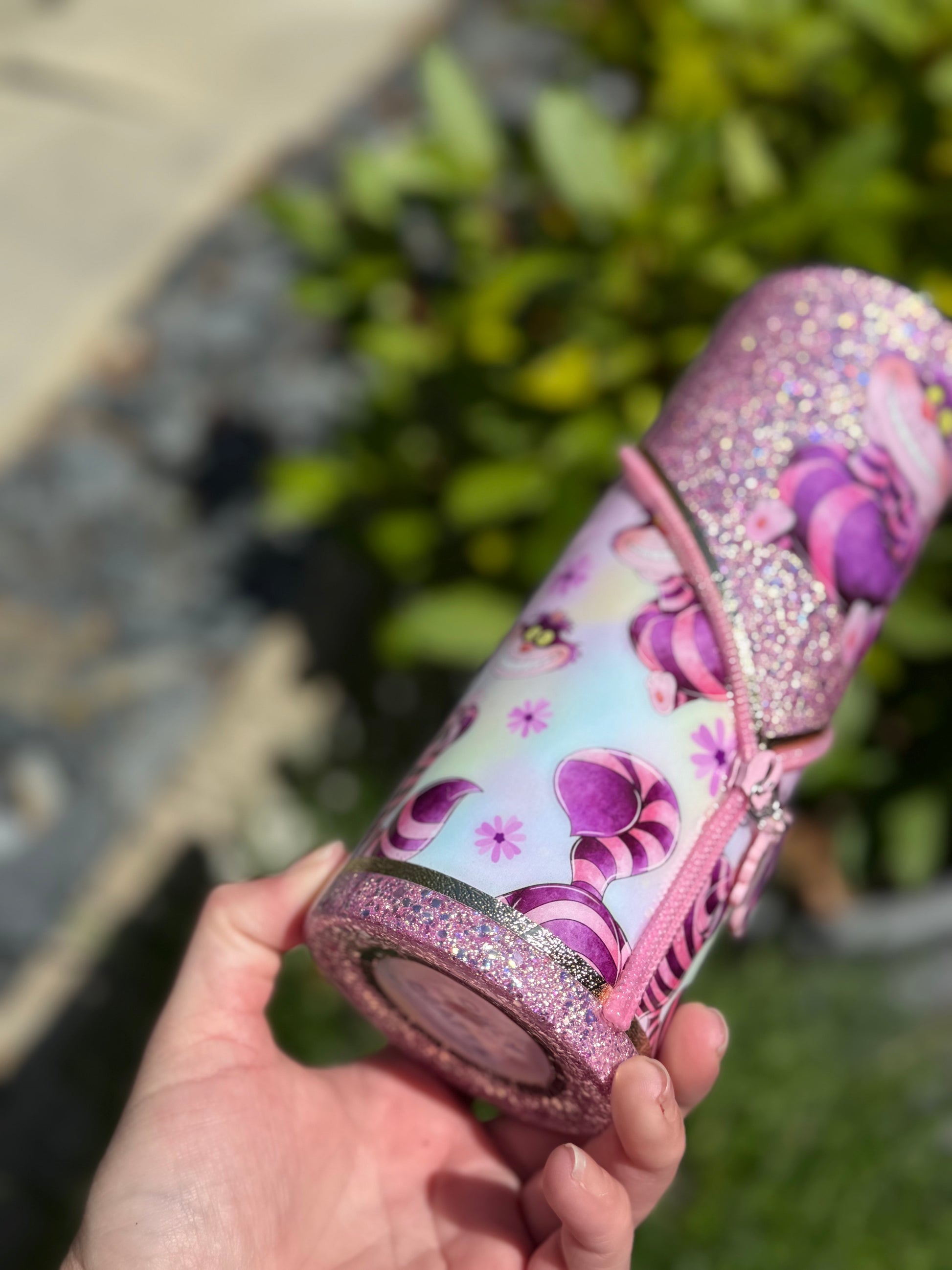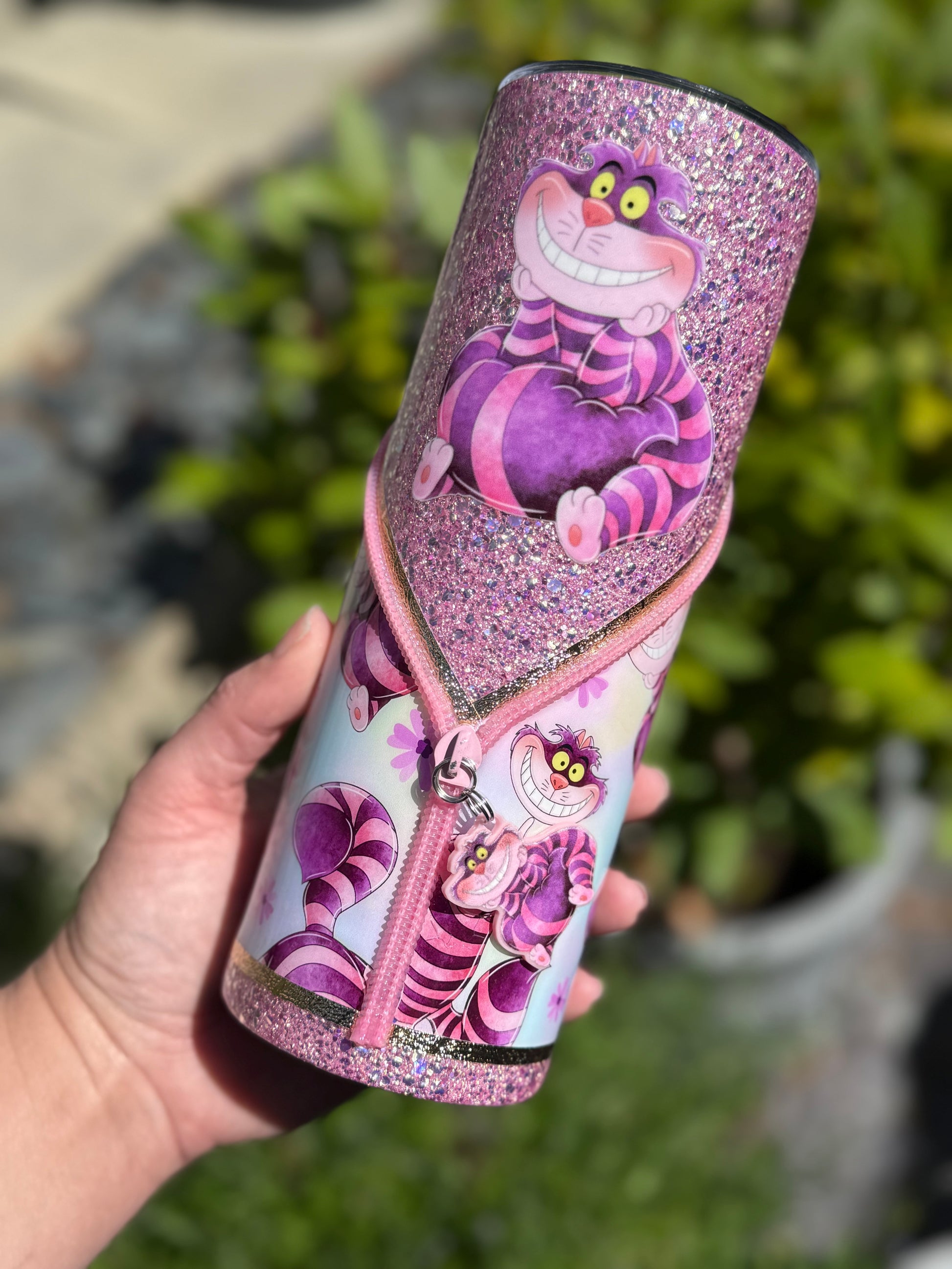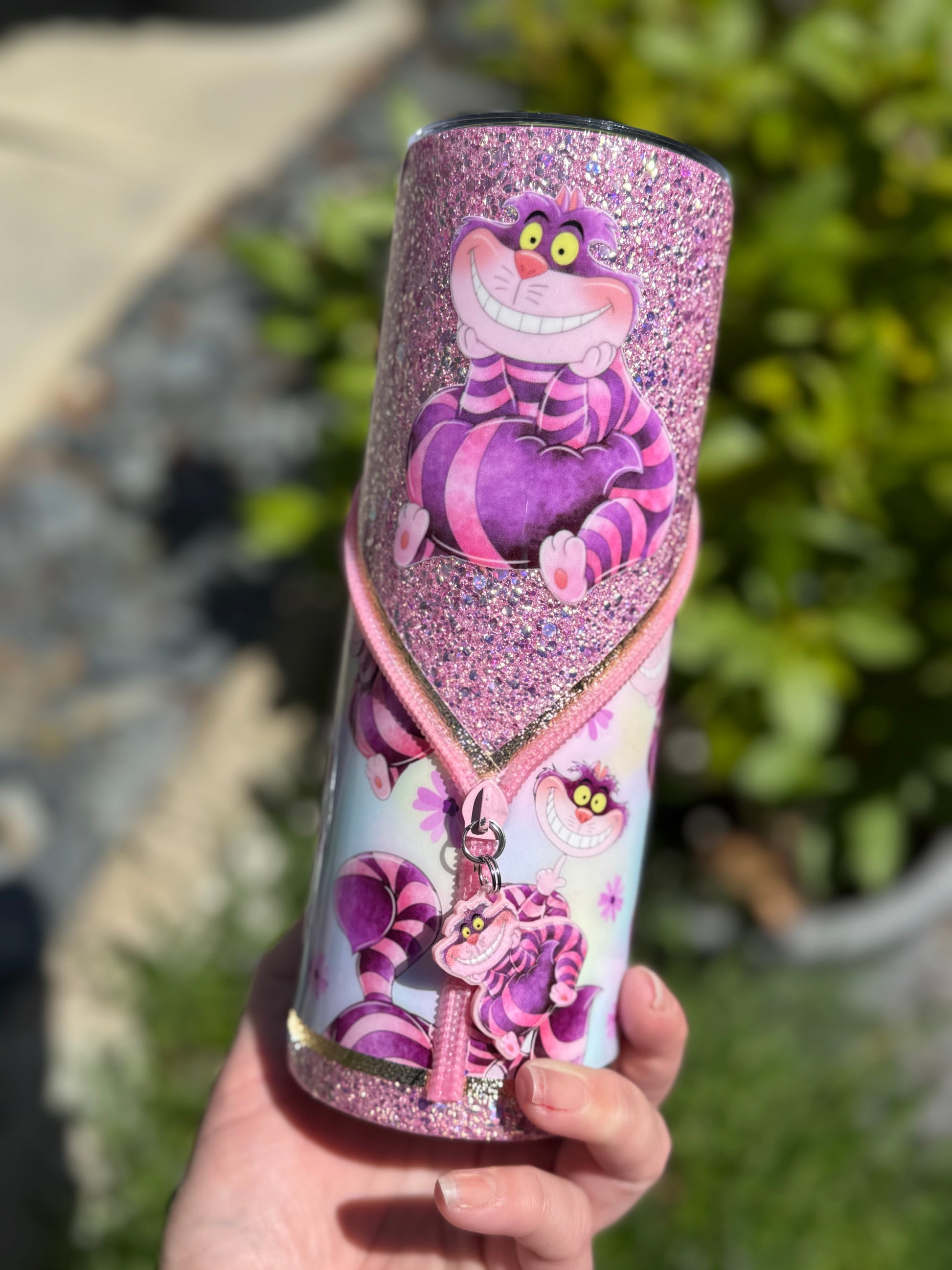 20oz stainless steel tumbler with Cheshire Cat vinyl and stunning pink glitter all sealed in Hyperion for a beautiful glass like finish.
