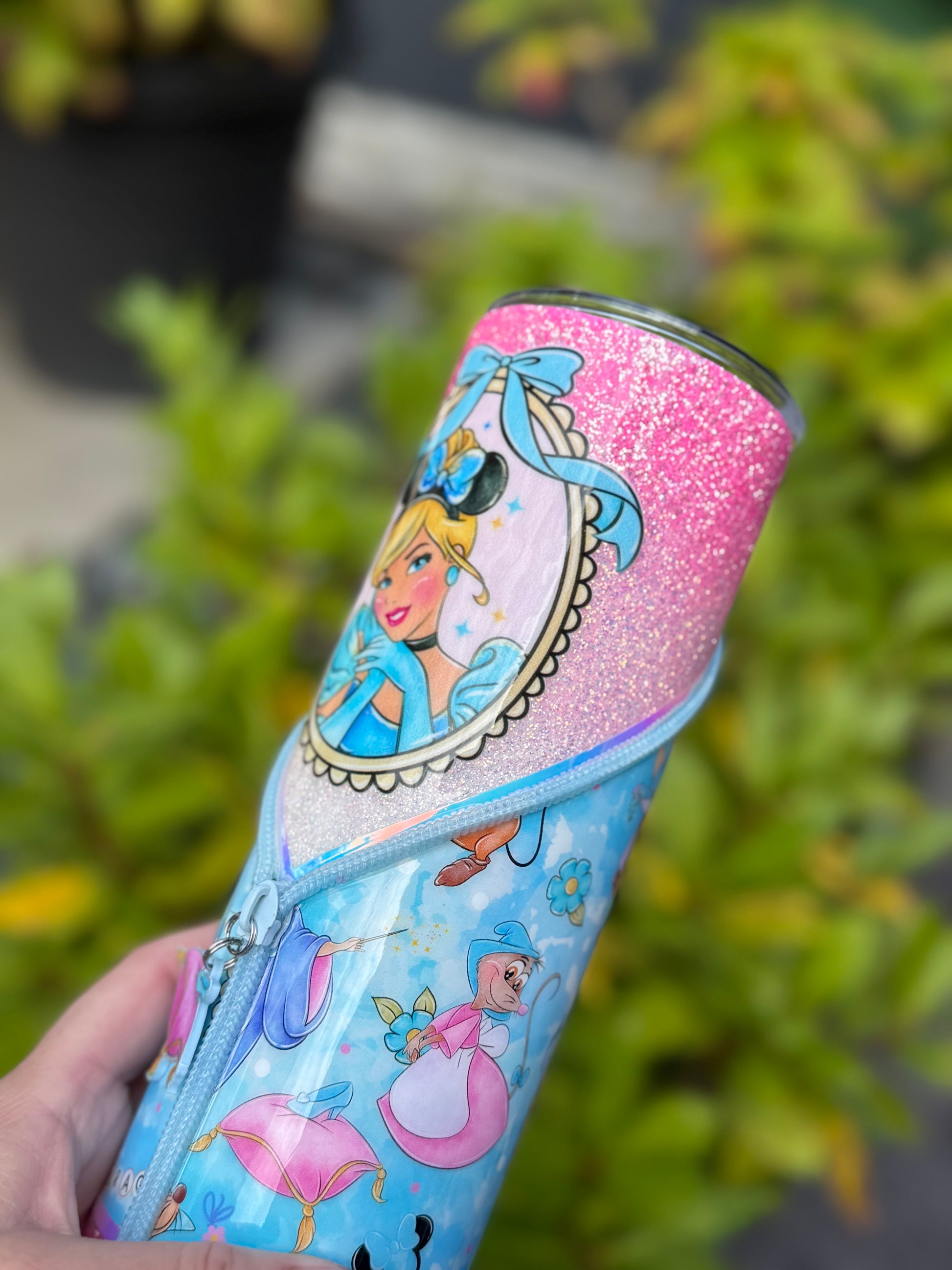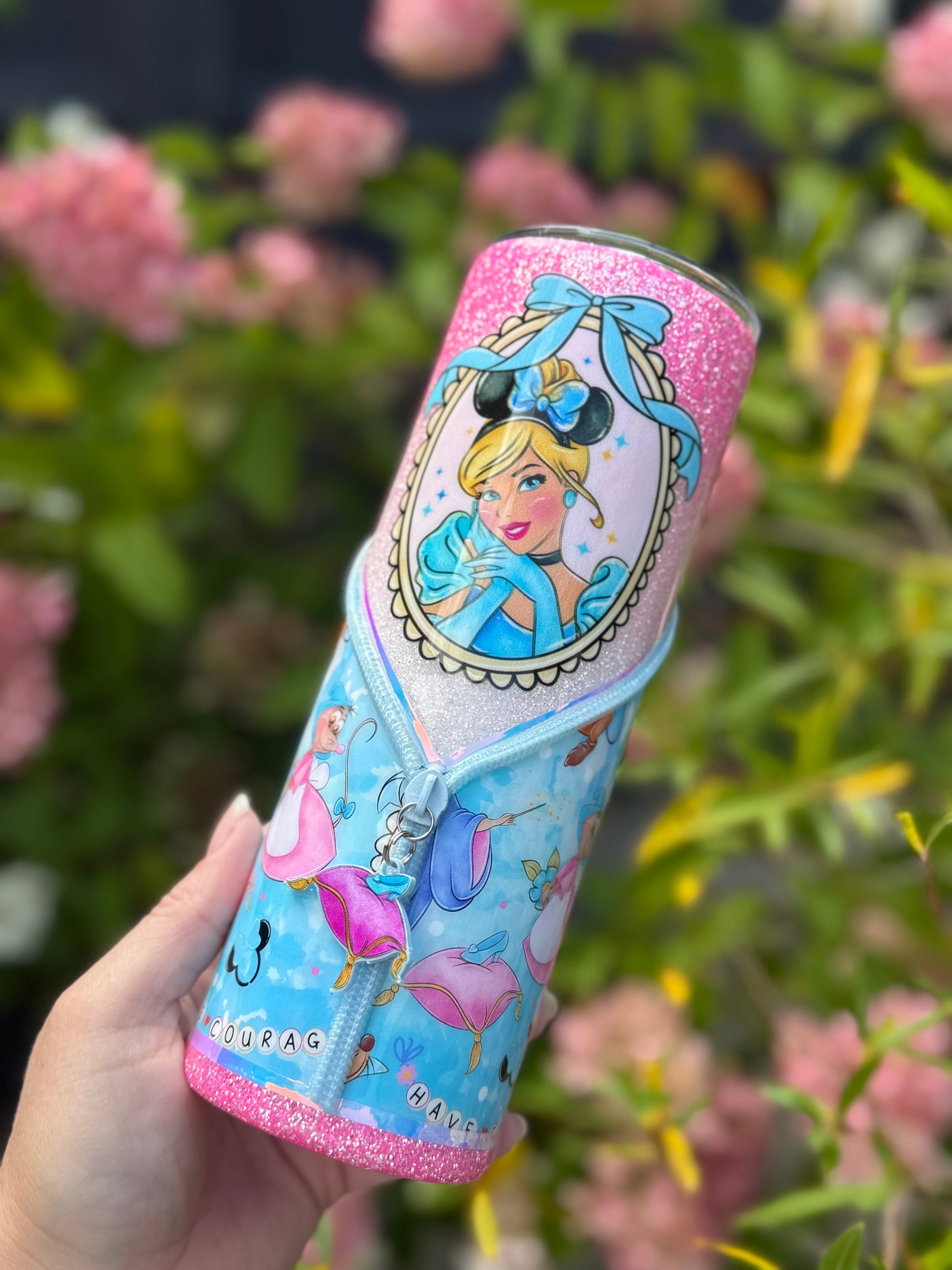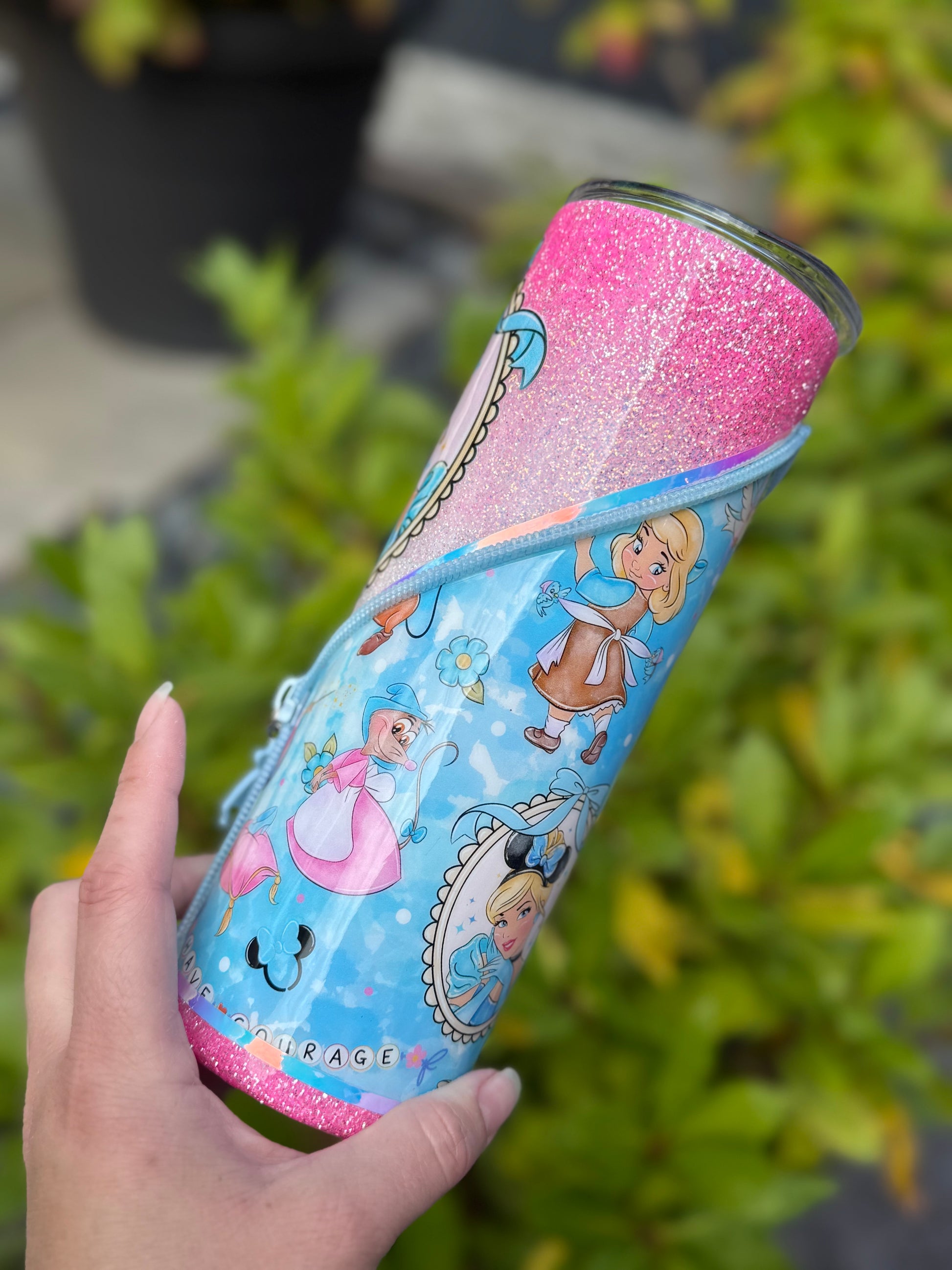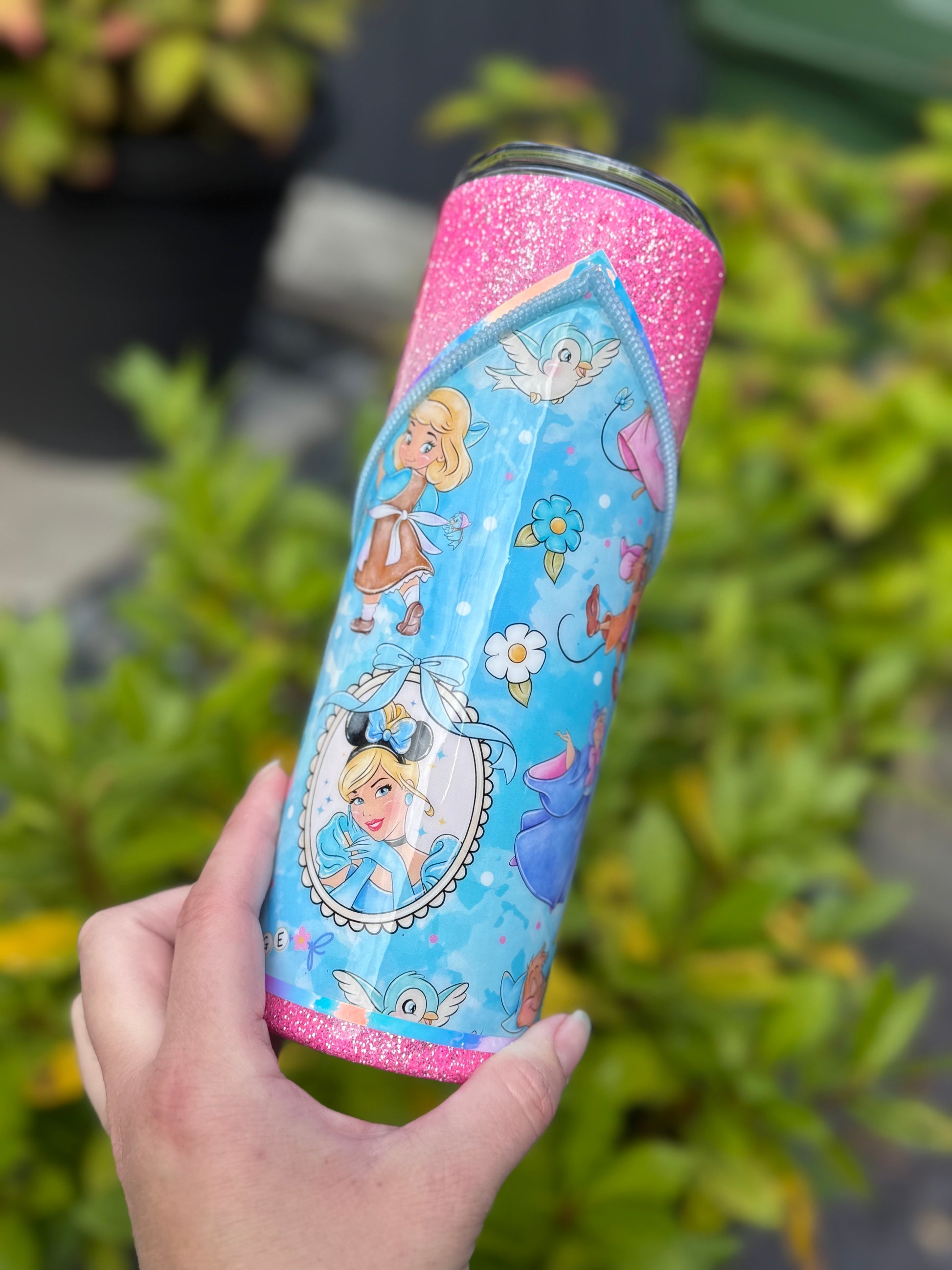20oz zipper tumbler with Cinderella design and stunning pink ombré glitter detail, all sealed with Hyperion for that glass like finish!!