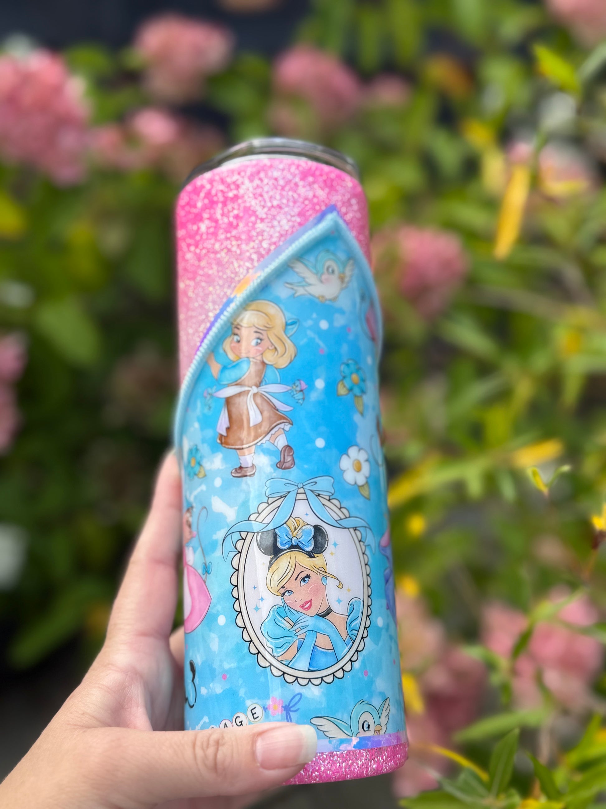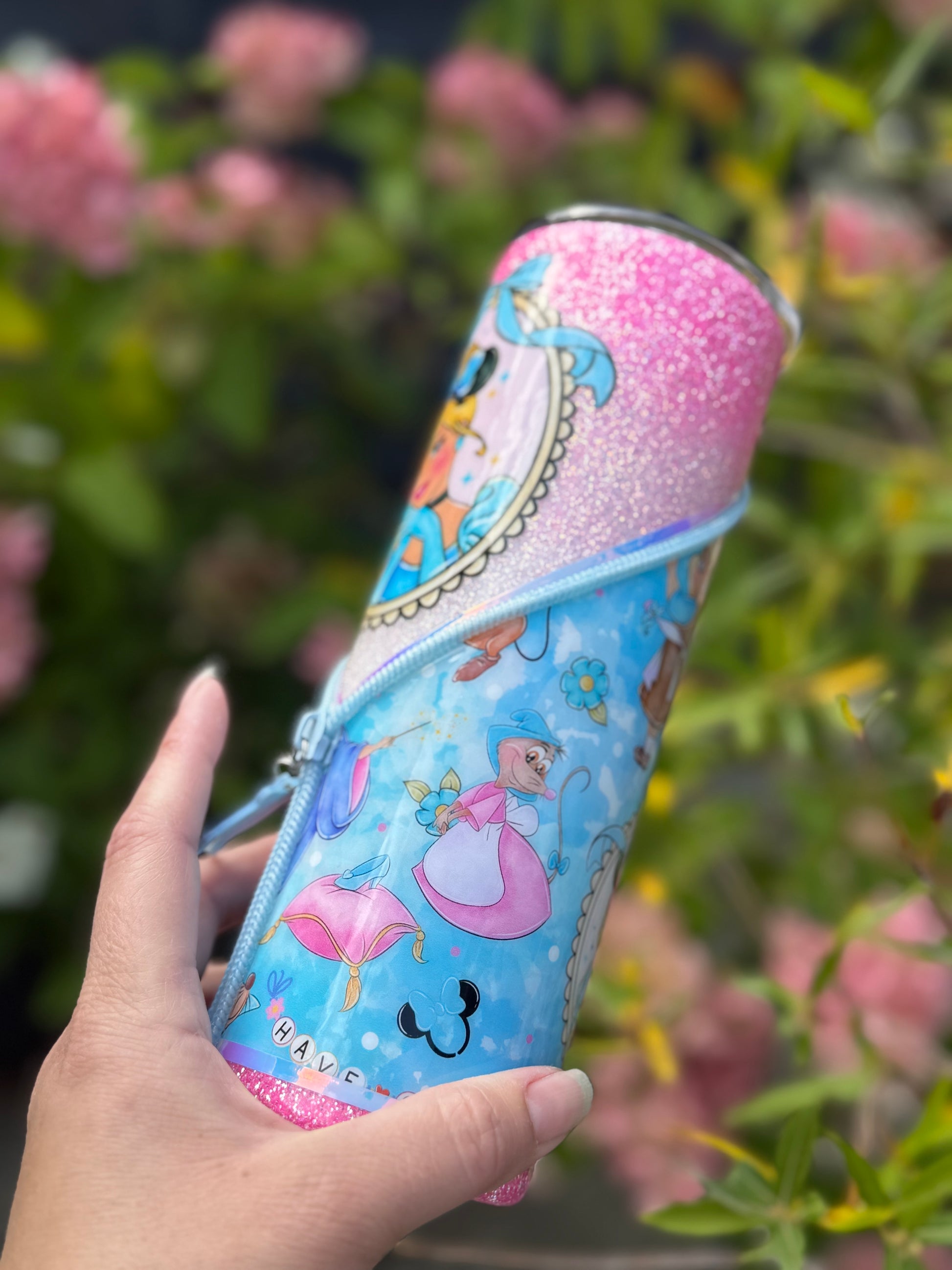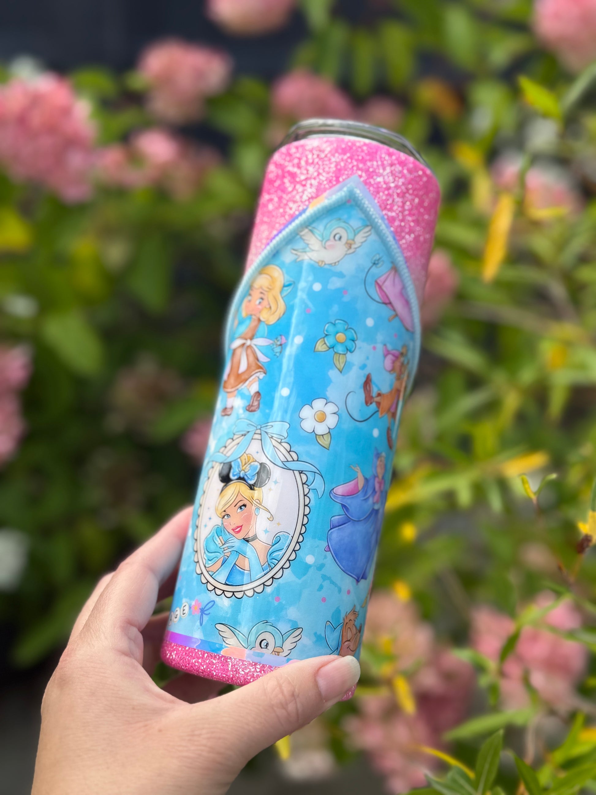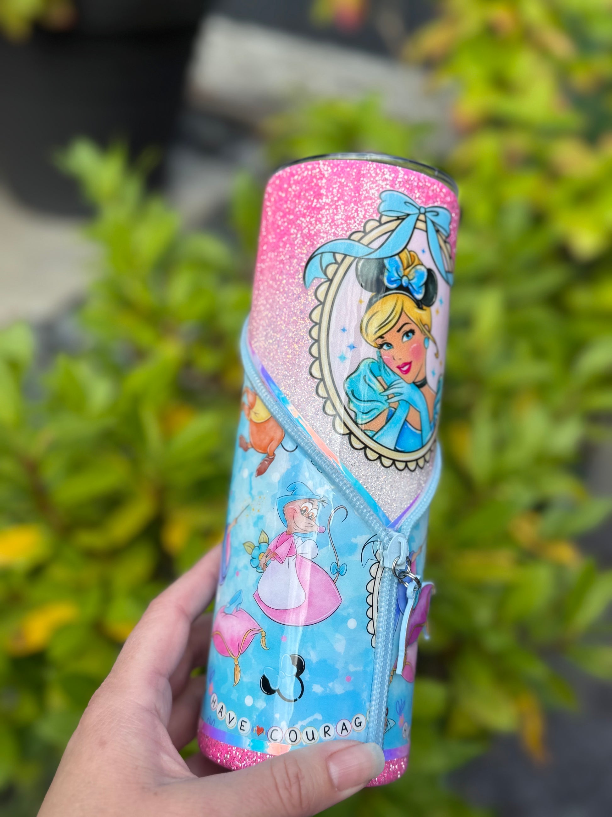 20oz zipper tumbler with Cinderella design and stunning pink ombré glitter detail, all sealed with Hyperion for that glass like finish!!