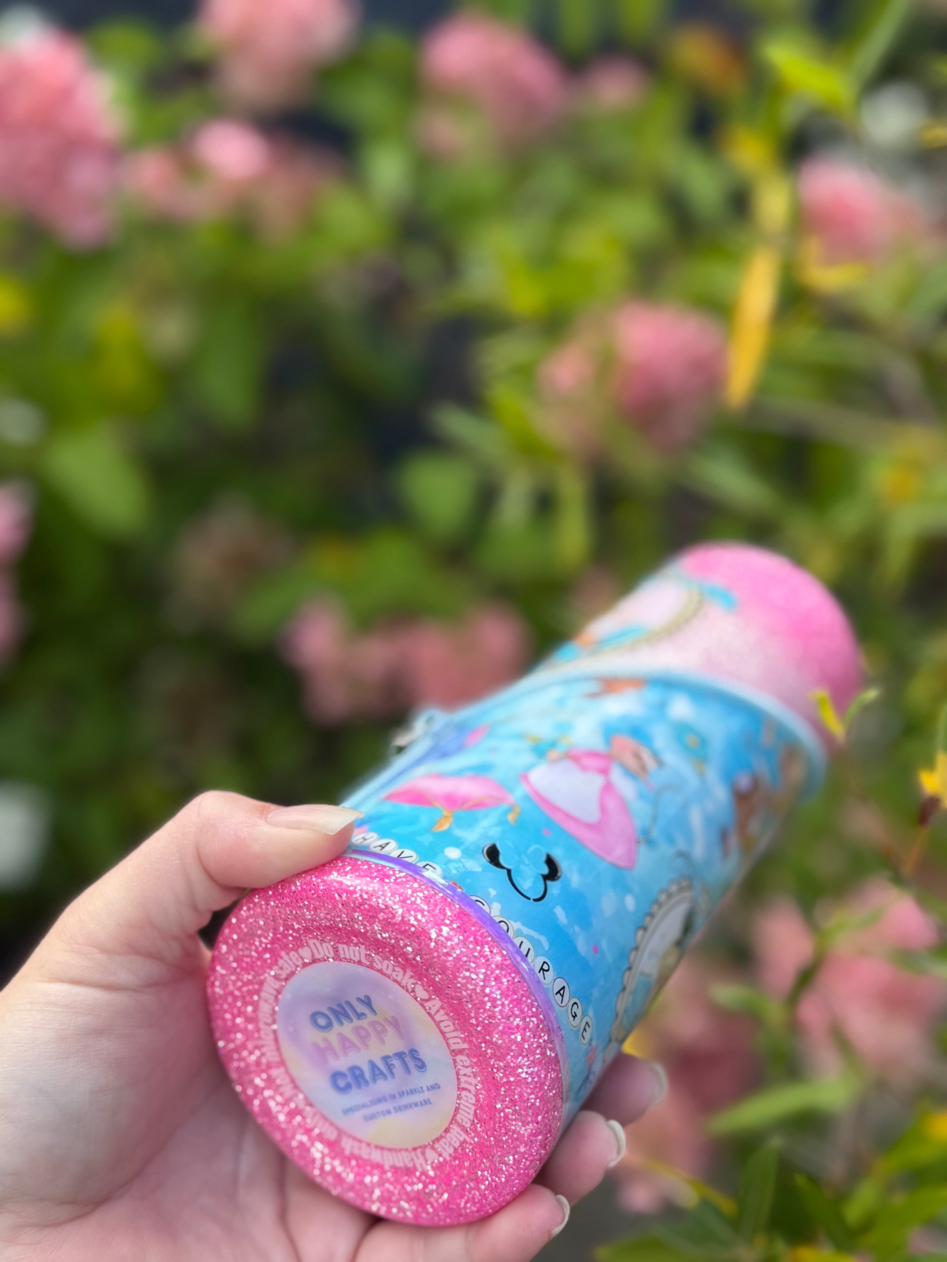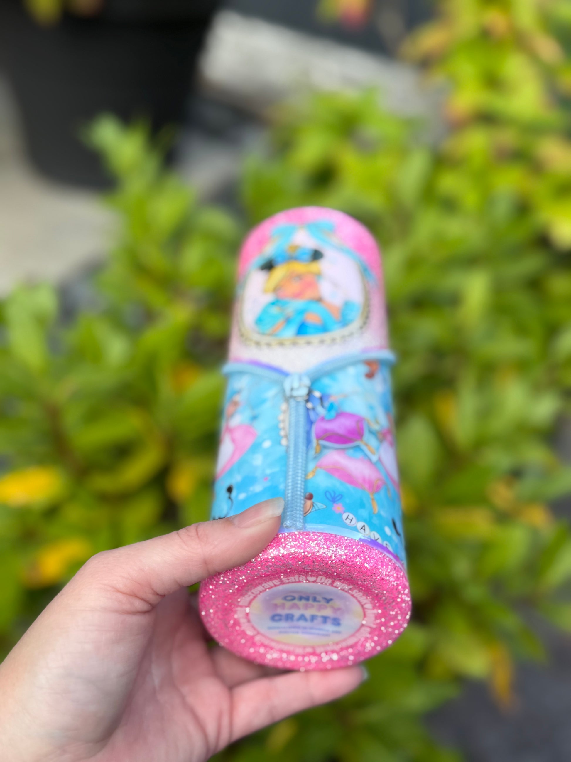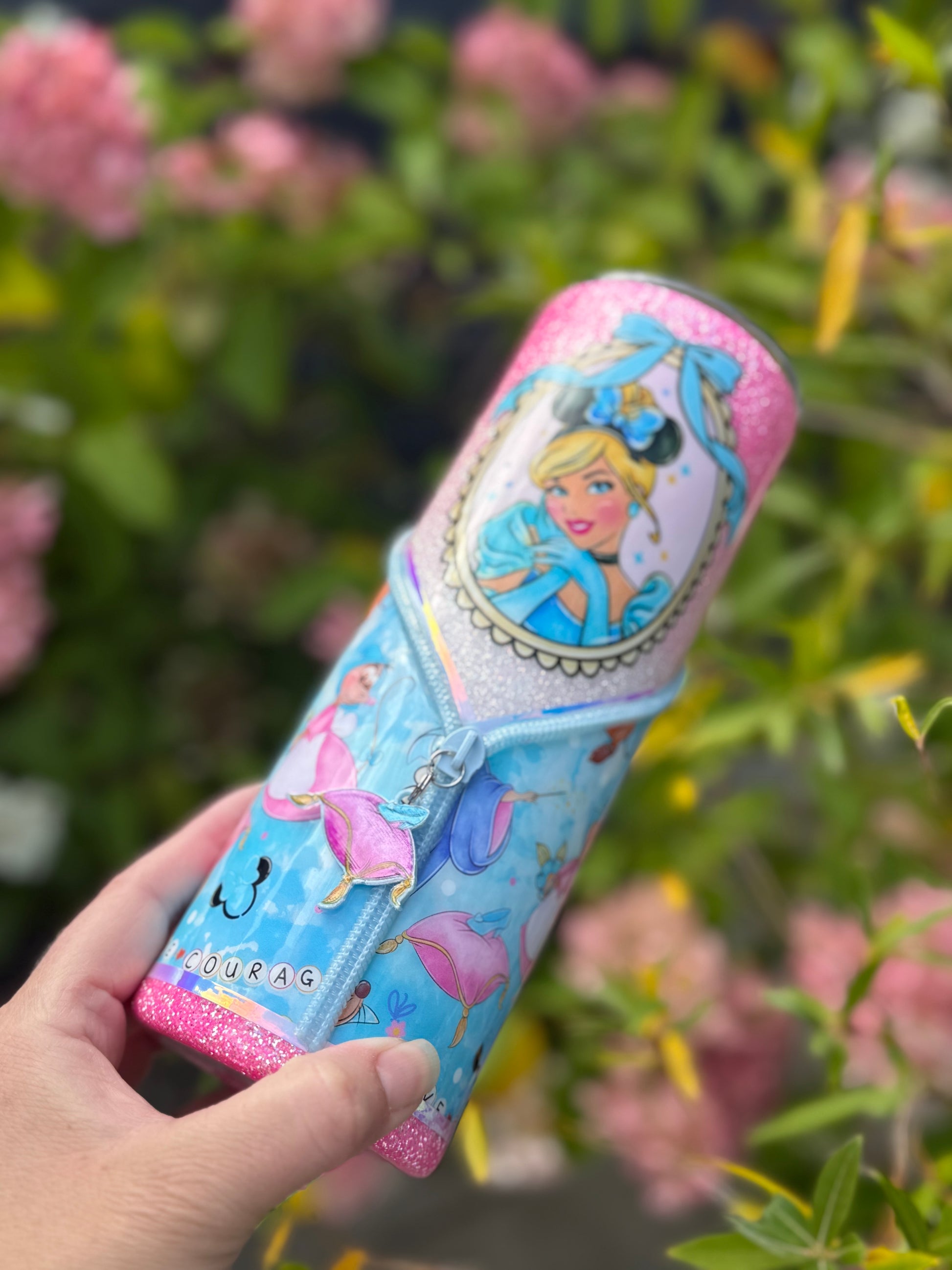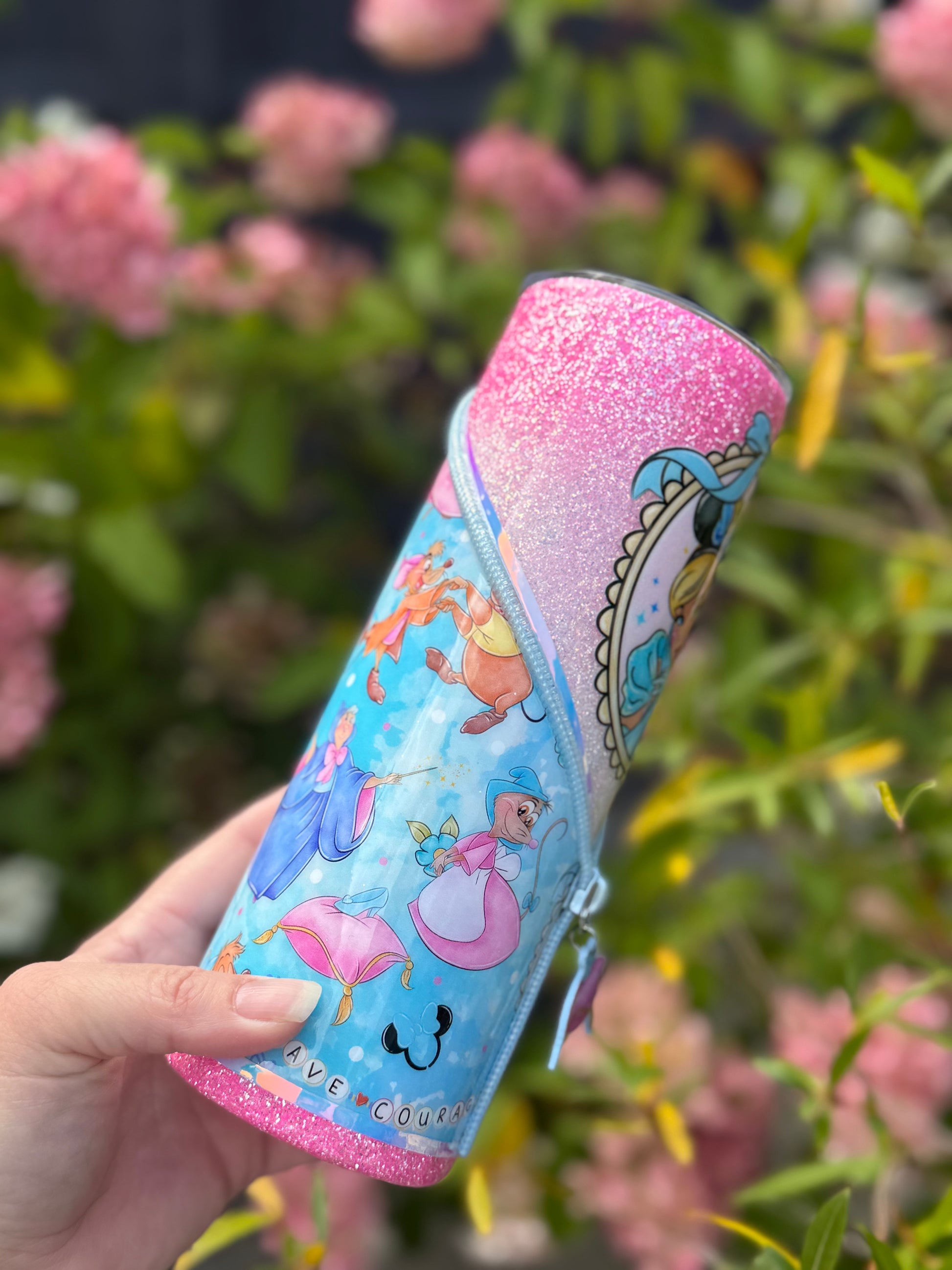 20oz zipper tumbler with Cinderella design and stunning pink ombré glitter detail, all sealed with Hyperion for that glass like finish!!