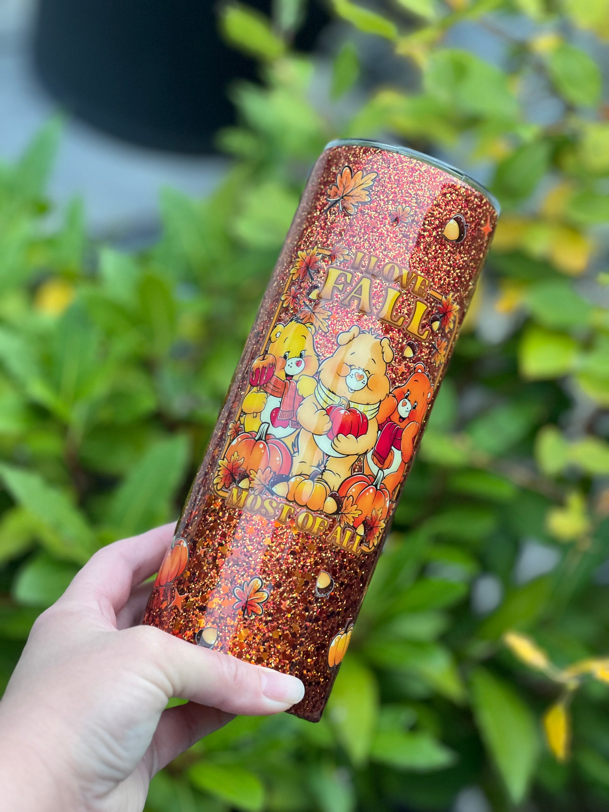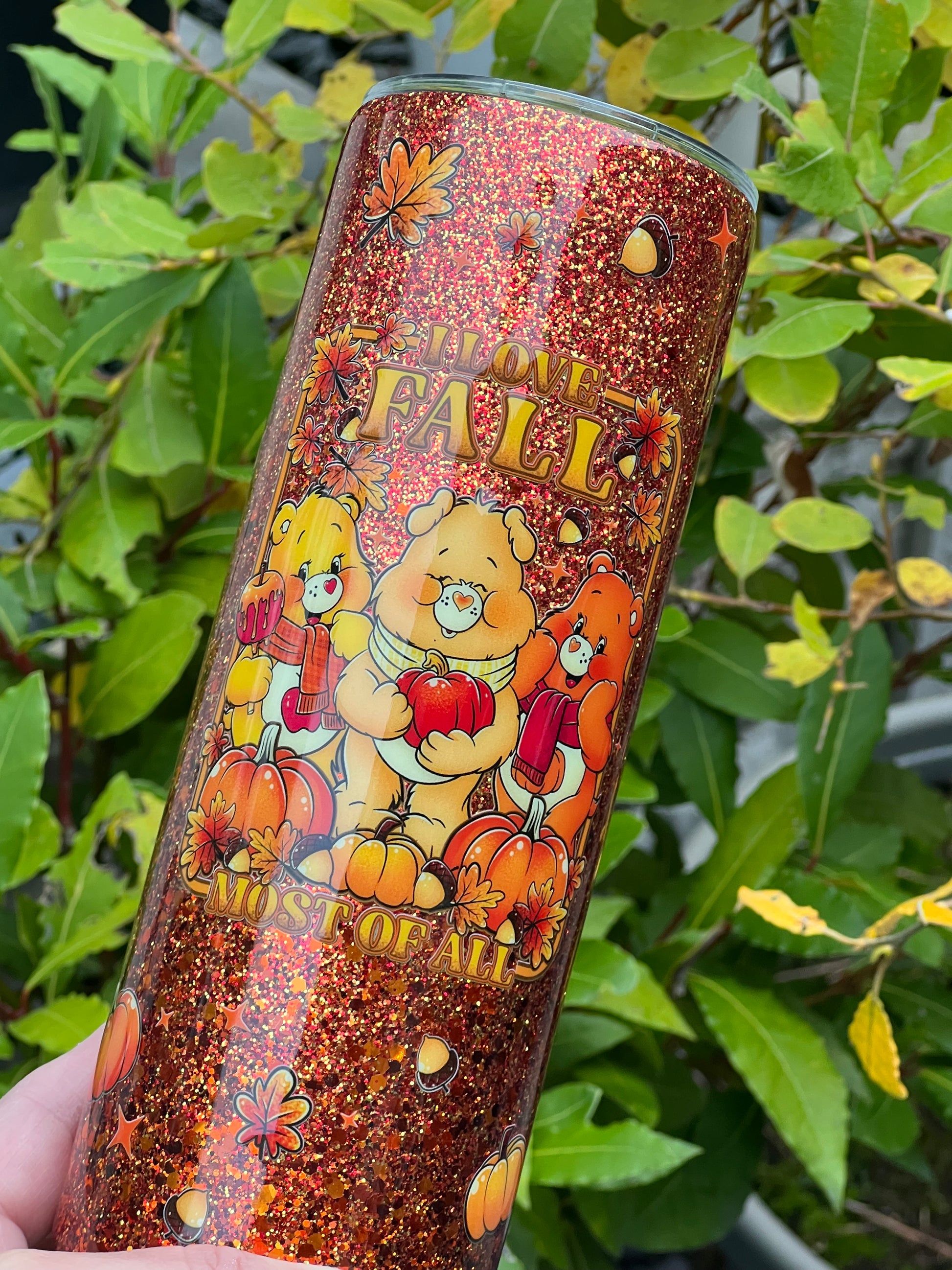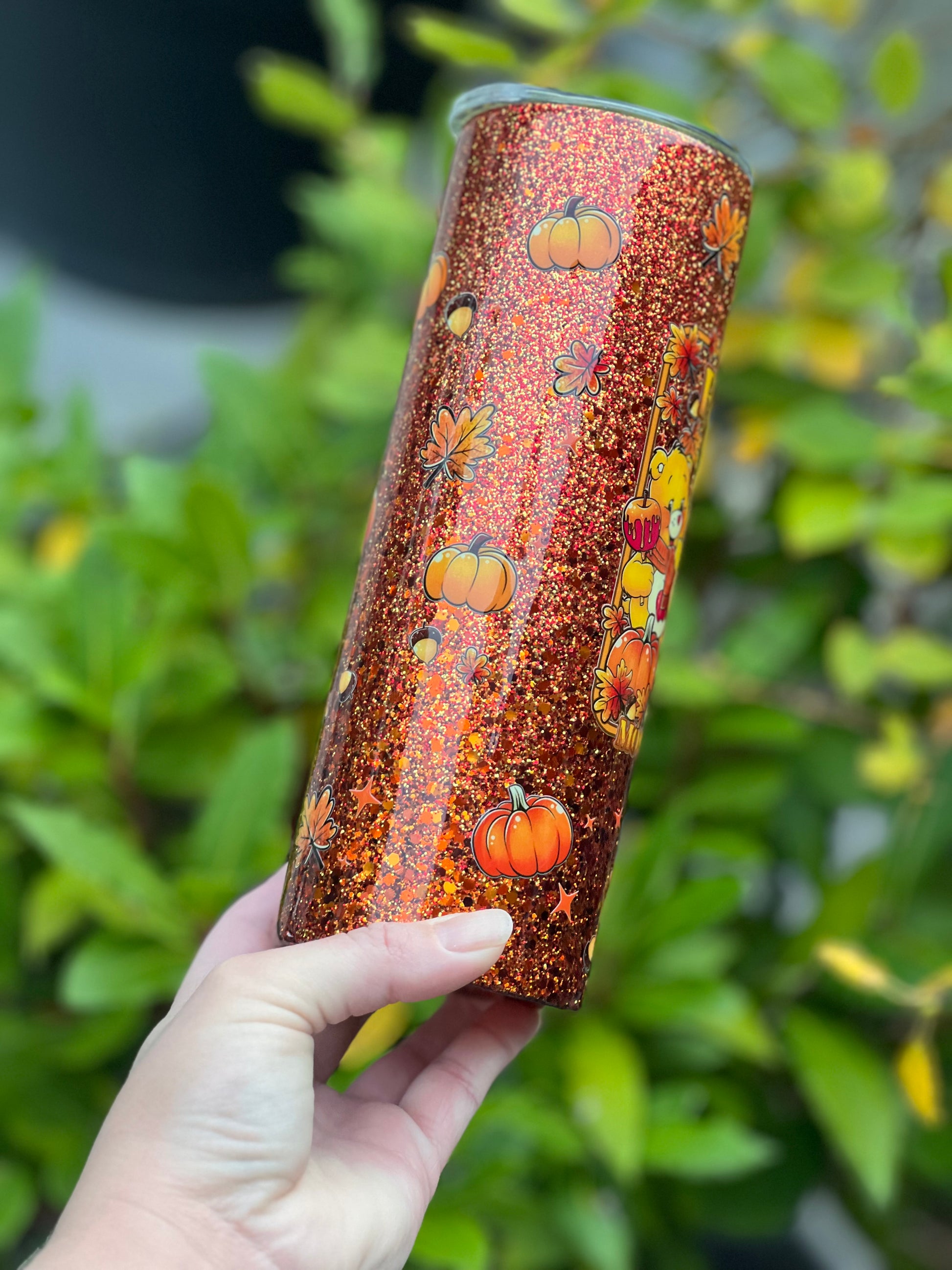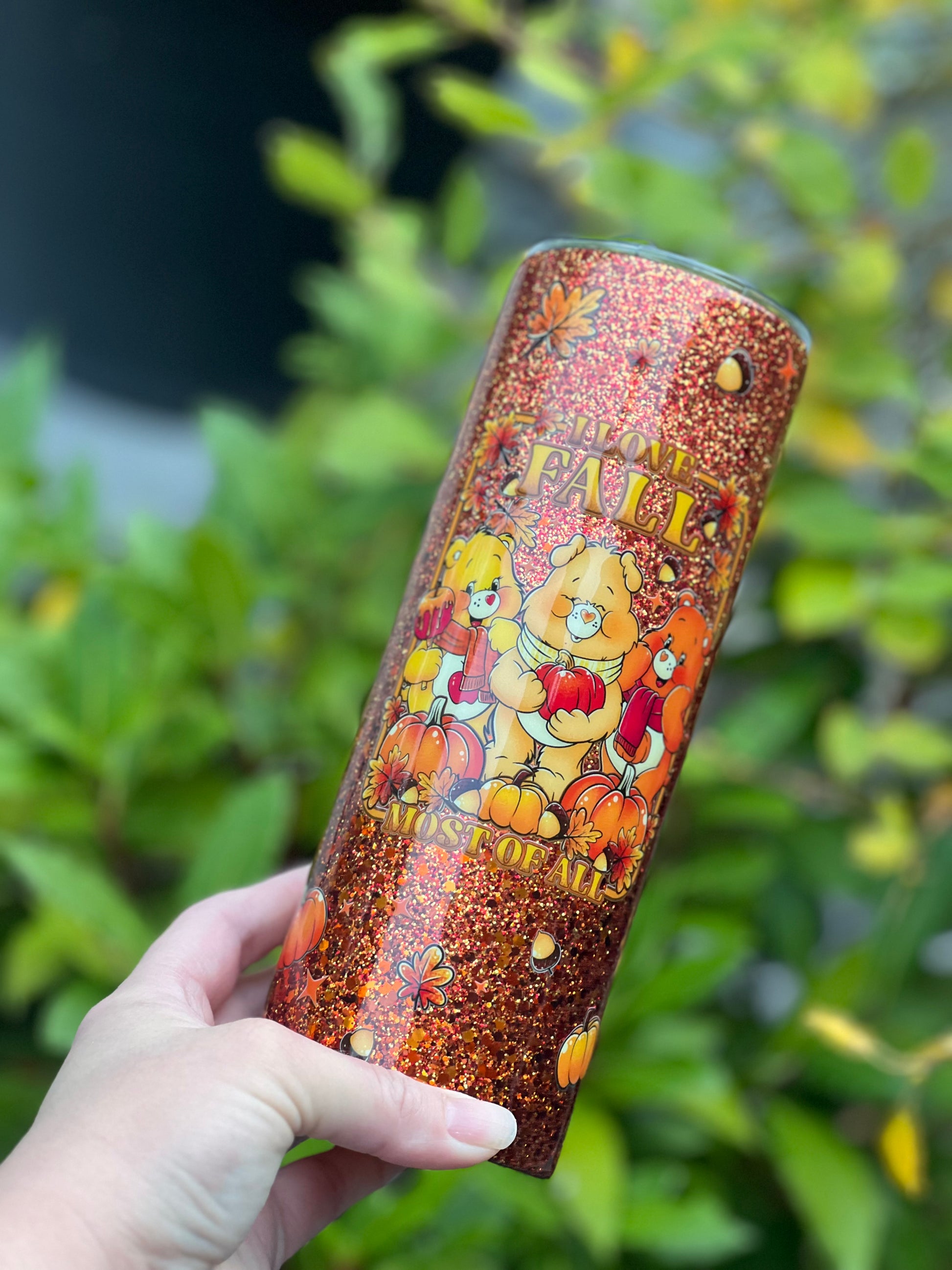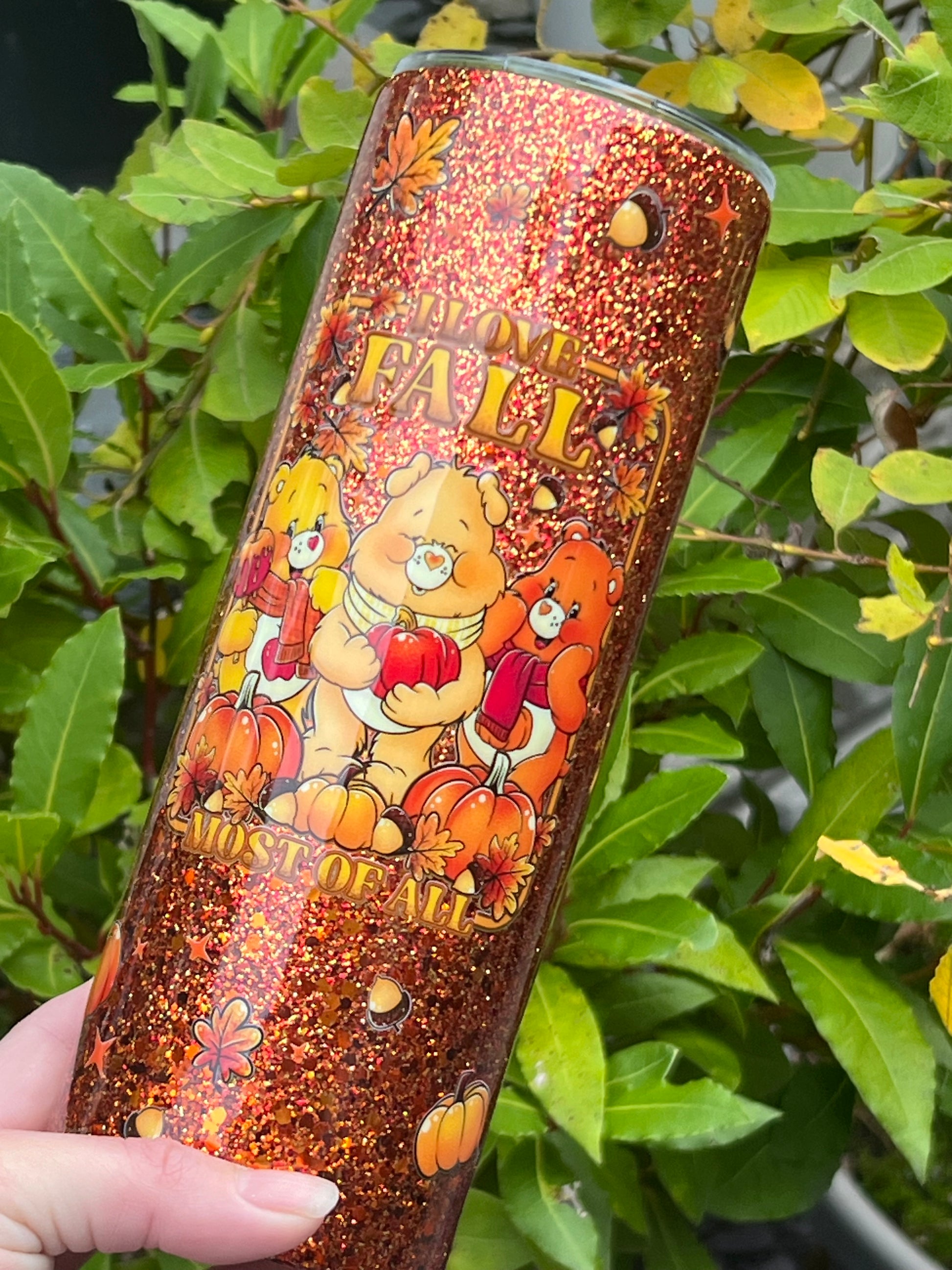 20oz All glitter tumbler with cute fall bear design, all sealed with Hyperion for a beautiful shine.