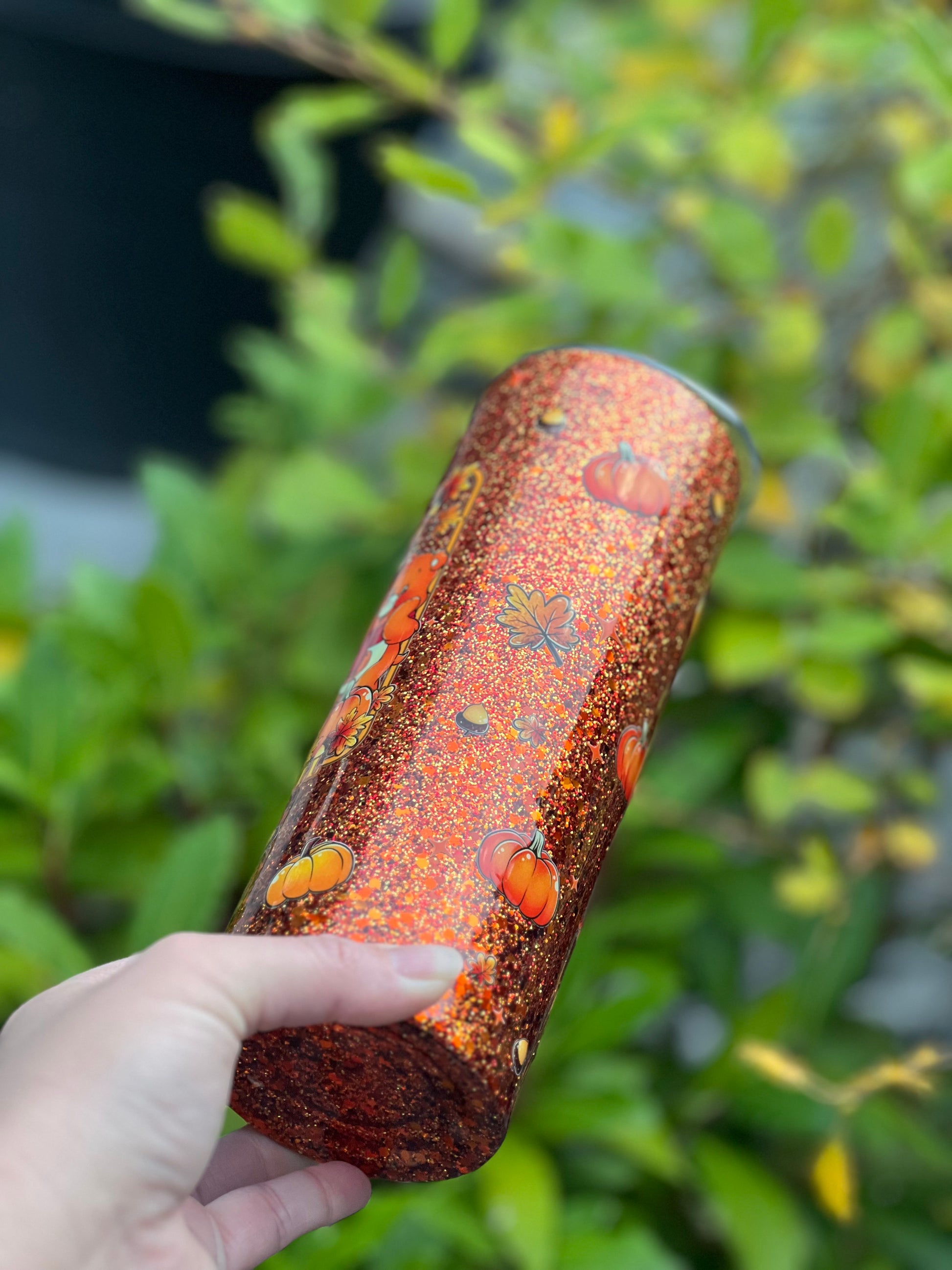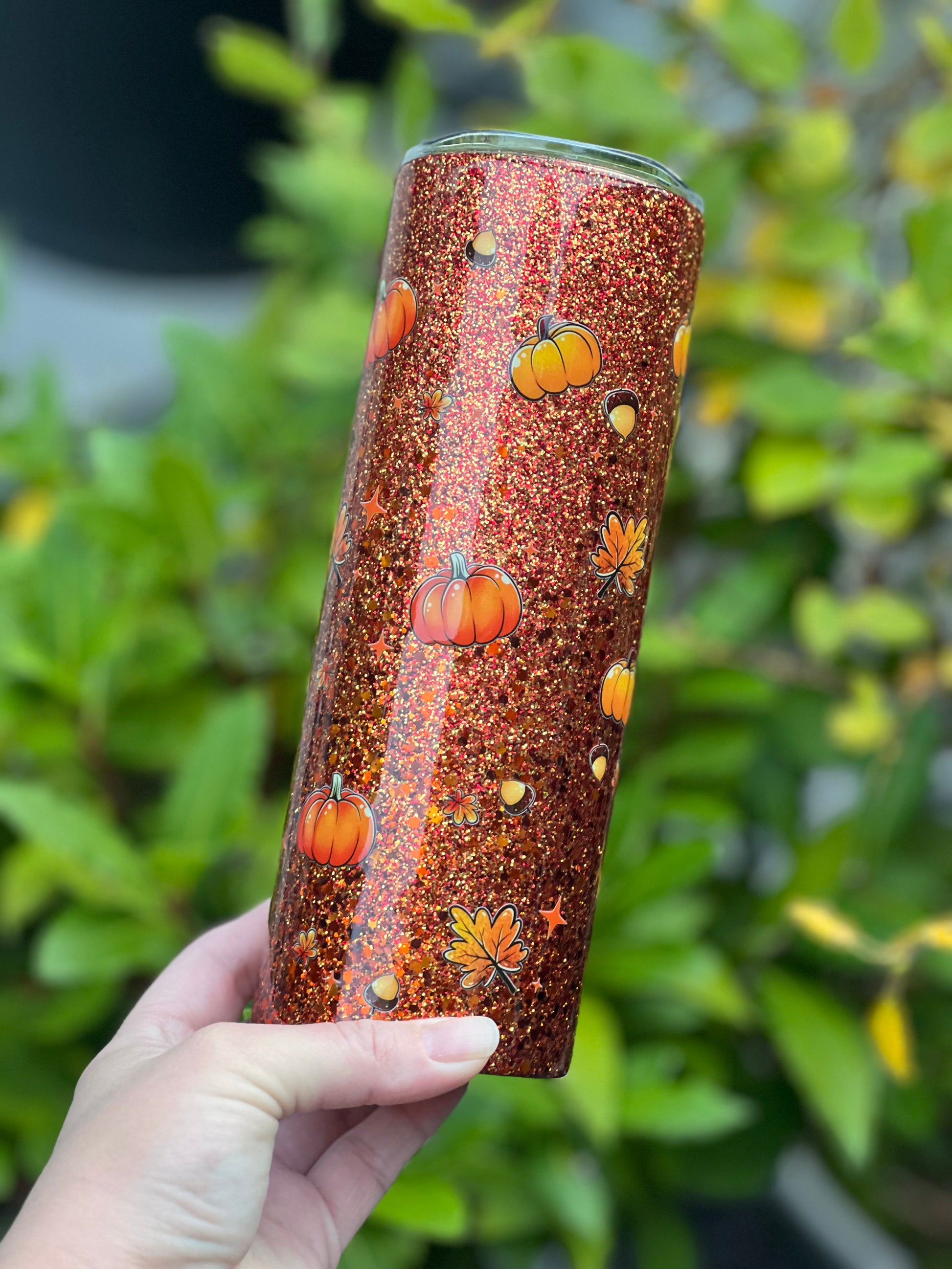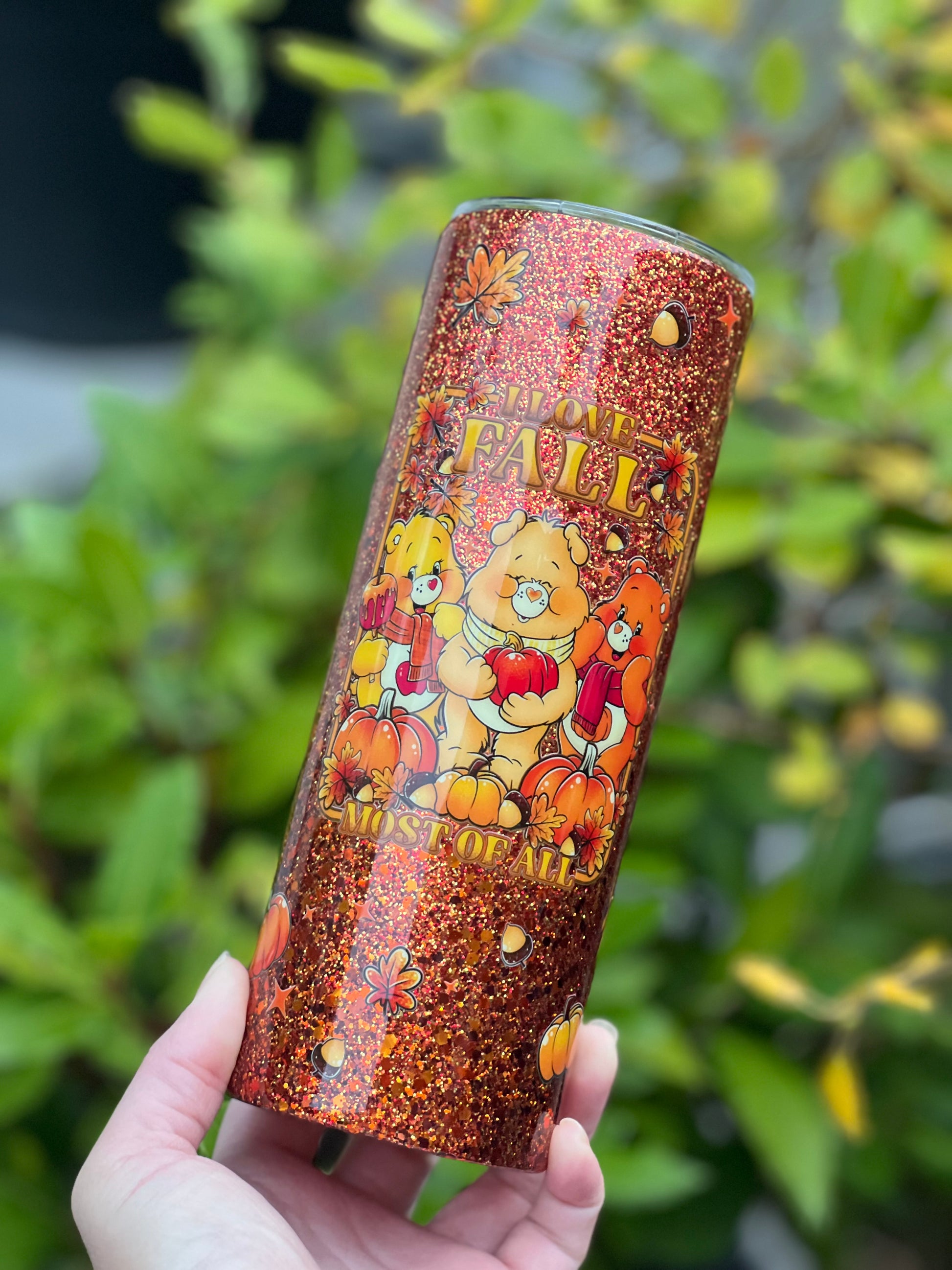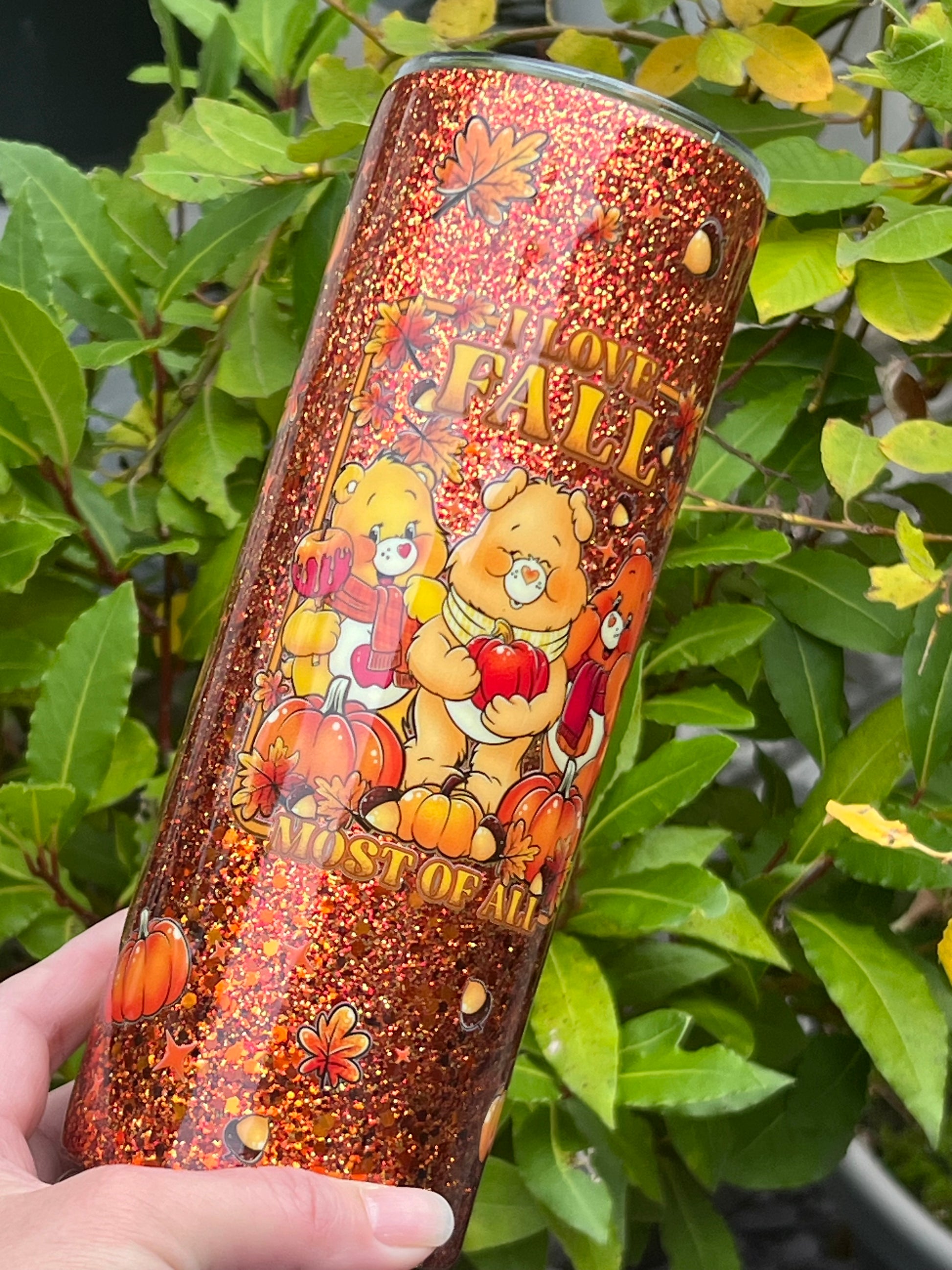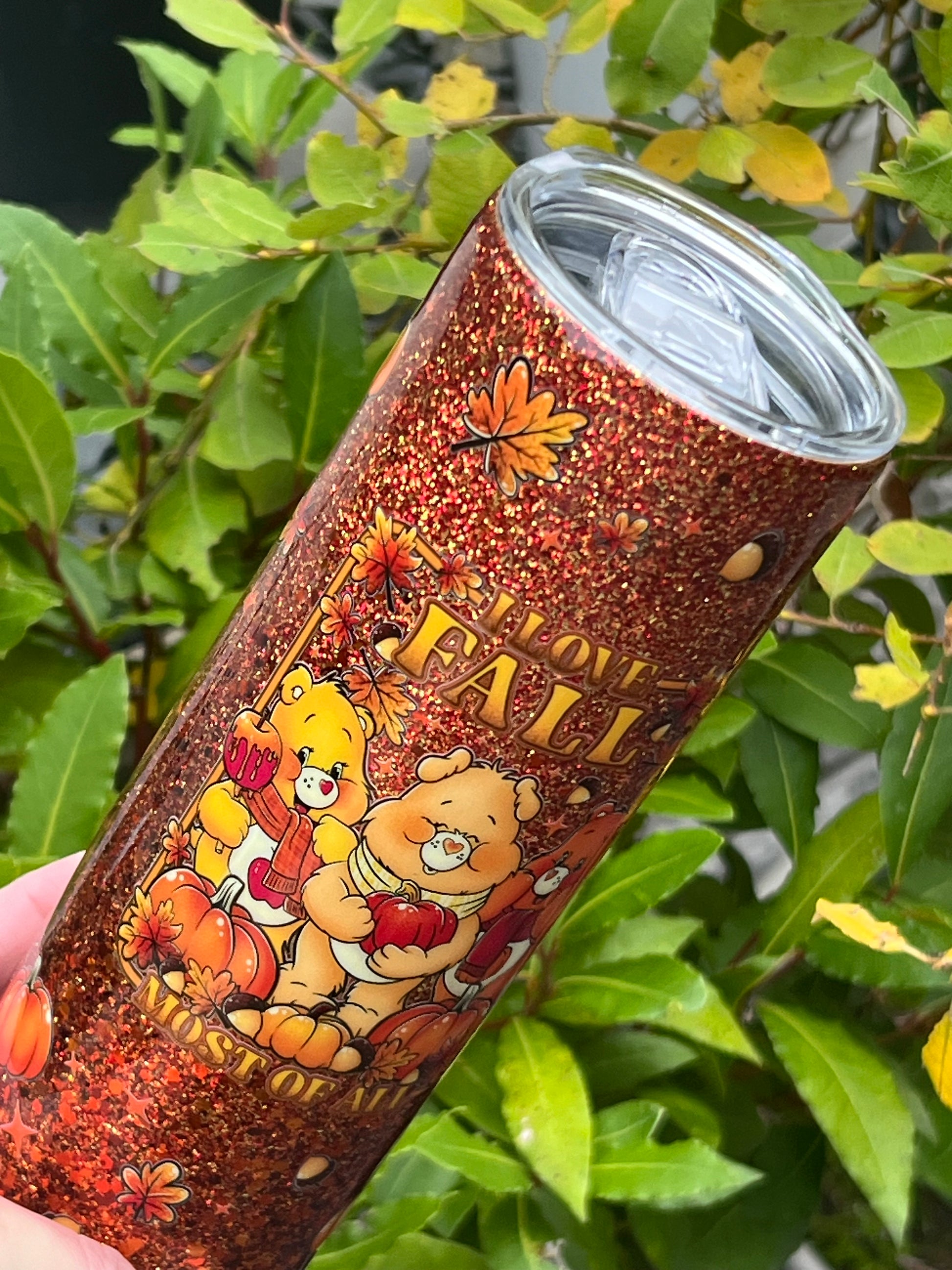 20oz All glitter tumbler with cute fall bear design, all sealed with Hyperion for a beautiful shine.