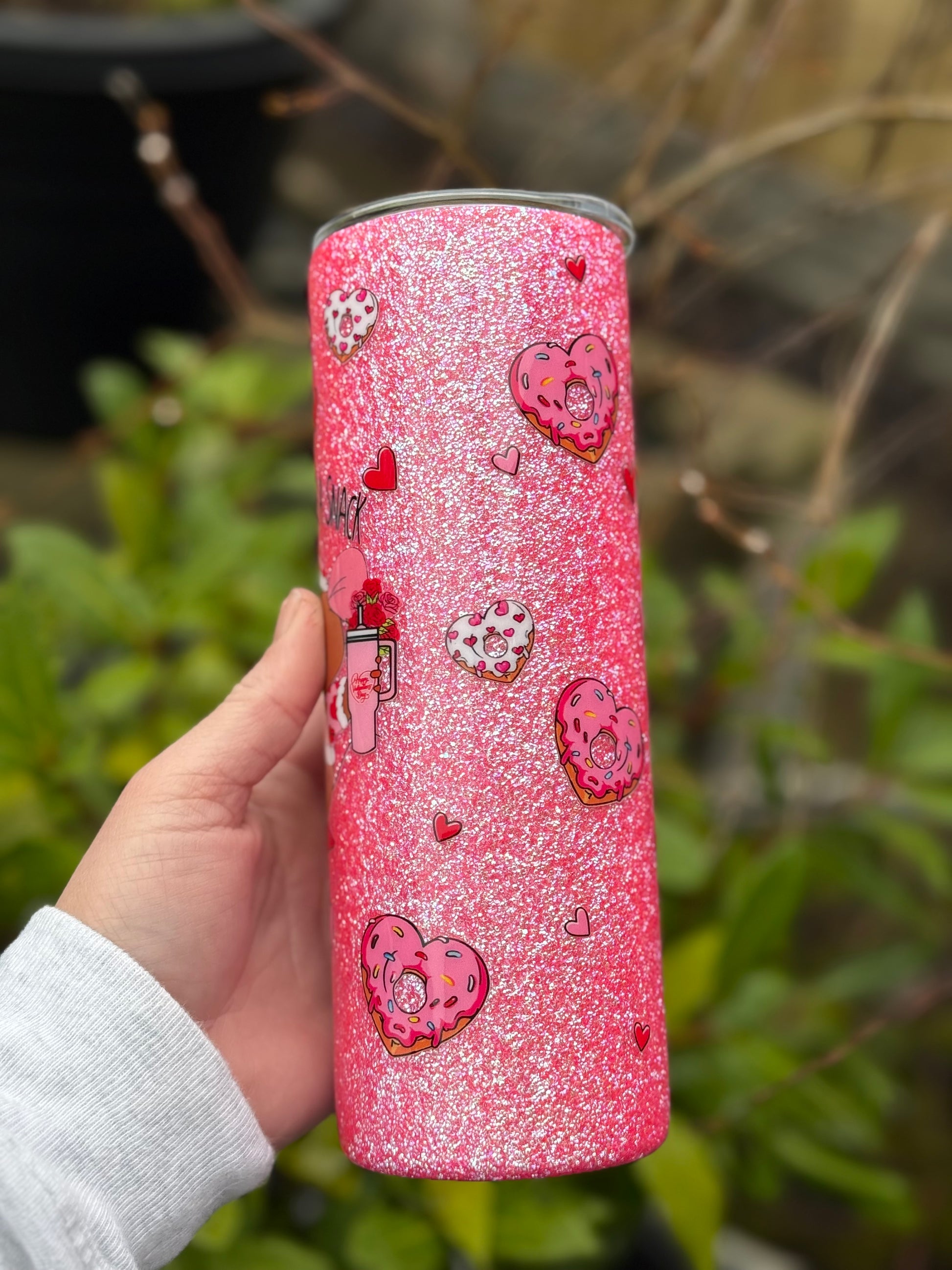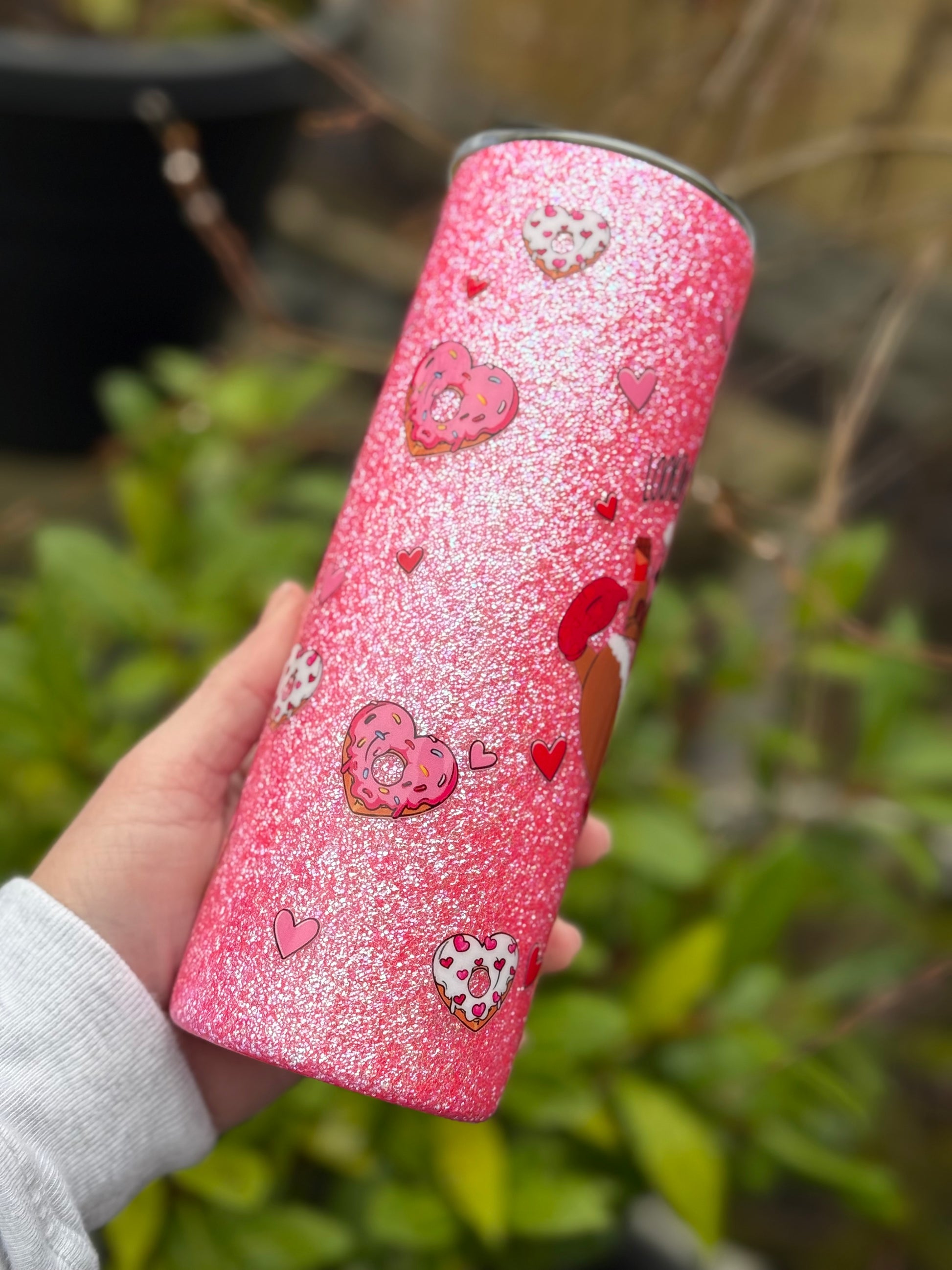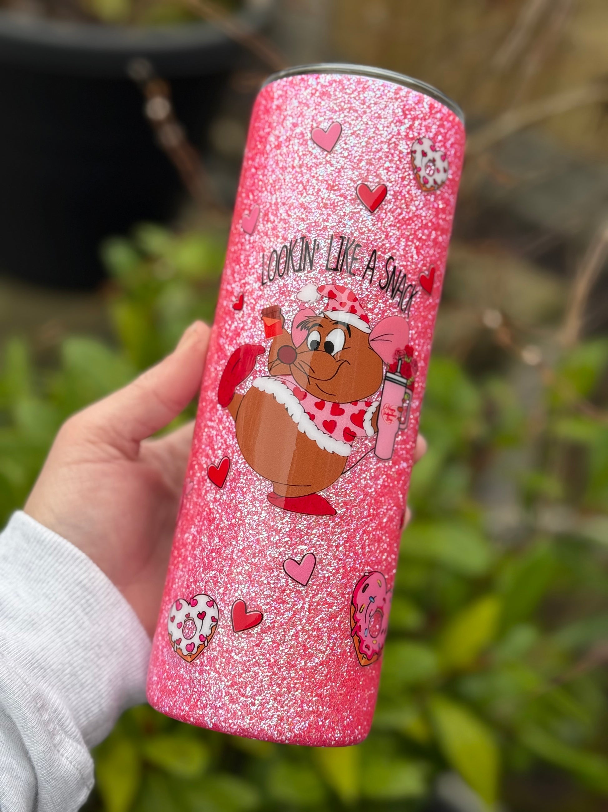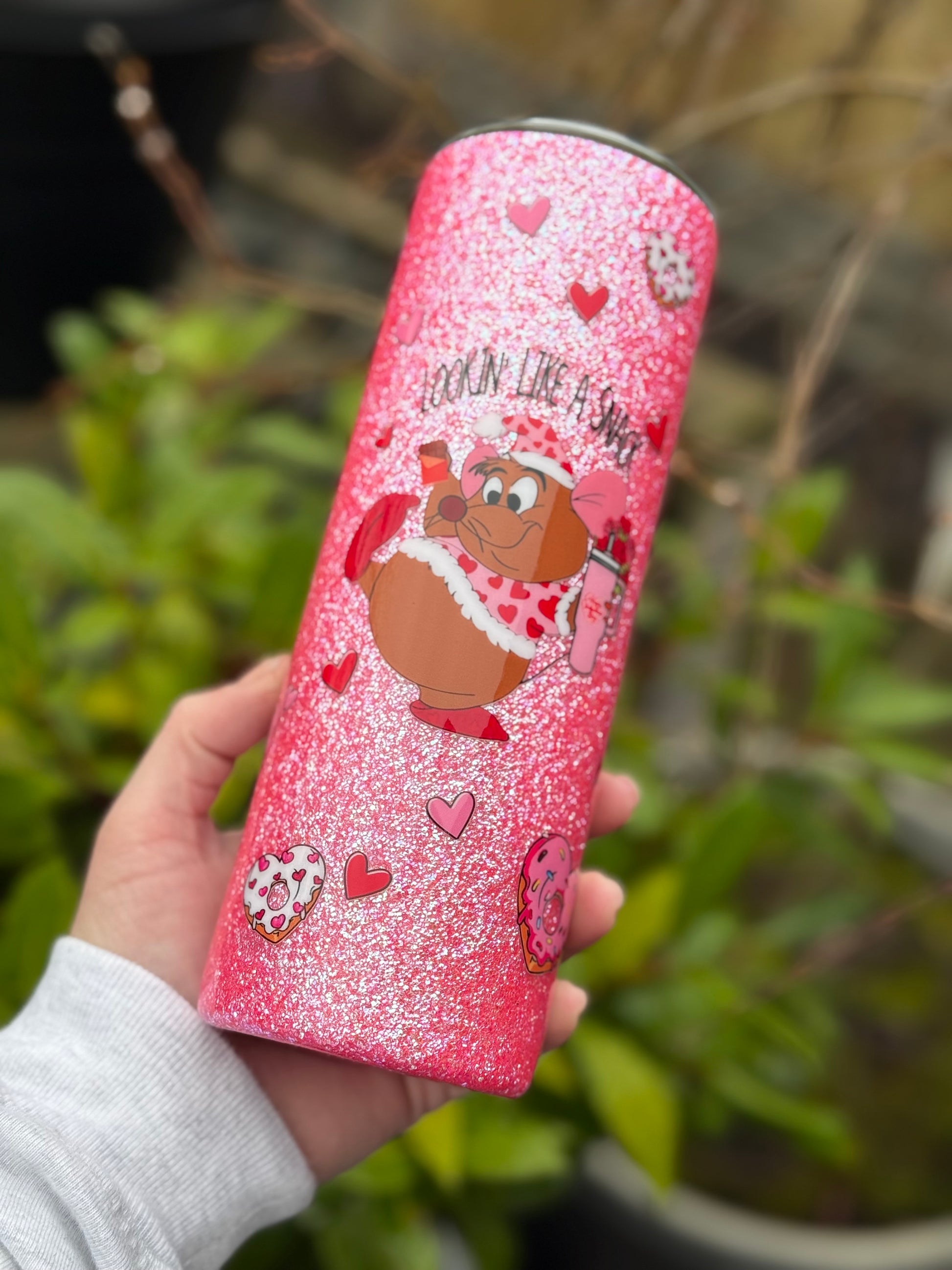 20oz all glitter tumbler with Gus Gus design!! Glitter used is a textured glitter which gives a beautiful dimension to the cup. All sealed with Hyperion for a glass like finish.