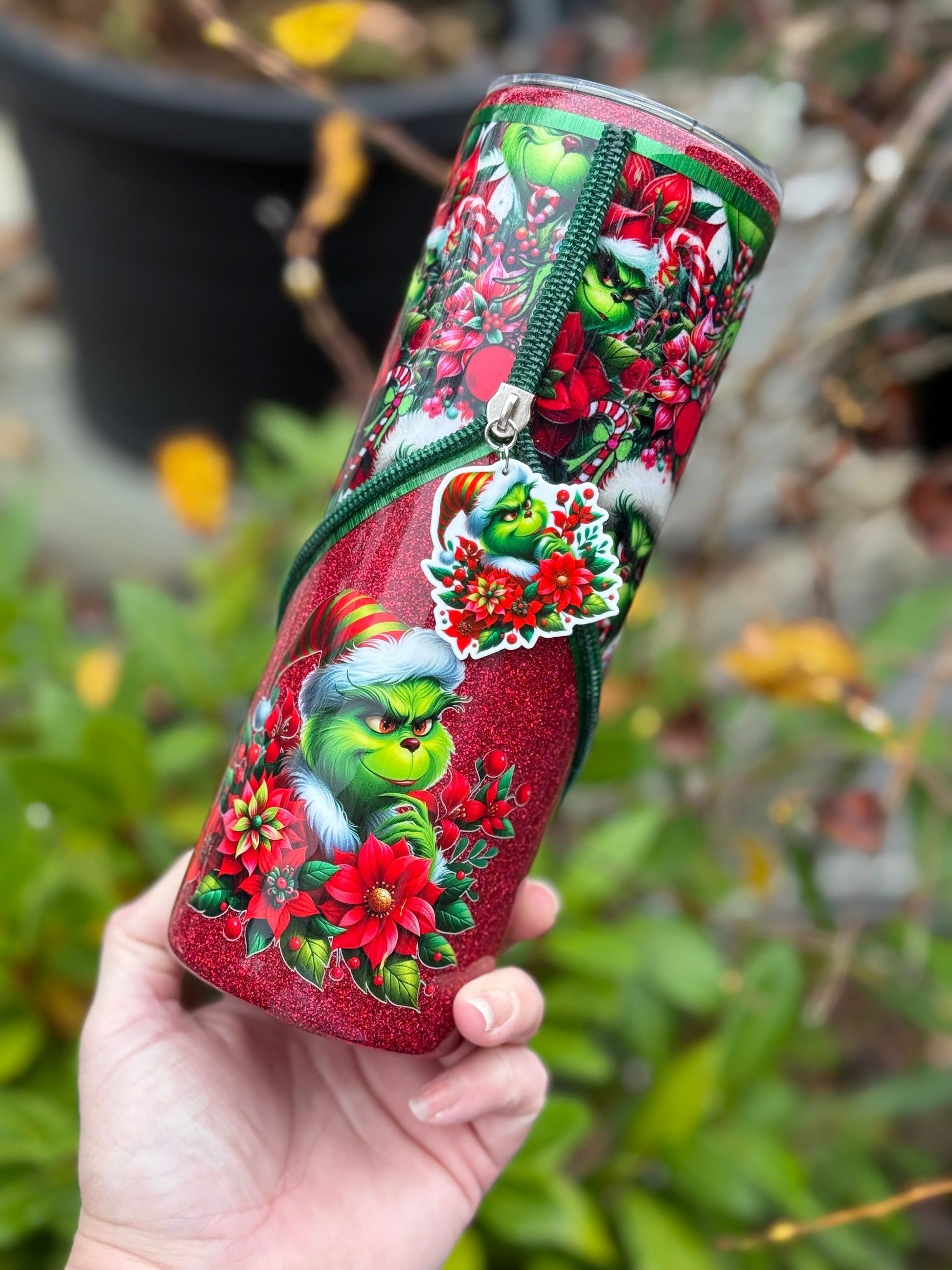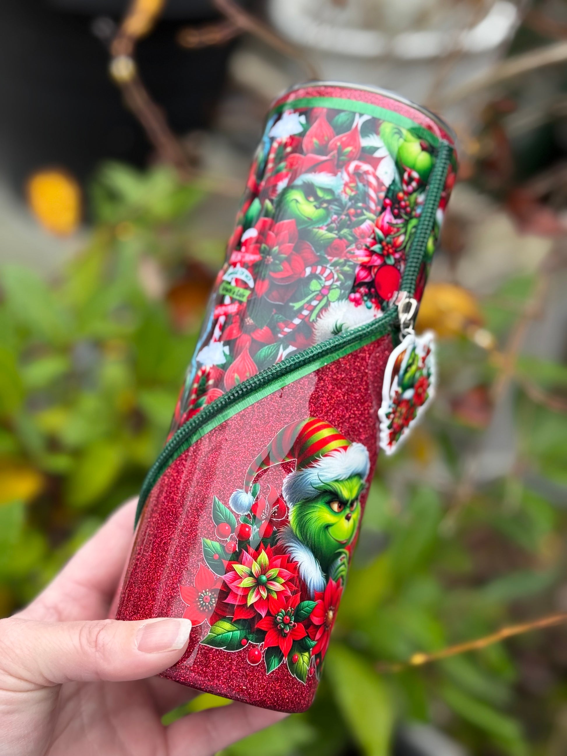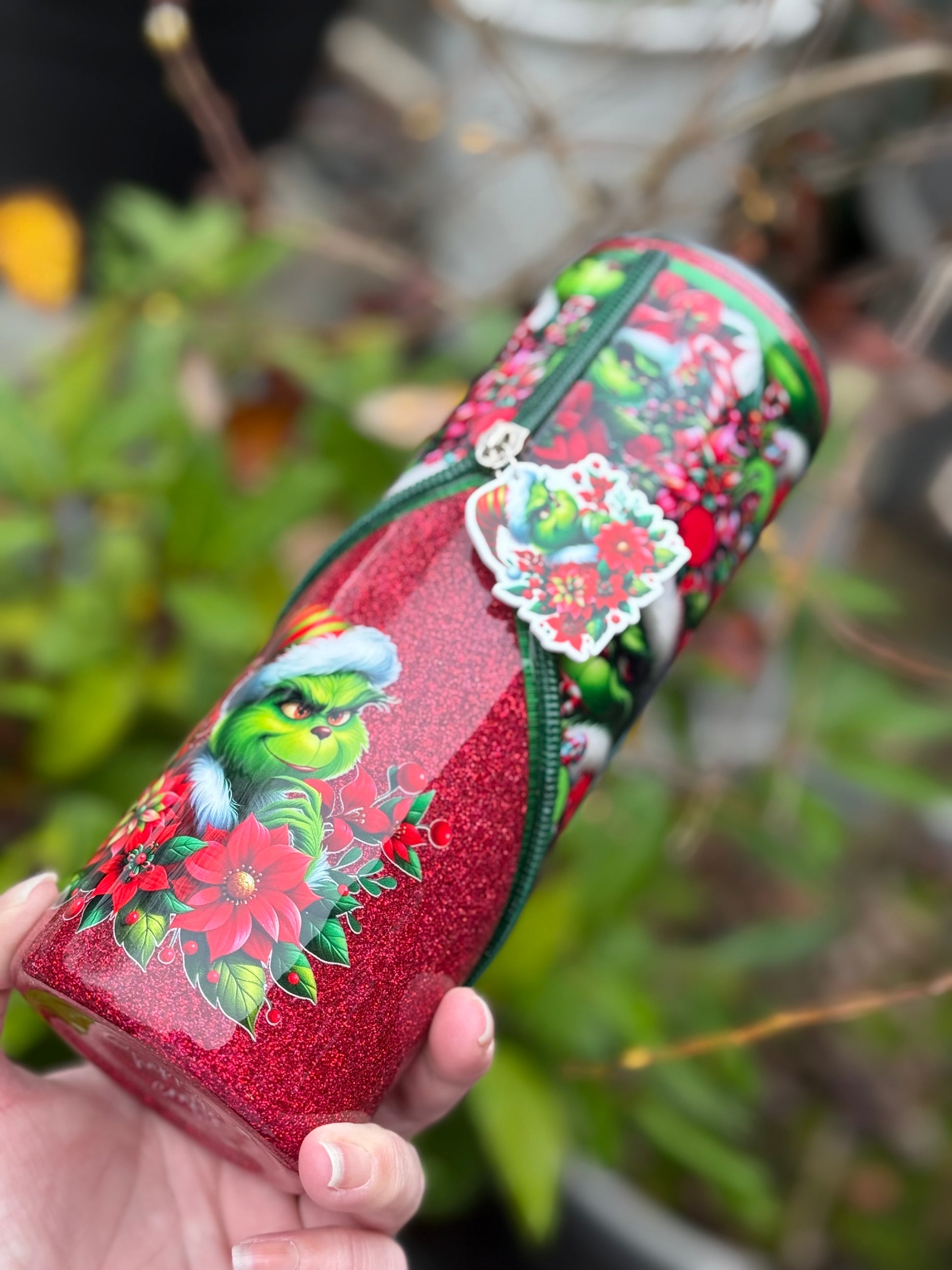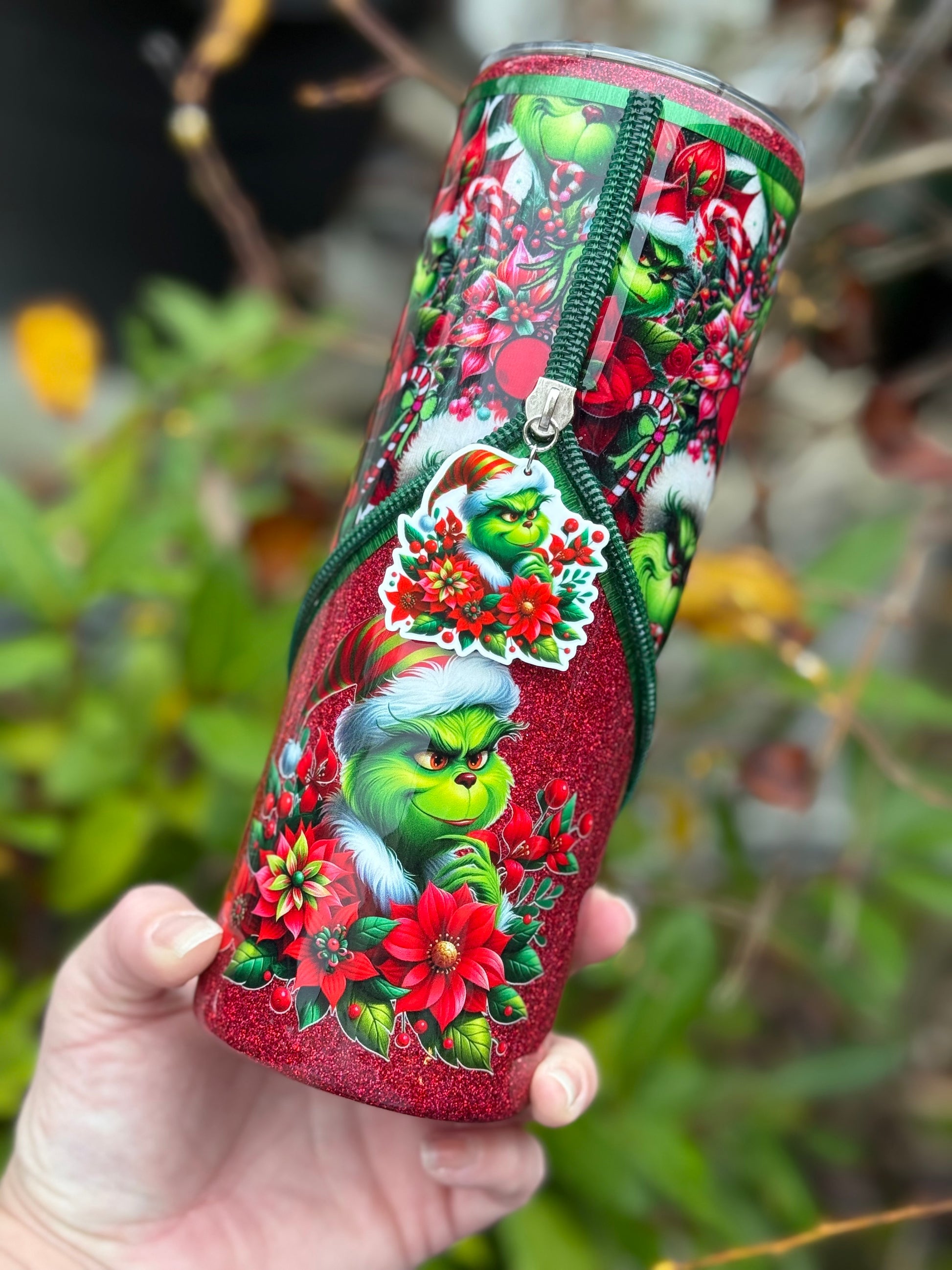 Handmade zipper tumbler with Grinch fabric, decal and matching zipper.