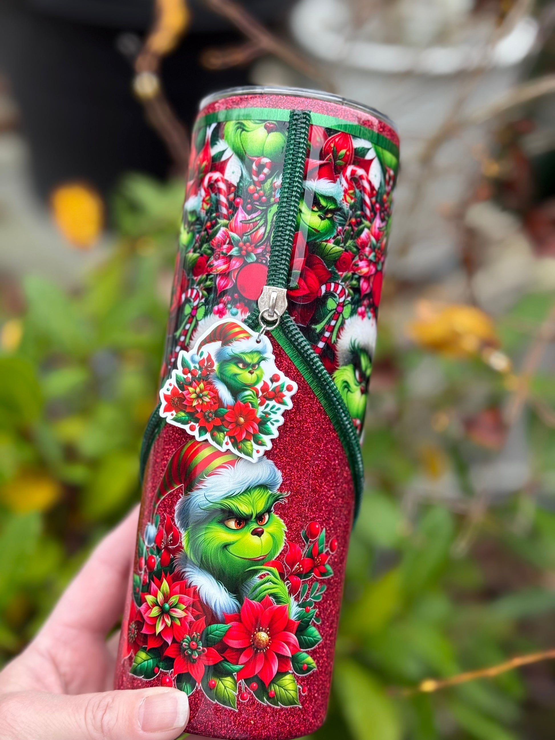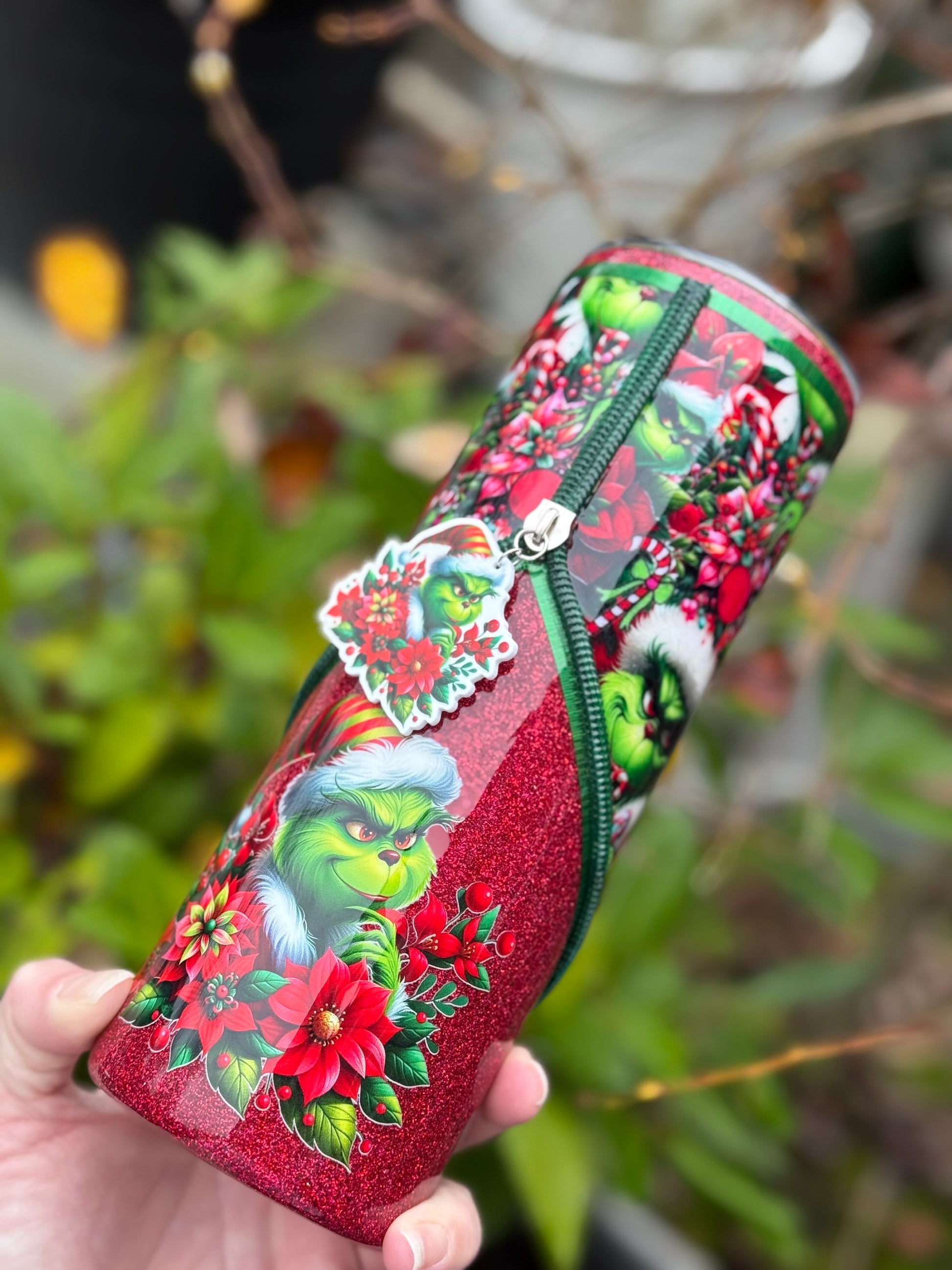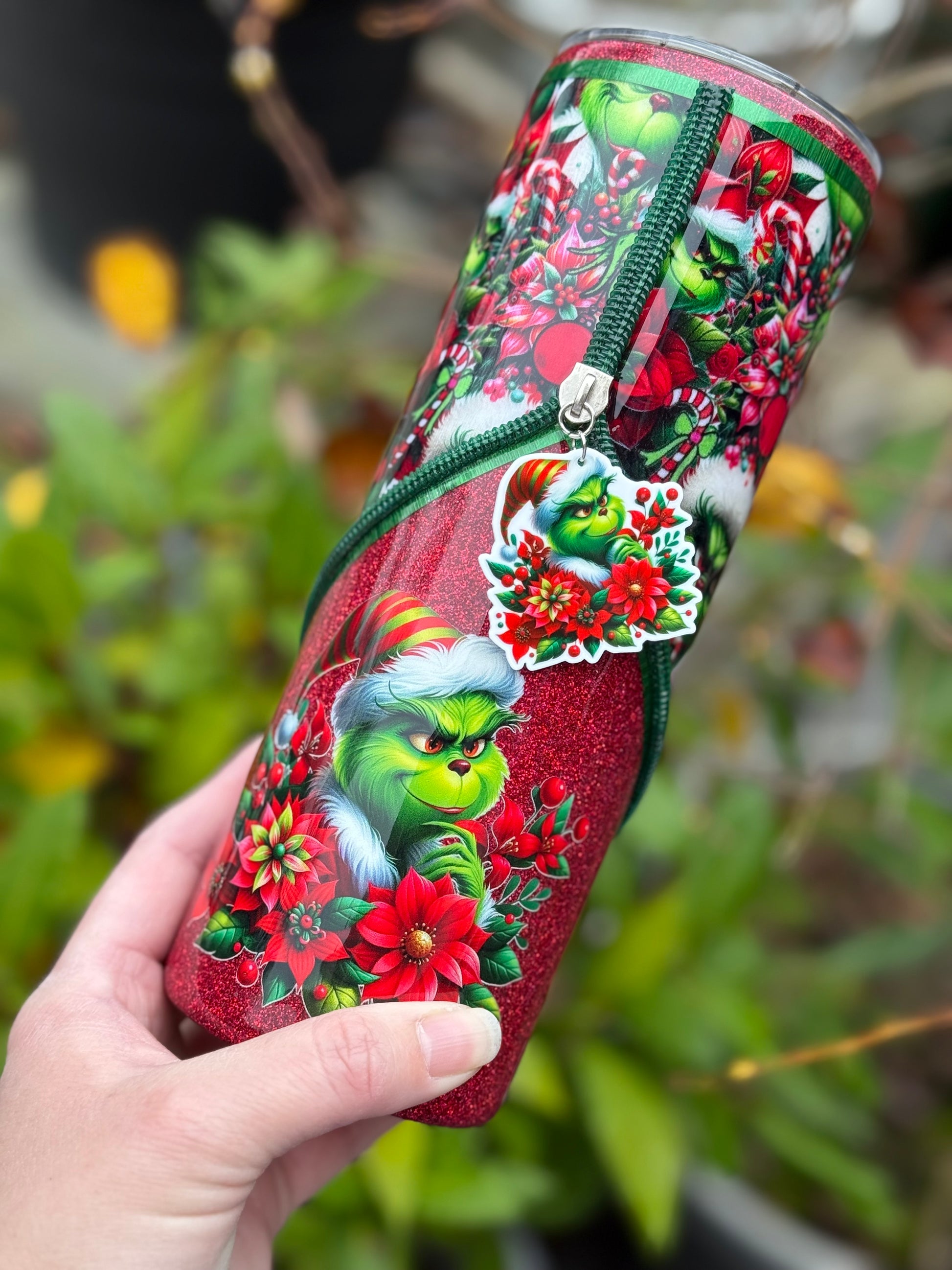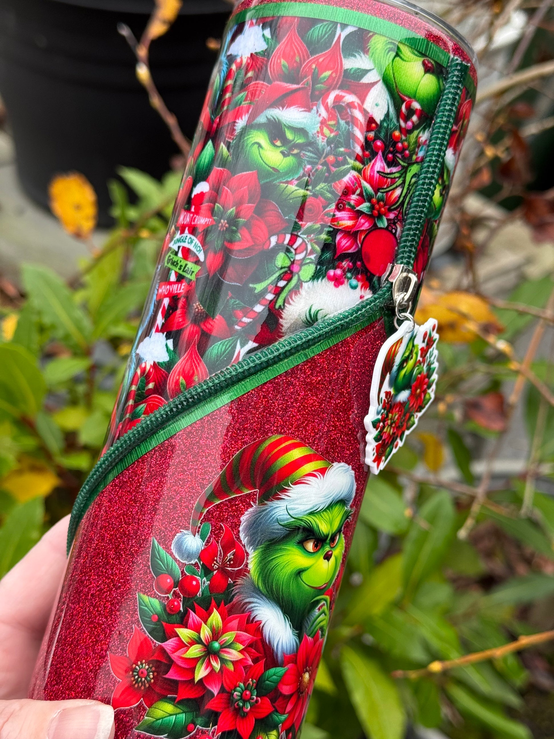 Handmade zipper tumbler with Grinch fabric, decal and matching zipper.