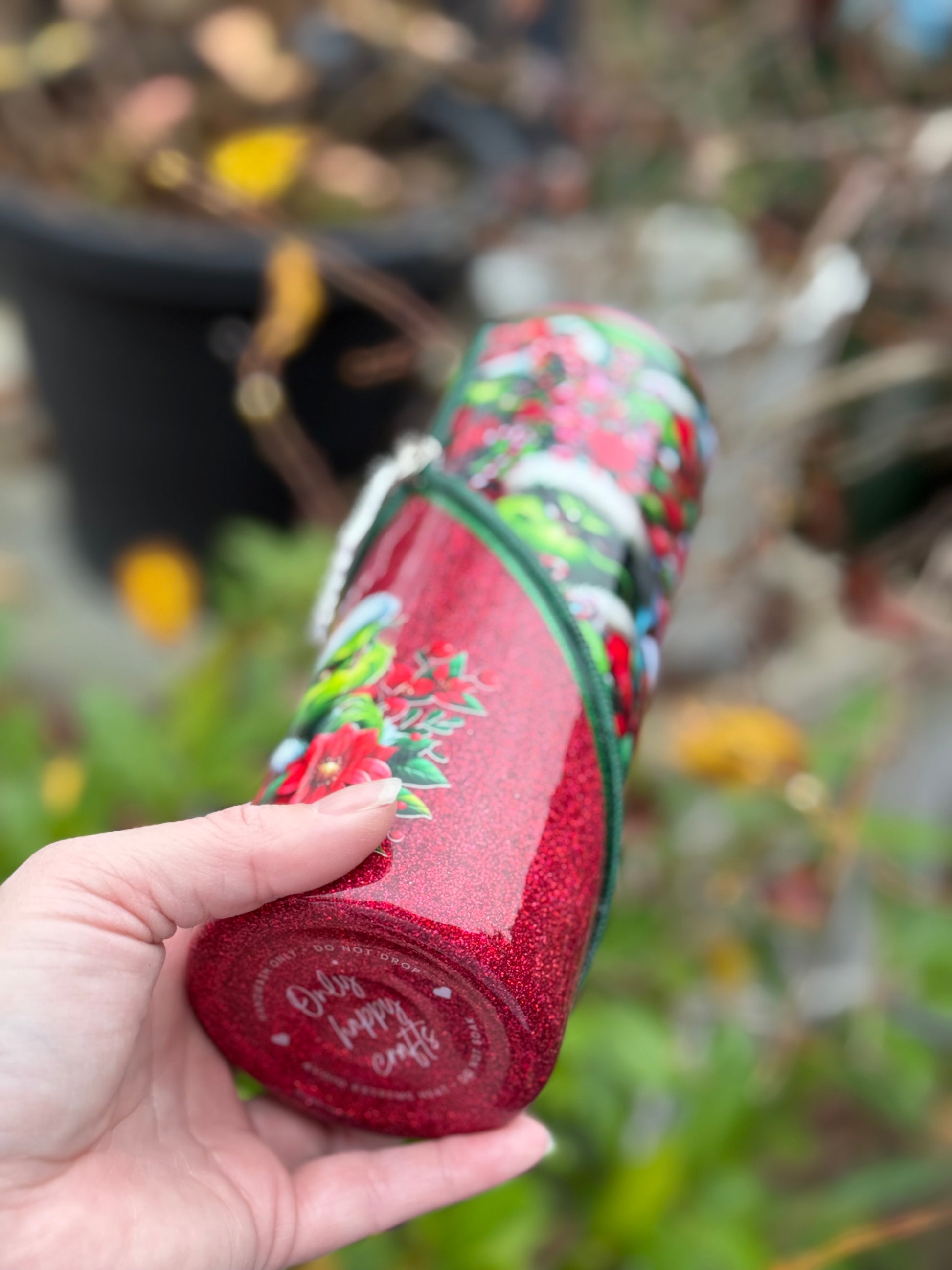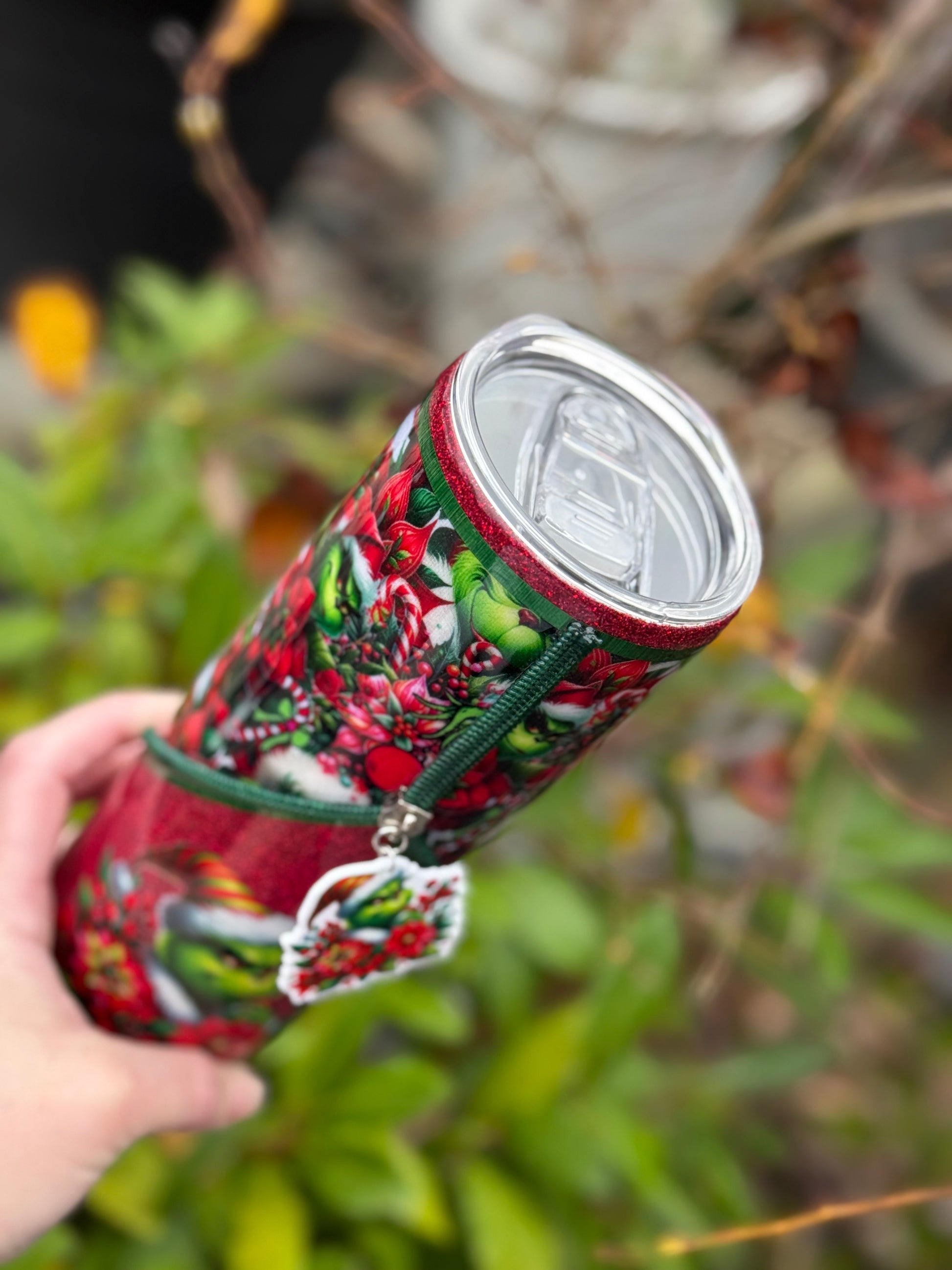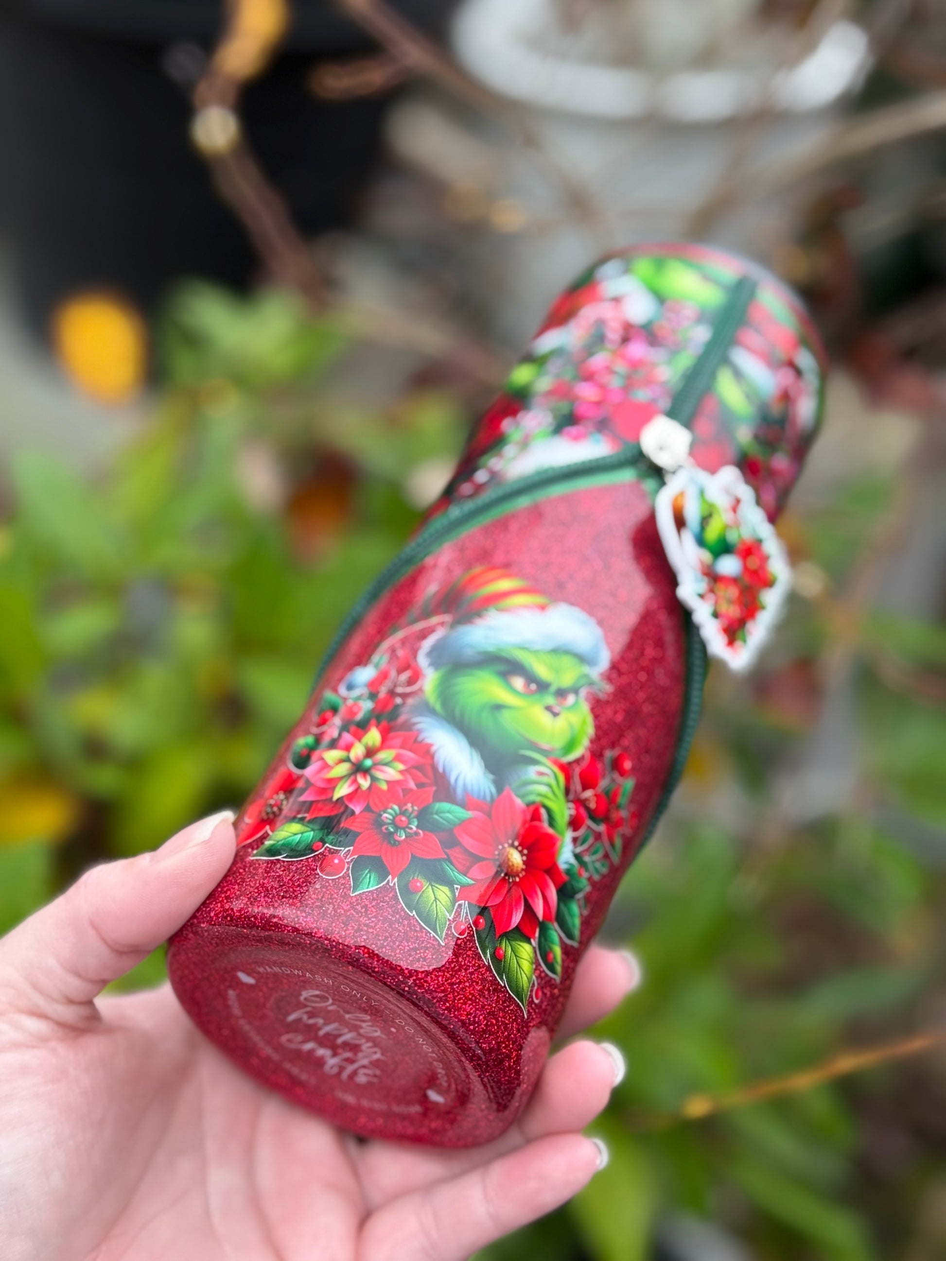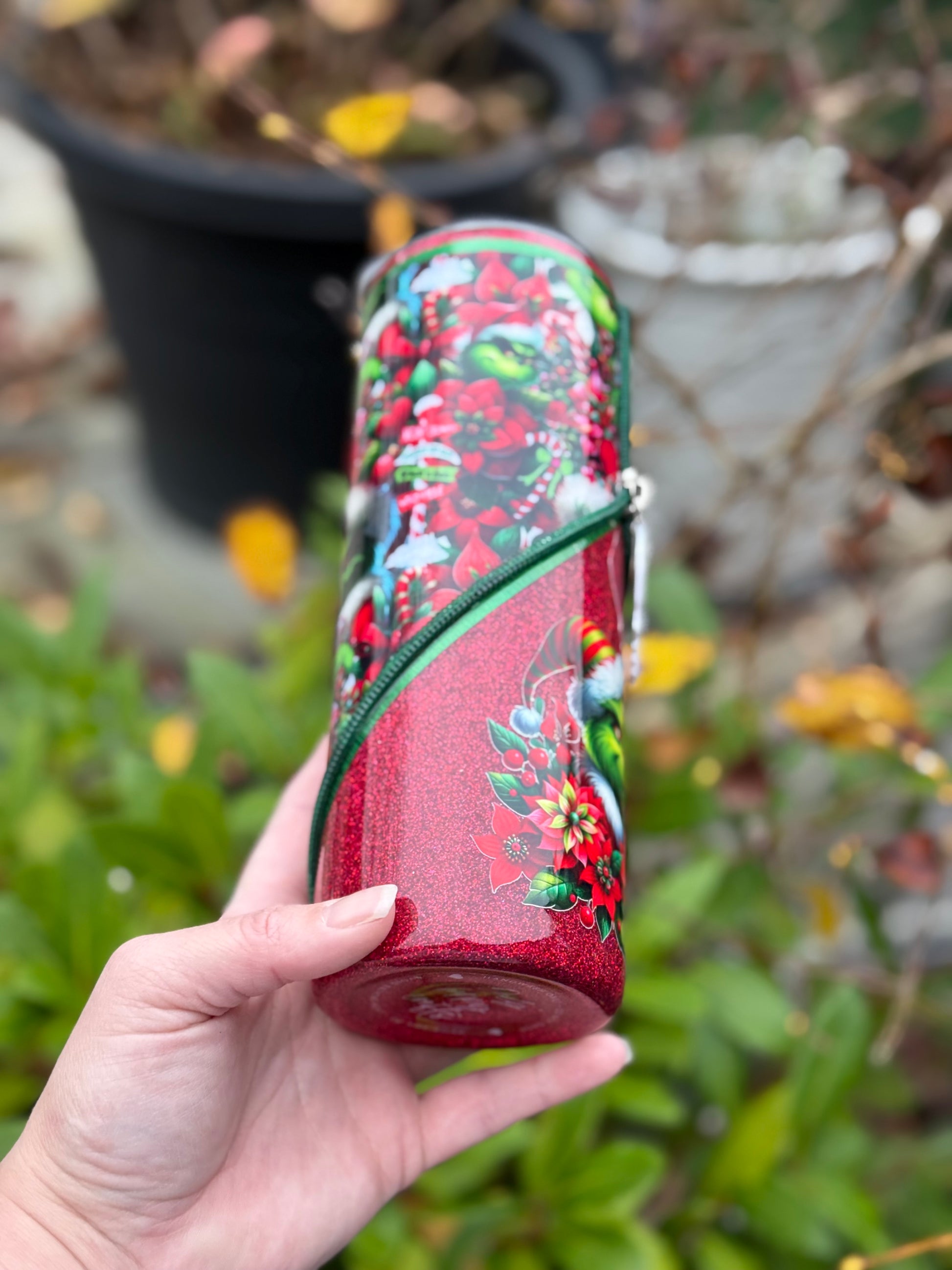 Handmade zipper tumbler with Grinch fabric, decal and matching zipper.