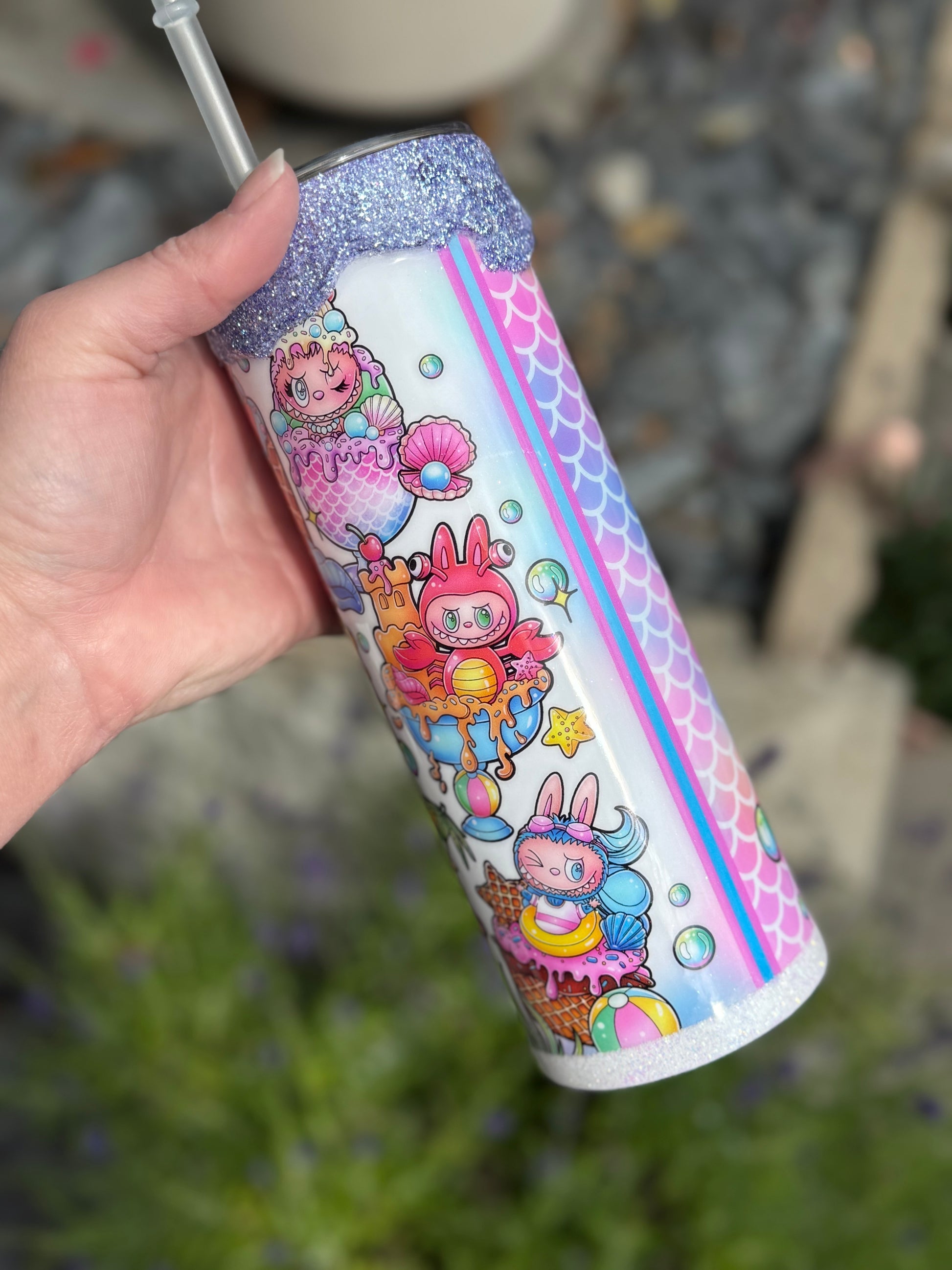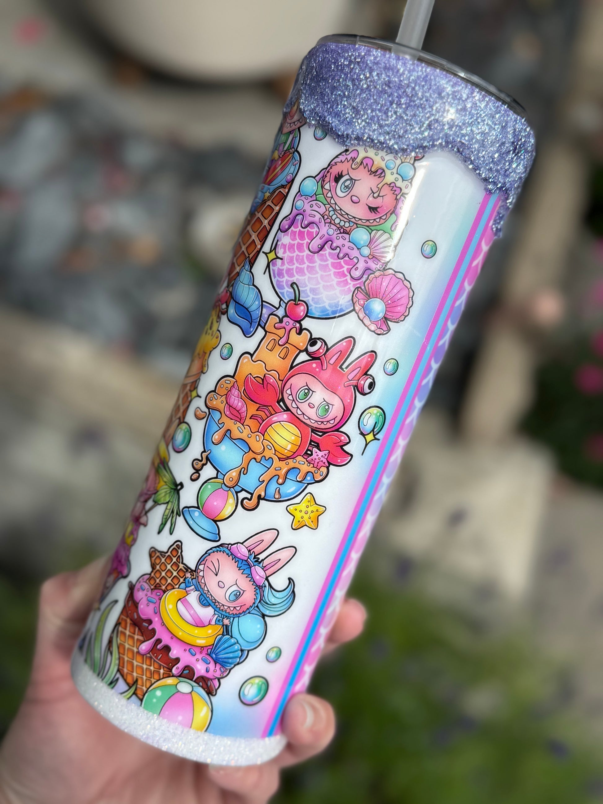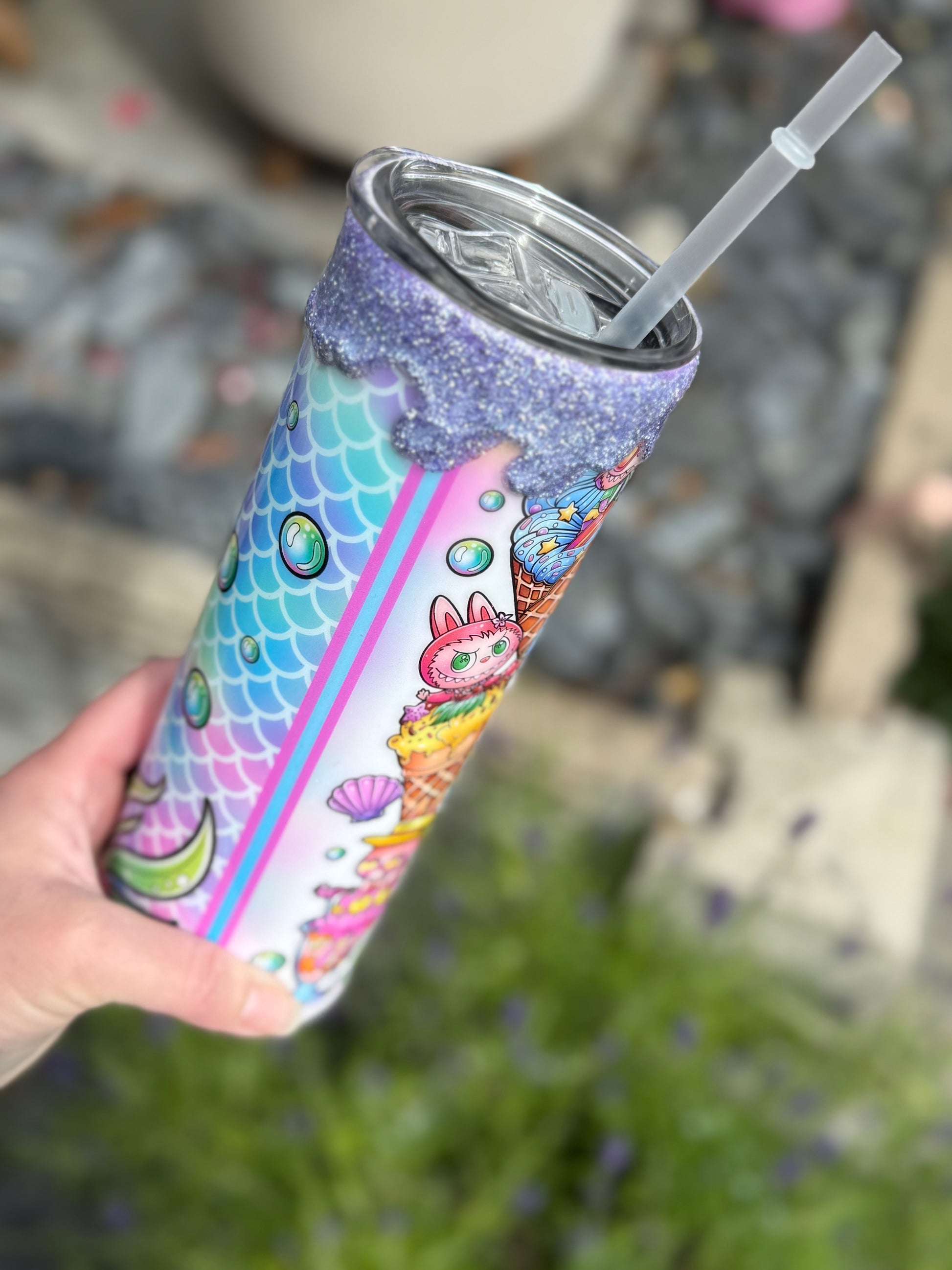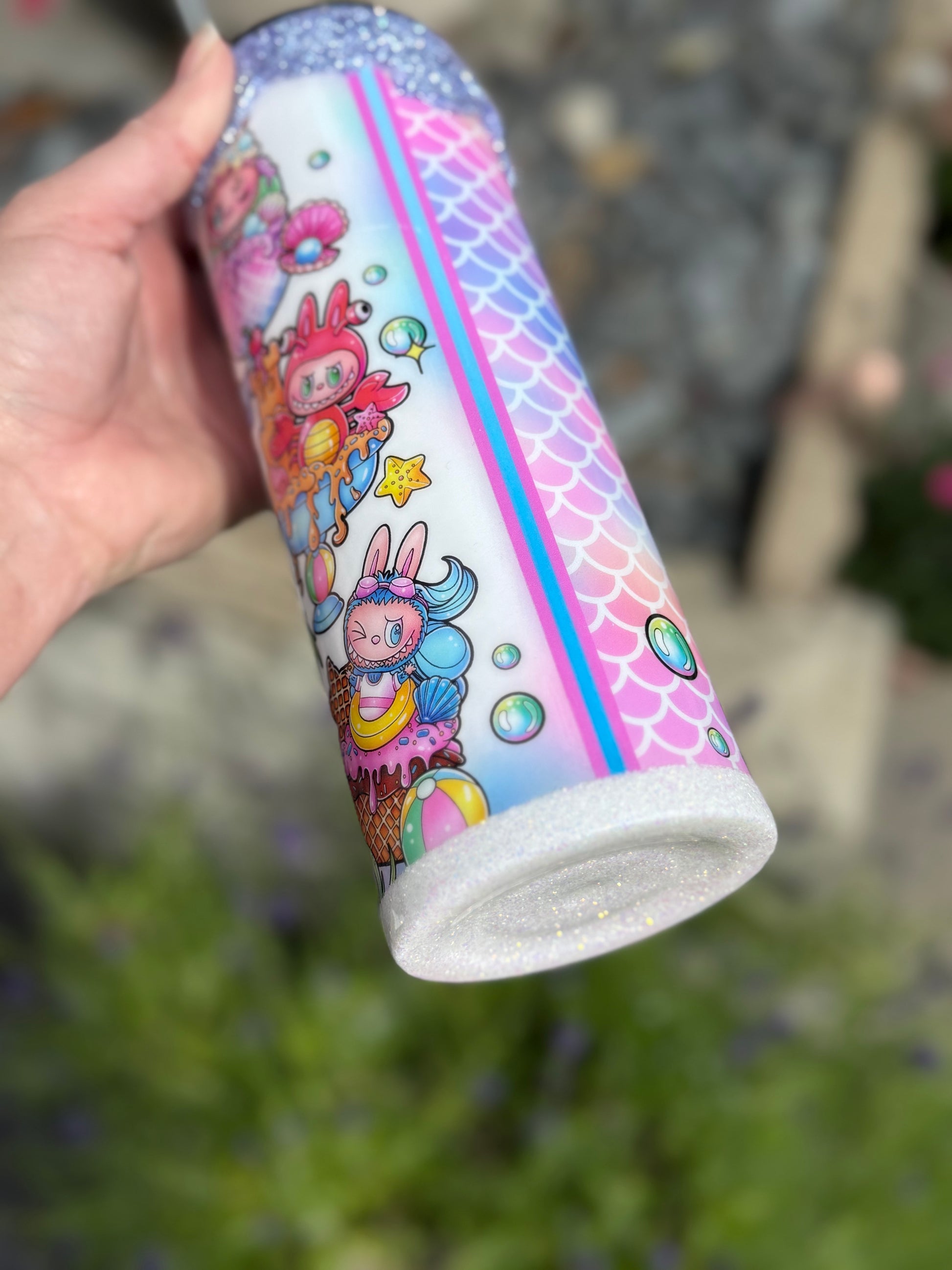 20oz stainless steel tumbler with Labubu design and stunning glitter drip all sealed with Hyperion for a glass like finish.