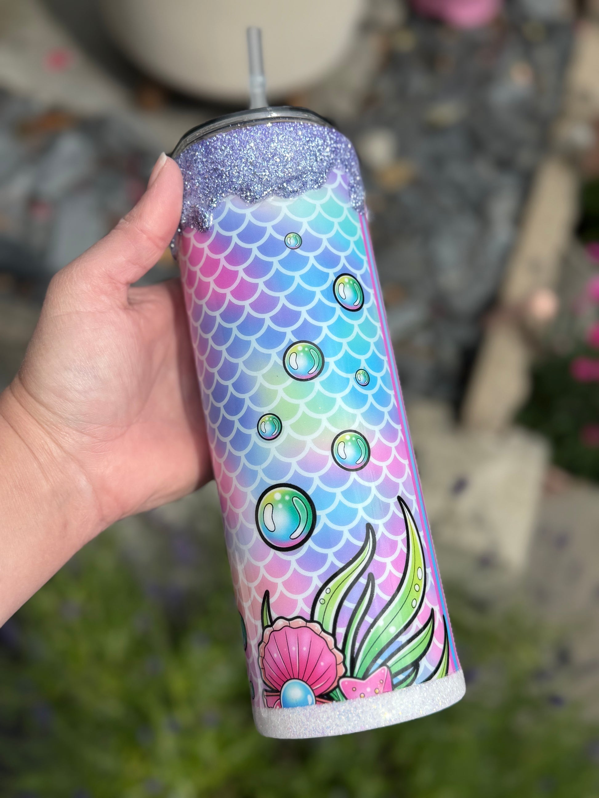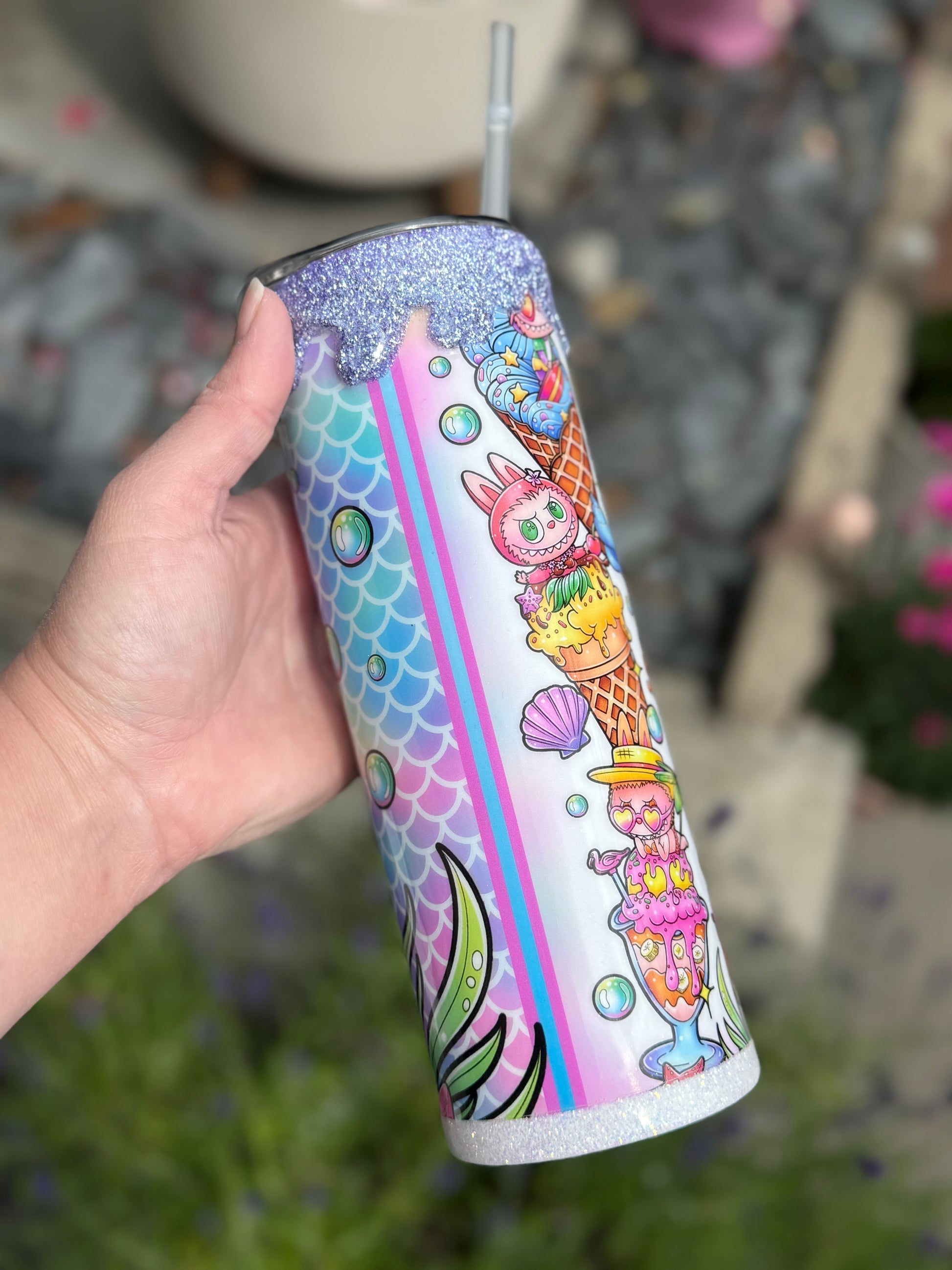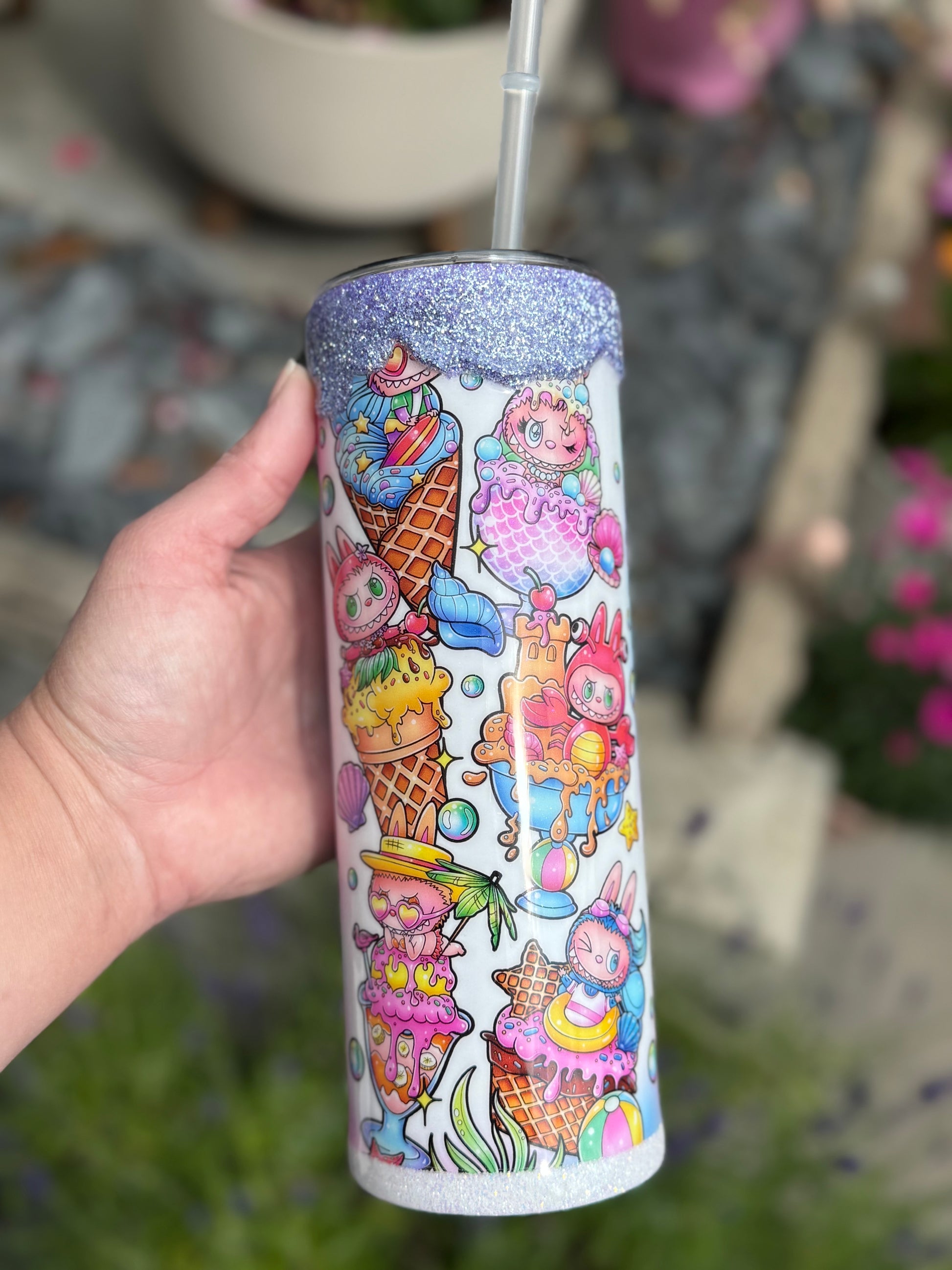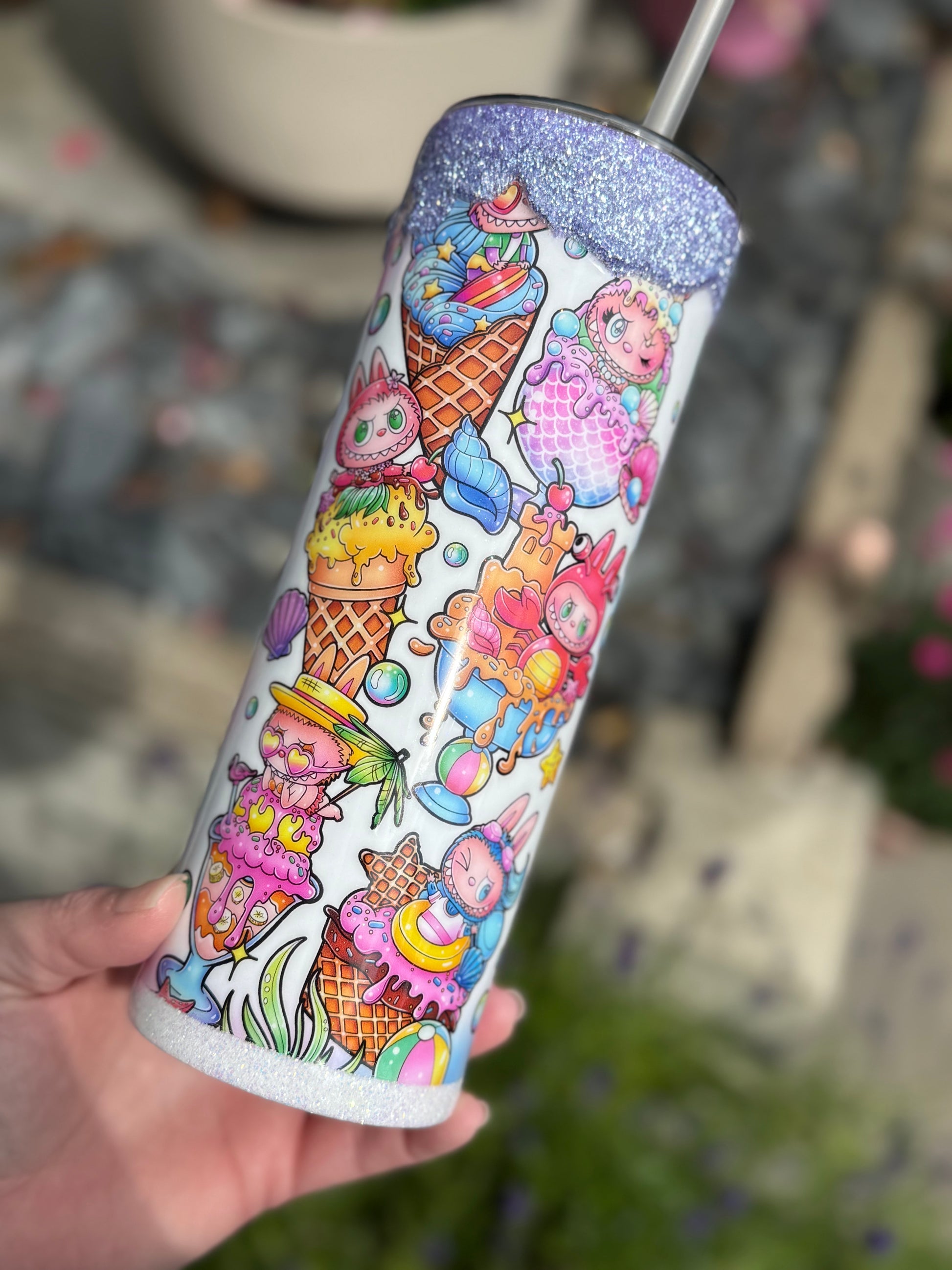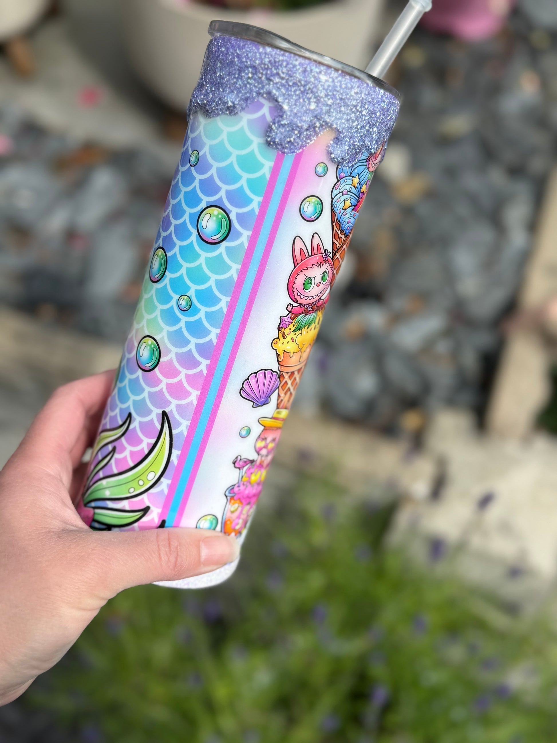 20oz stainless steel tumbler with Labubu design and stunning glitter drip all sealed with Hyperion for a glass like finish.