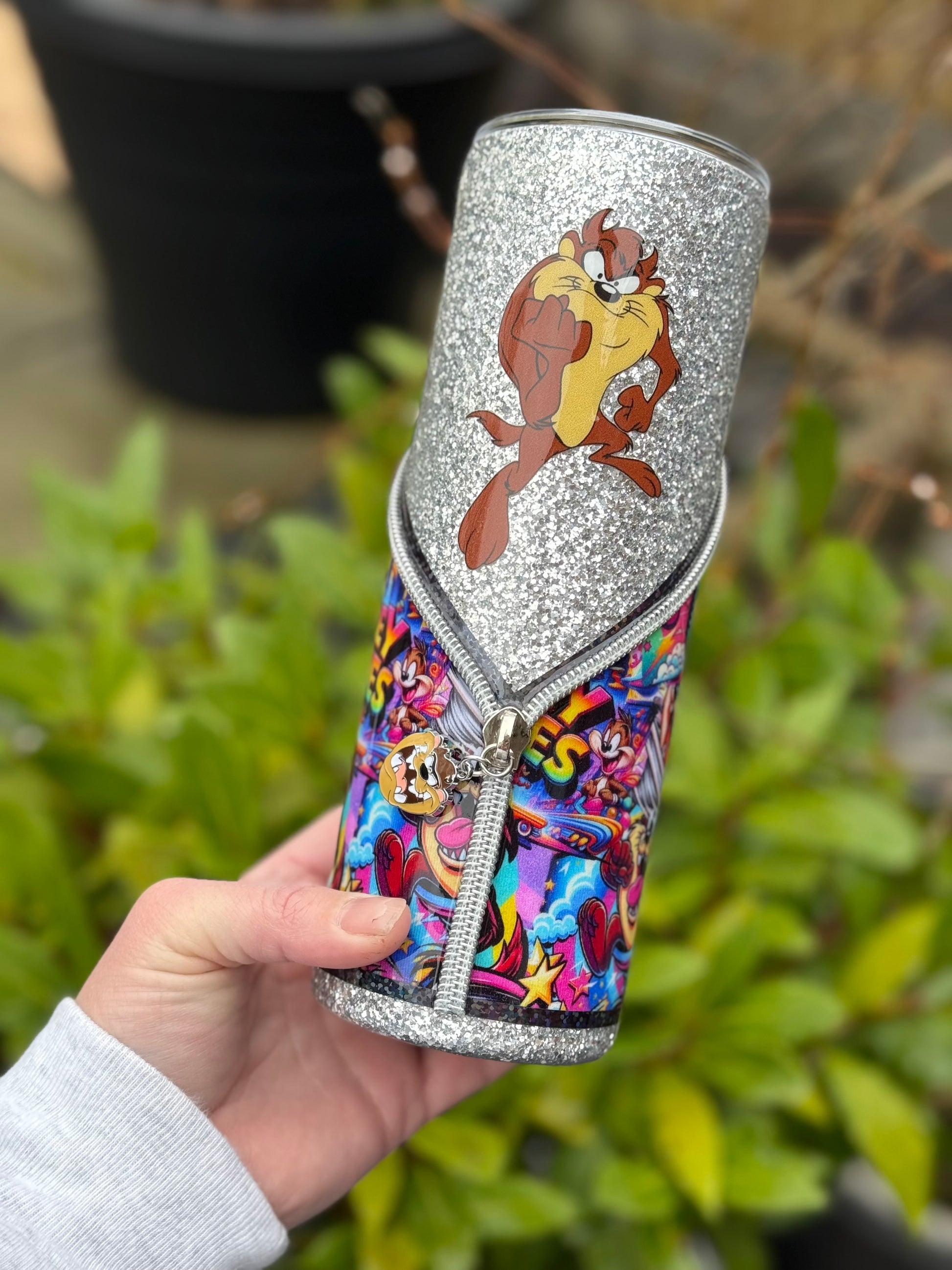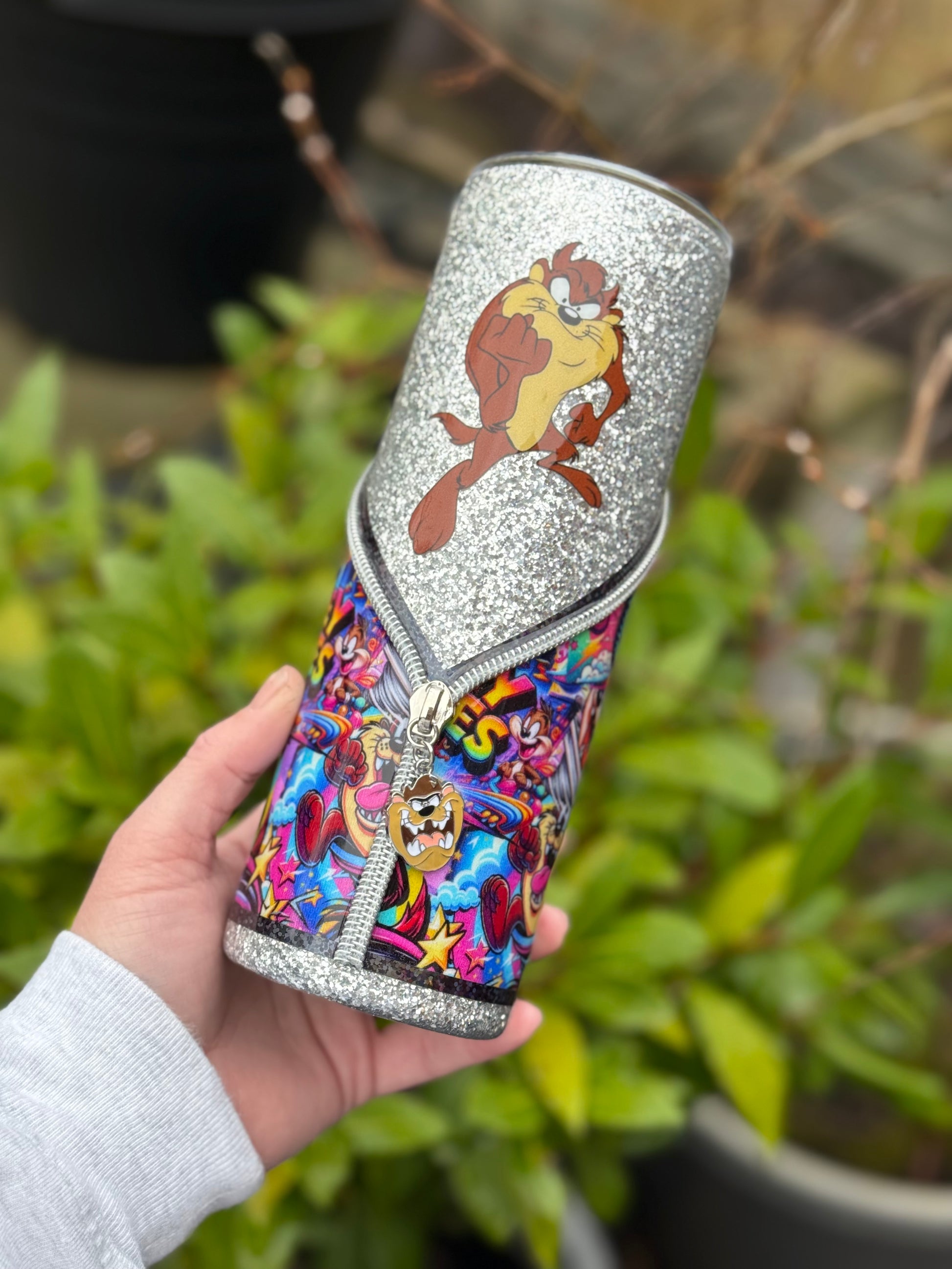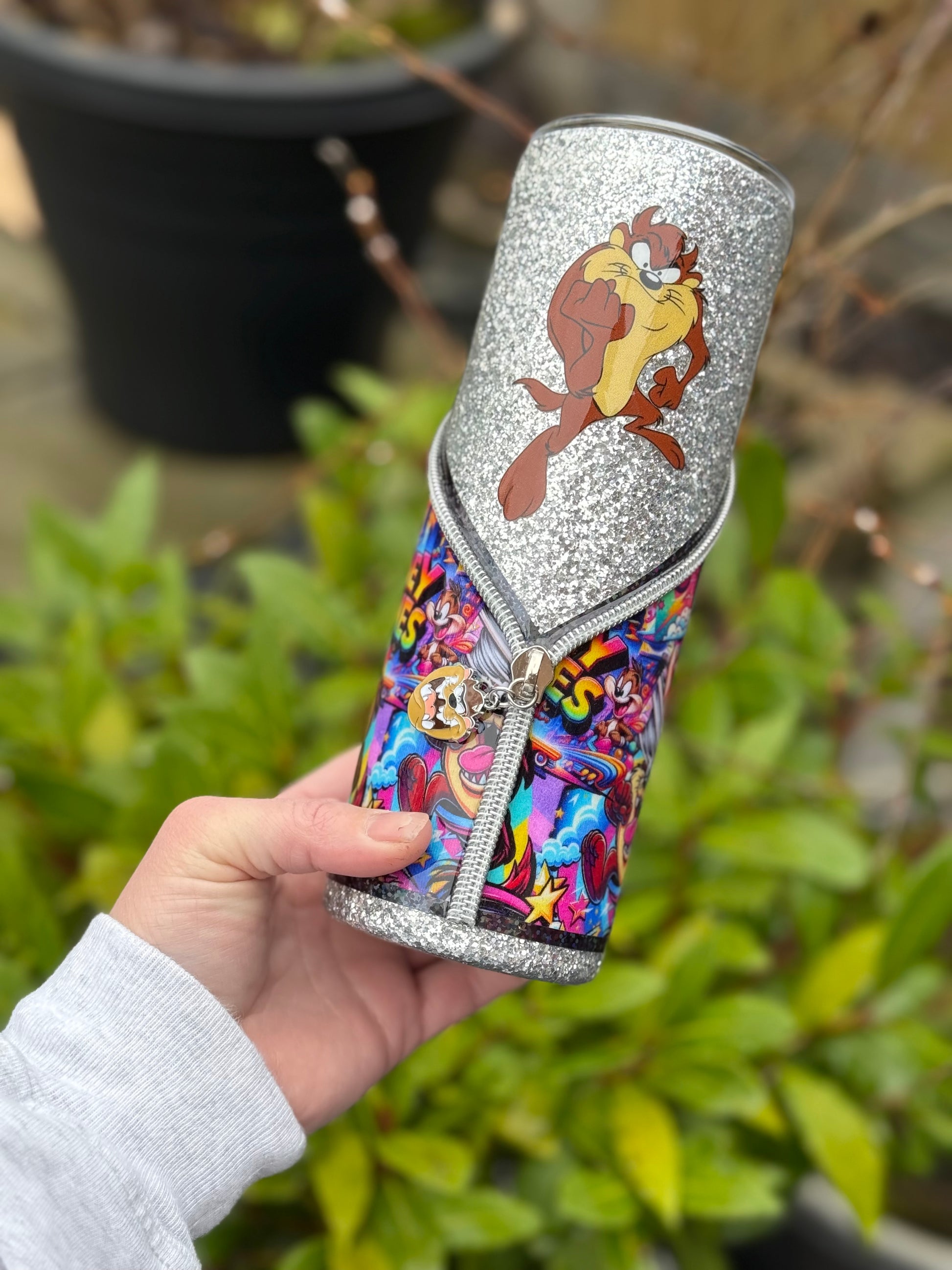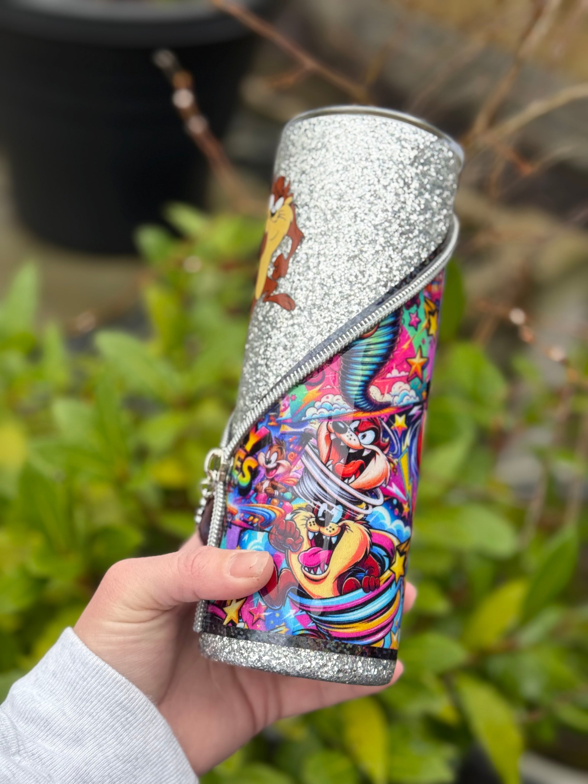 20oz zipper tumbler with Tasmanian devil design and matching pull!! Stunning silver glitter which compliments beautifully. Comes with lid and straw. Tumbler sealed with Hyperion for a glass like finish. Recommended hand wash only.