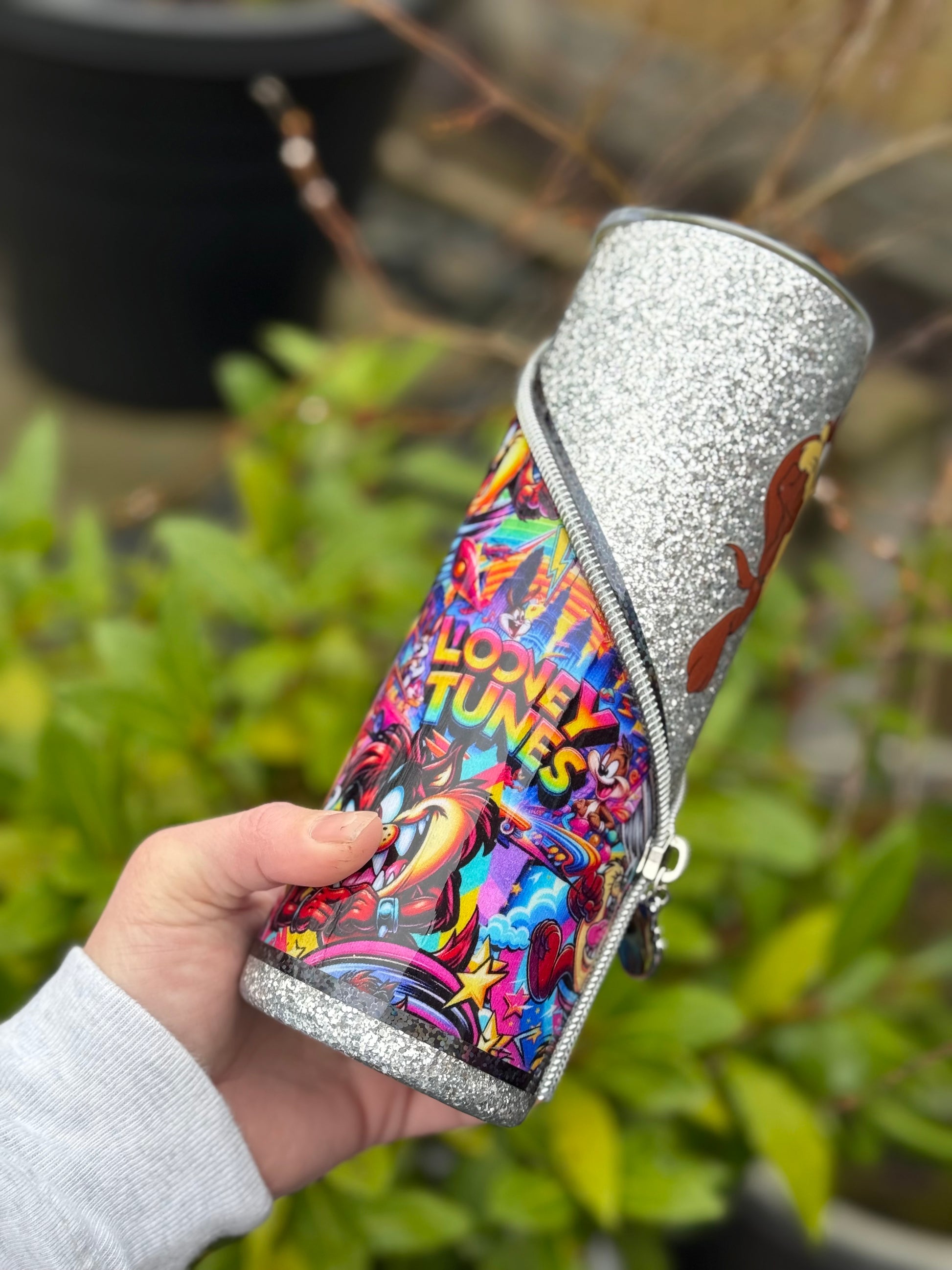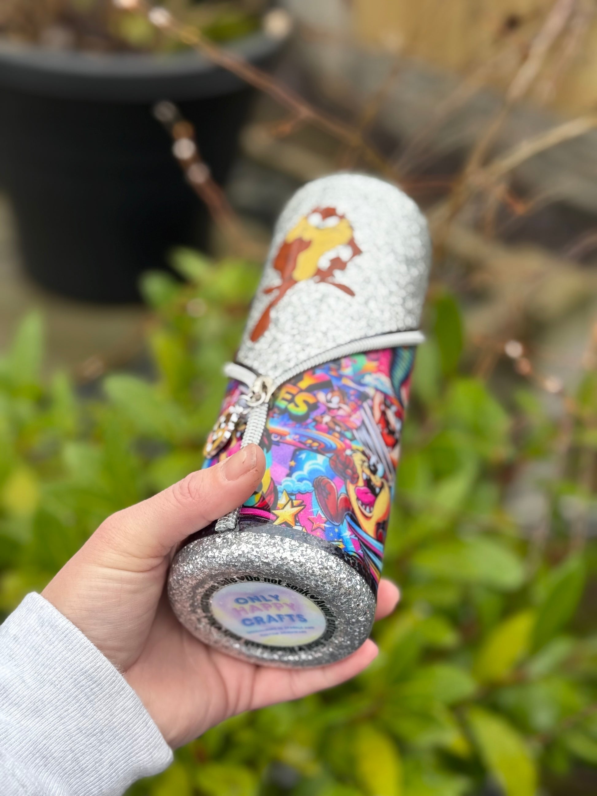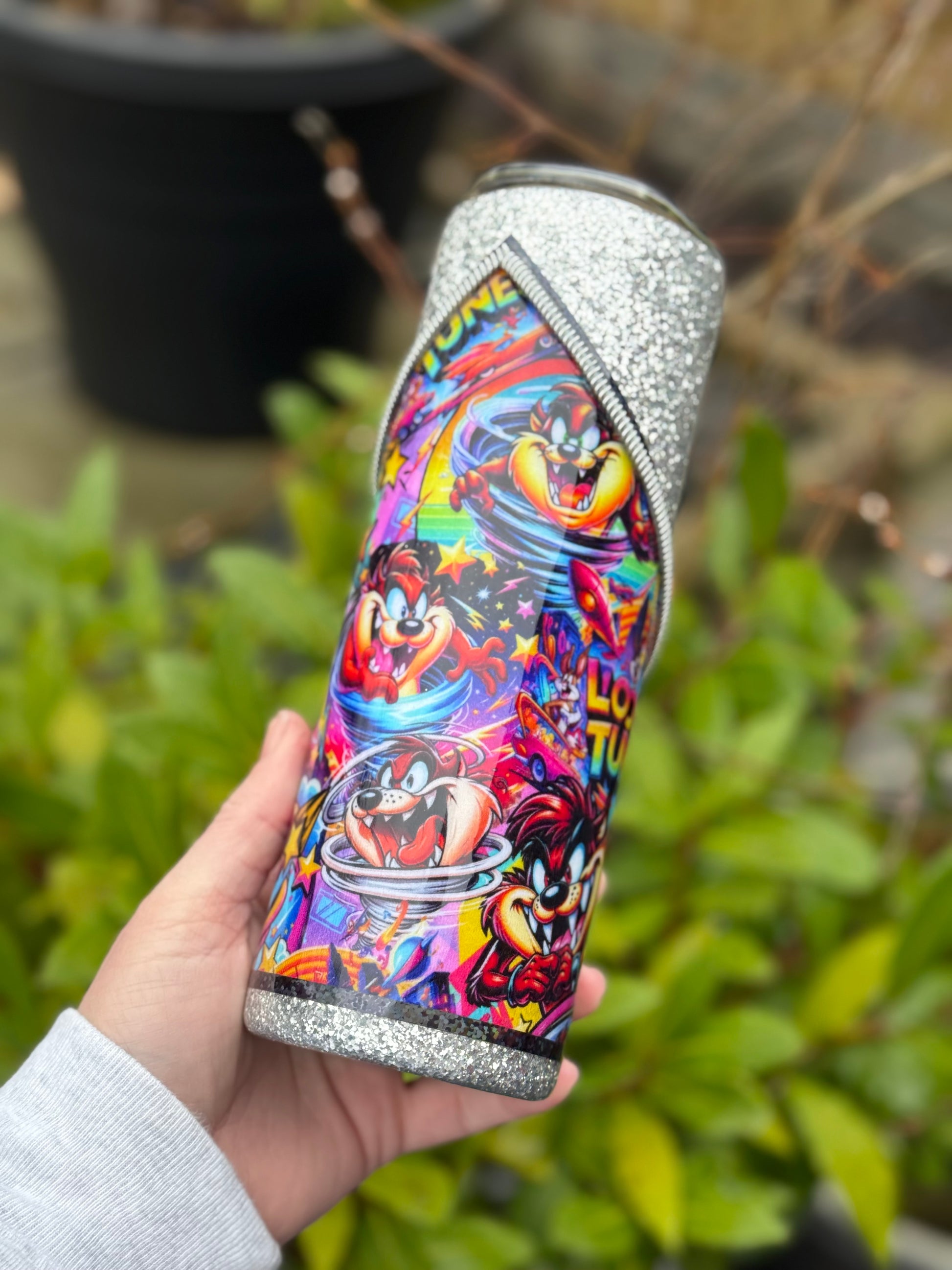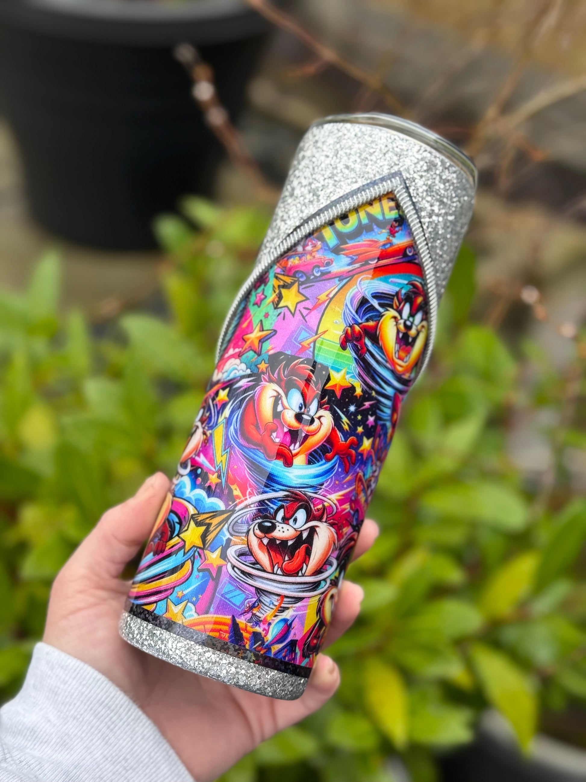20oz zipper tumbler with Tasmanian devil design and matching pull!! Stunning silver glitter which compliments beautifully. Comes with lid and straw. Tumbler sealed with Hyperion for a glass like finish. Recommended hand wash only.