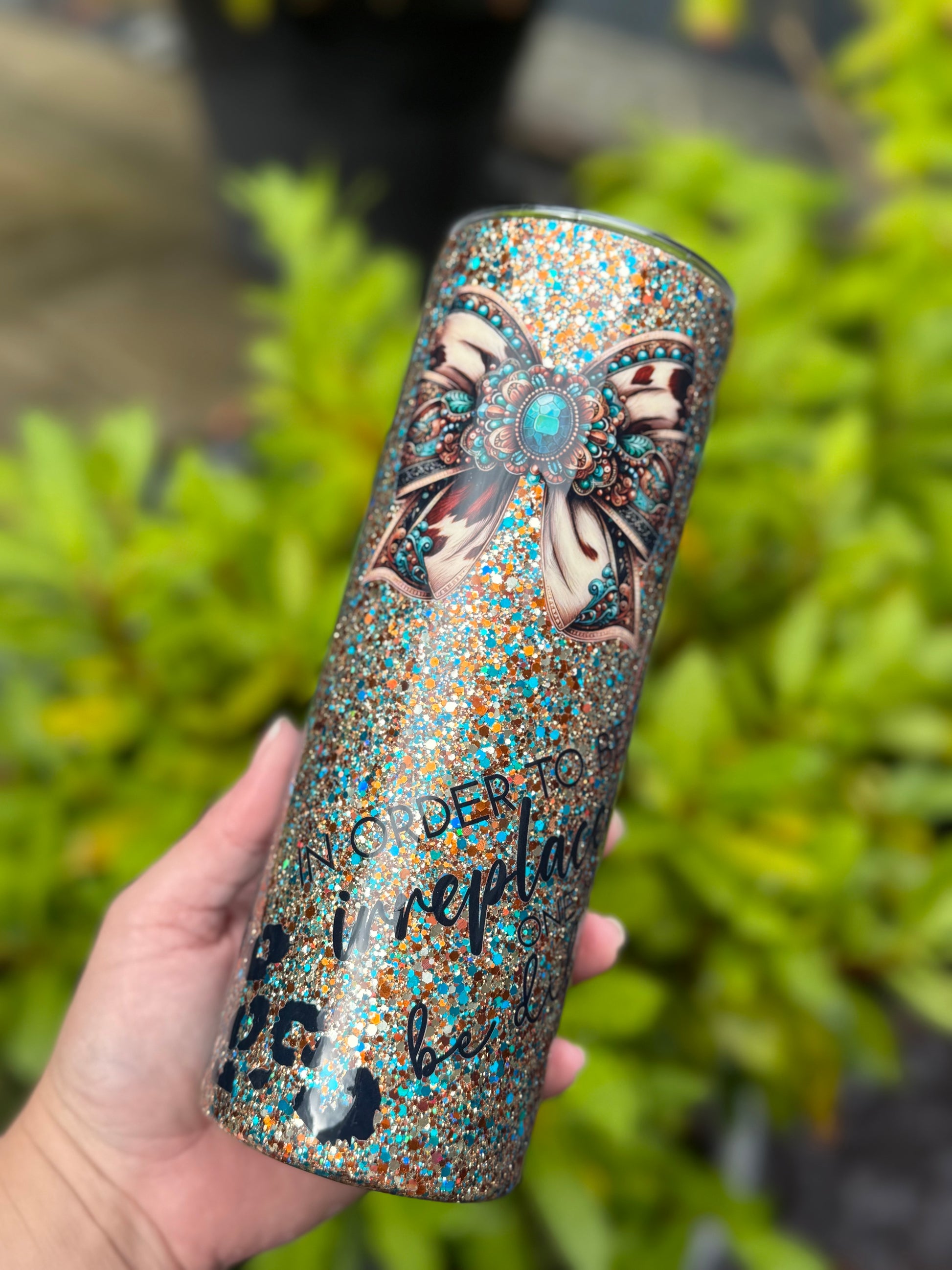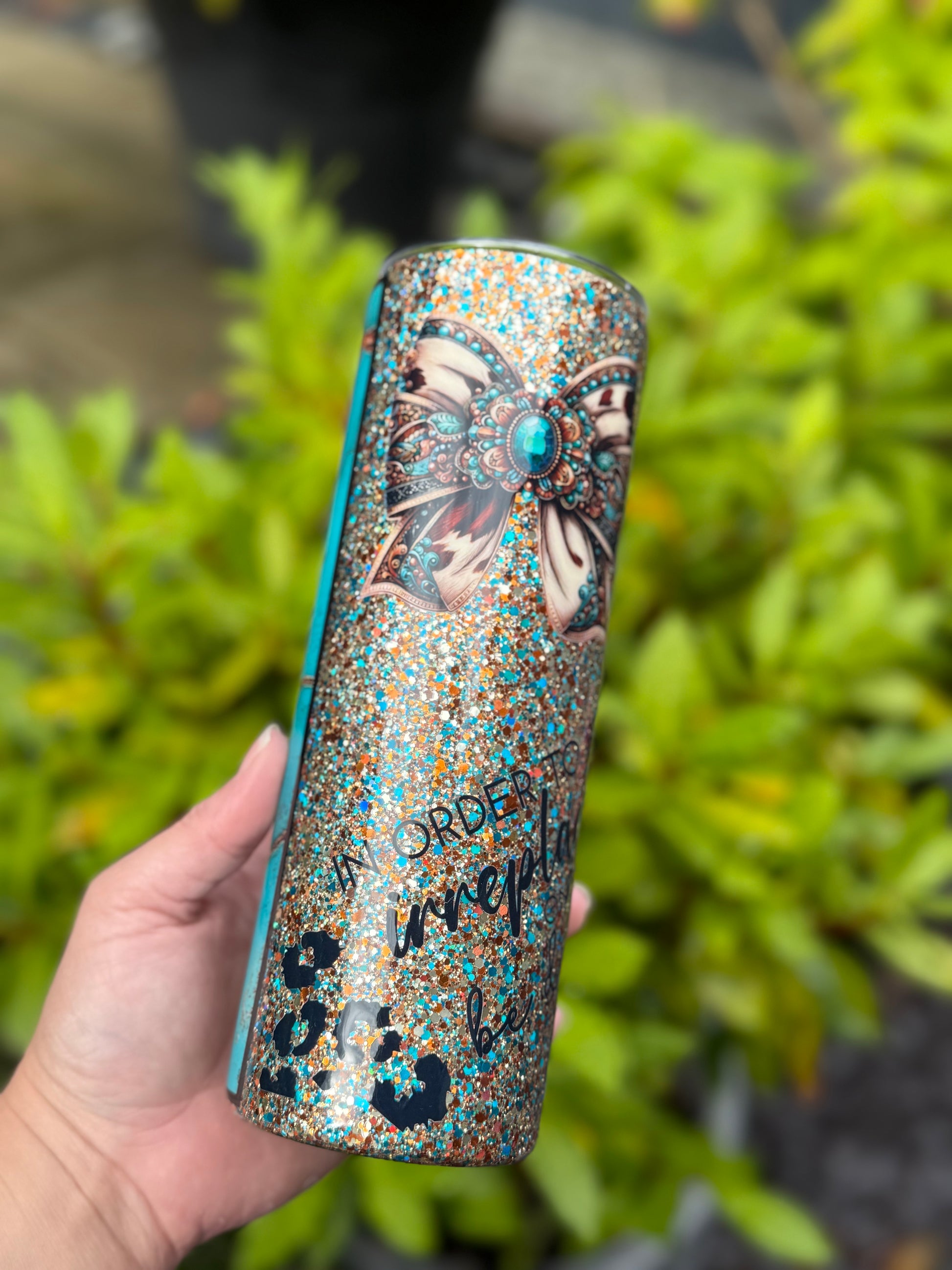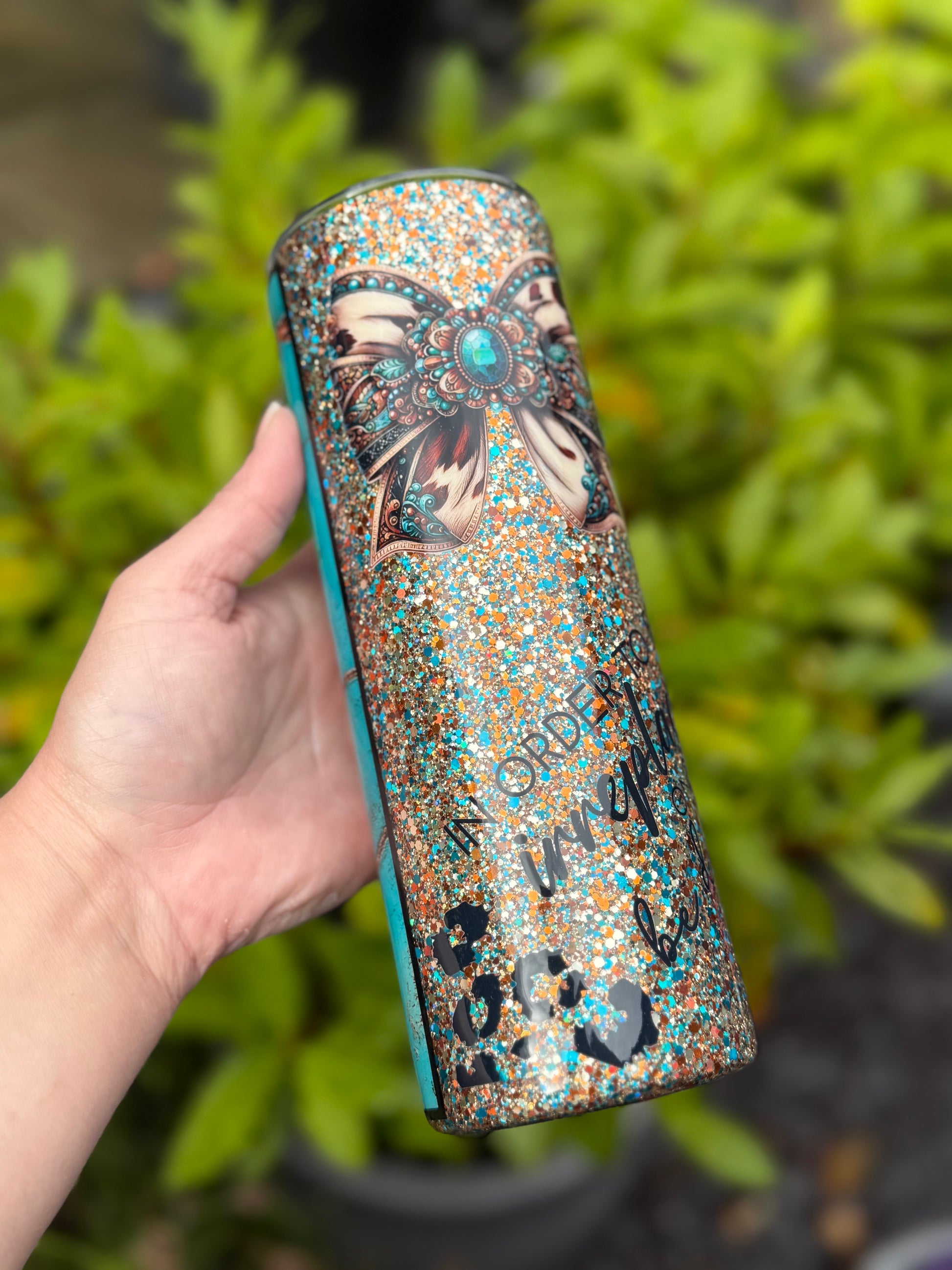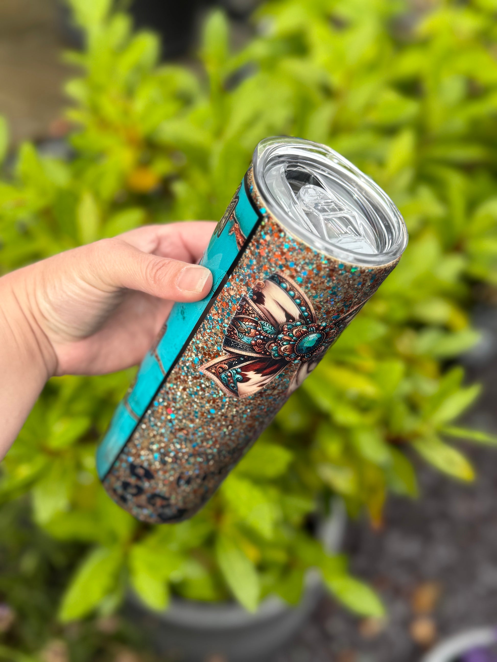 Western design tumbler, stunning glitter mix featuring gold, teals and blues, with added western decals and bow, all sealed with Hyperion for a beautiful finish.