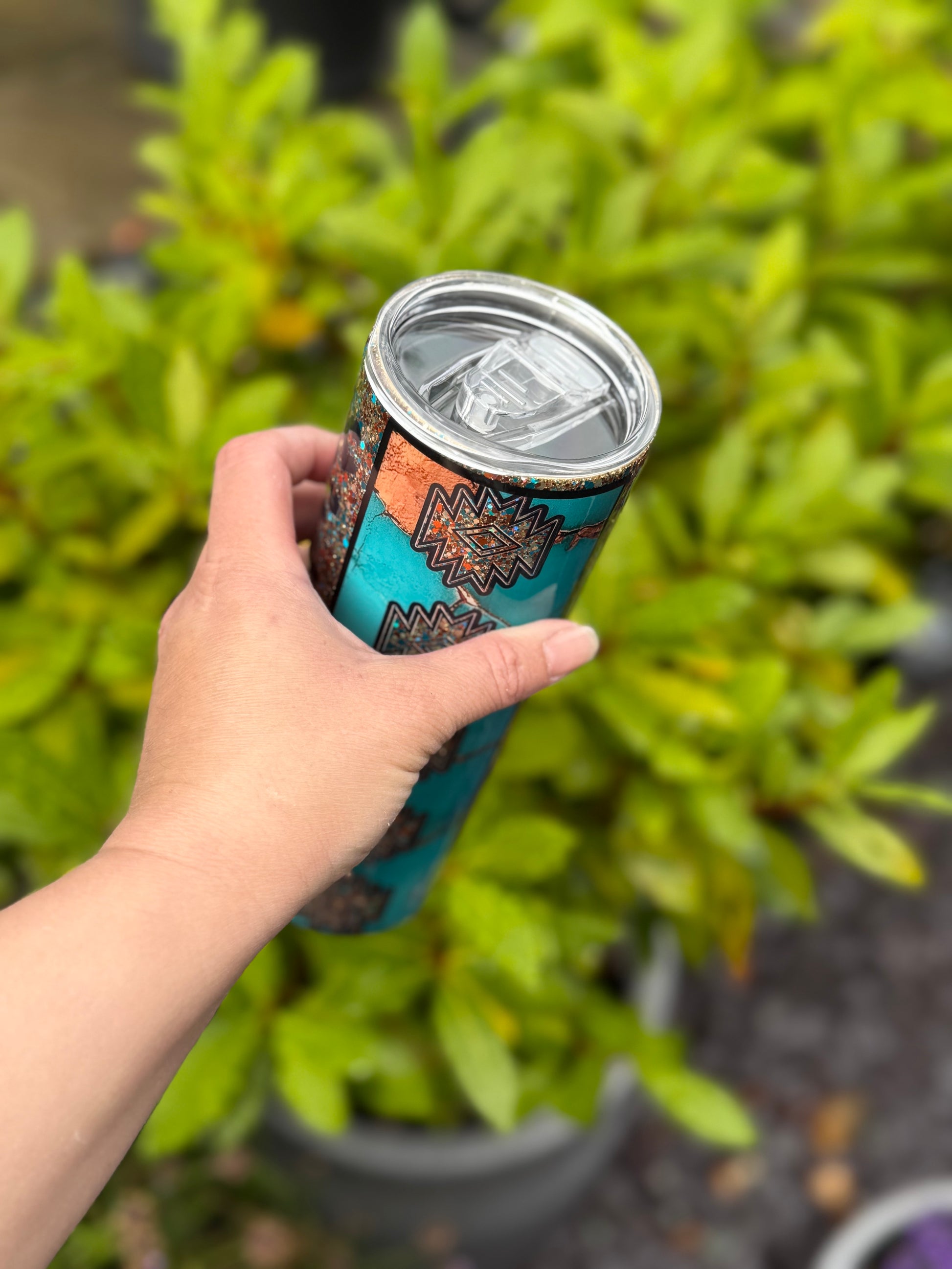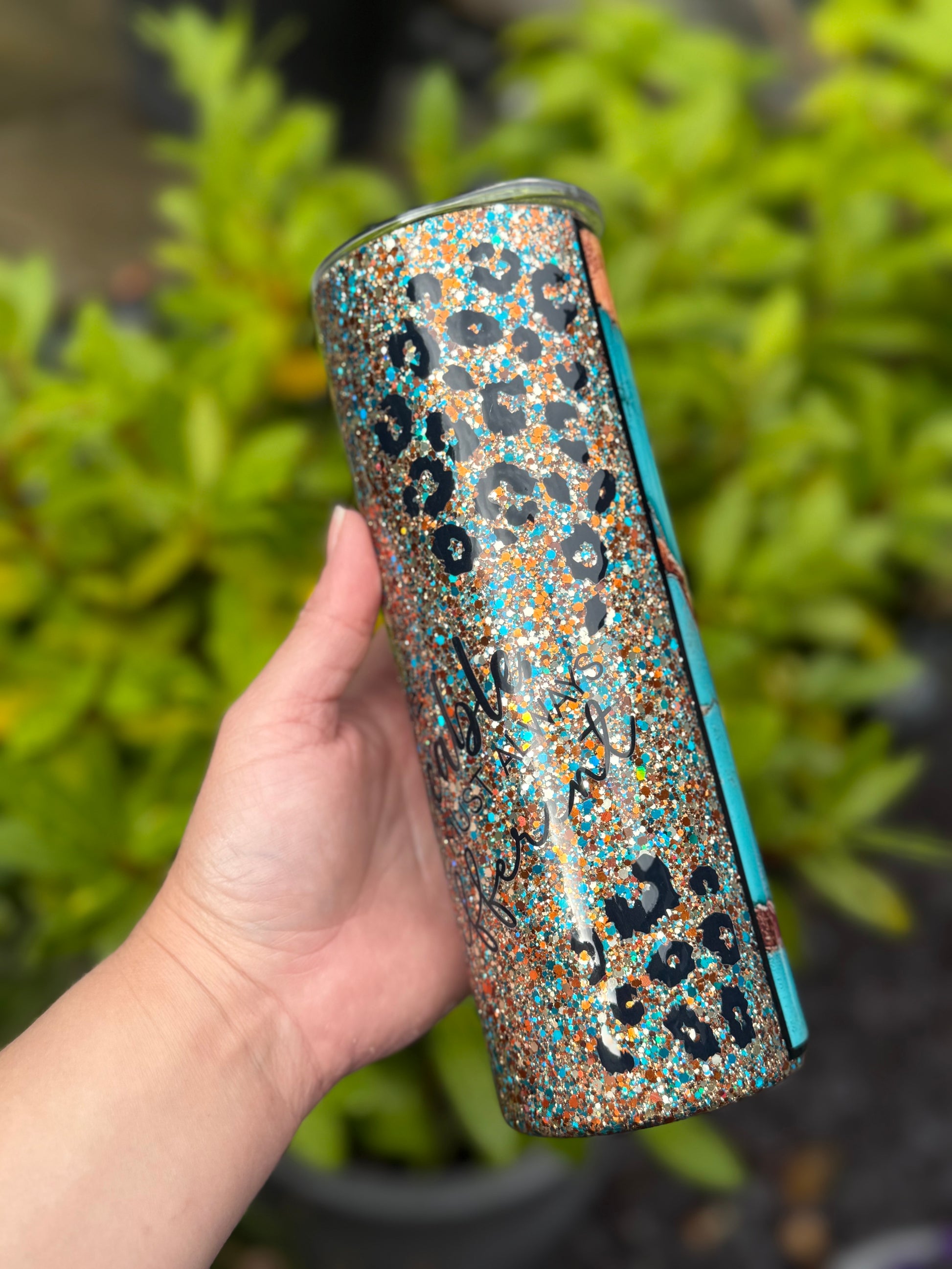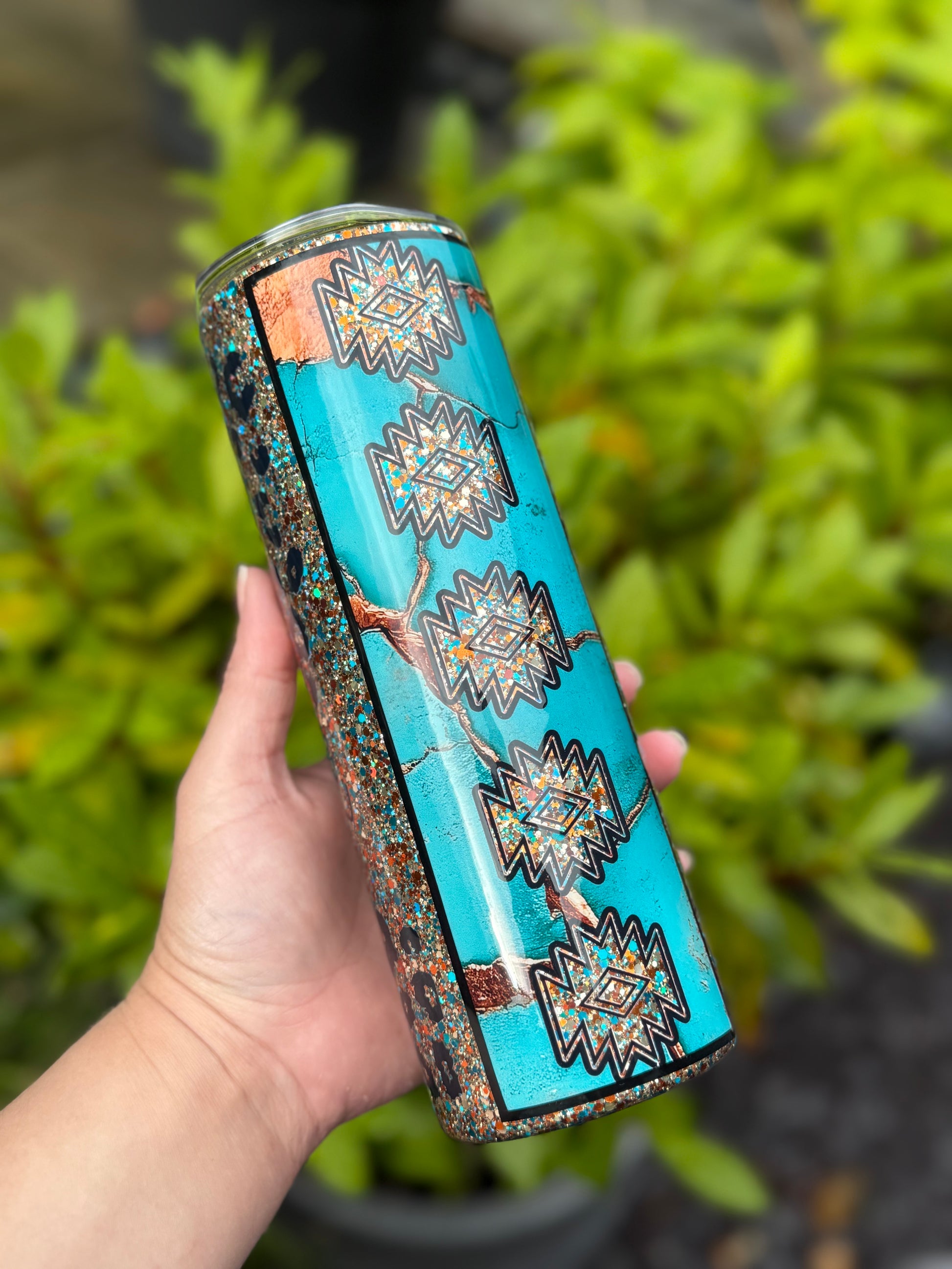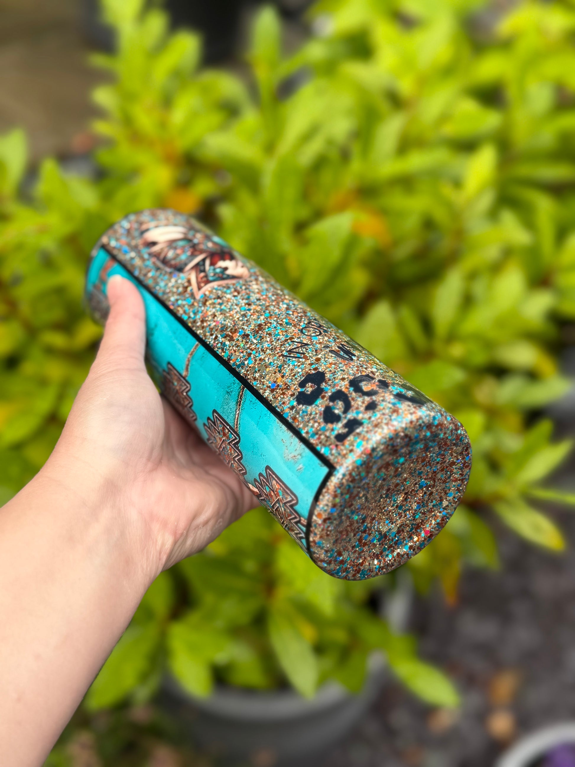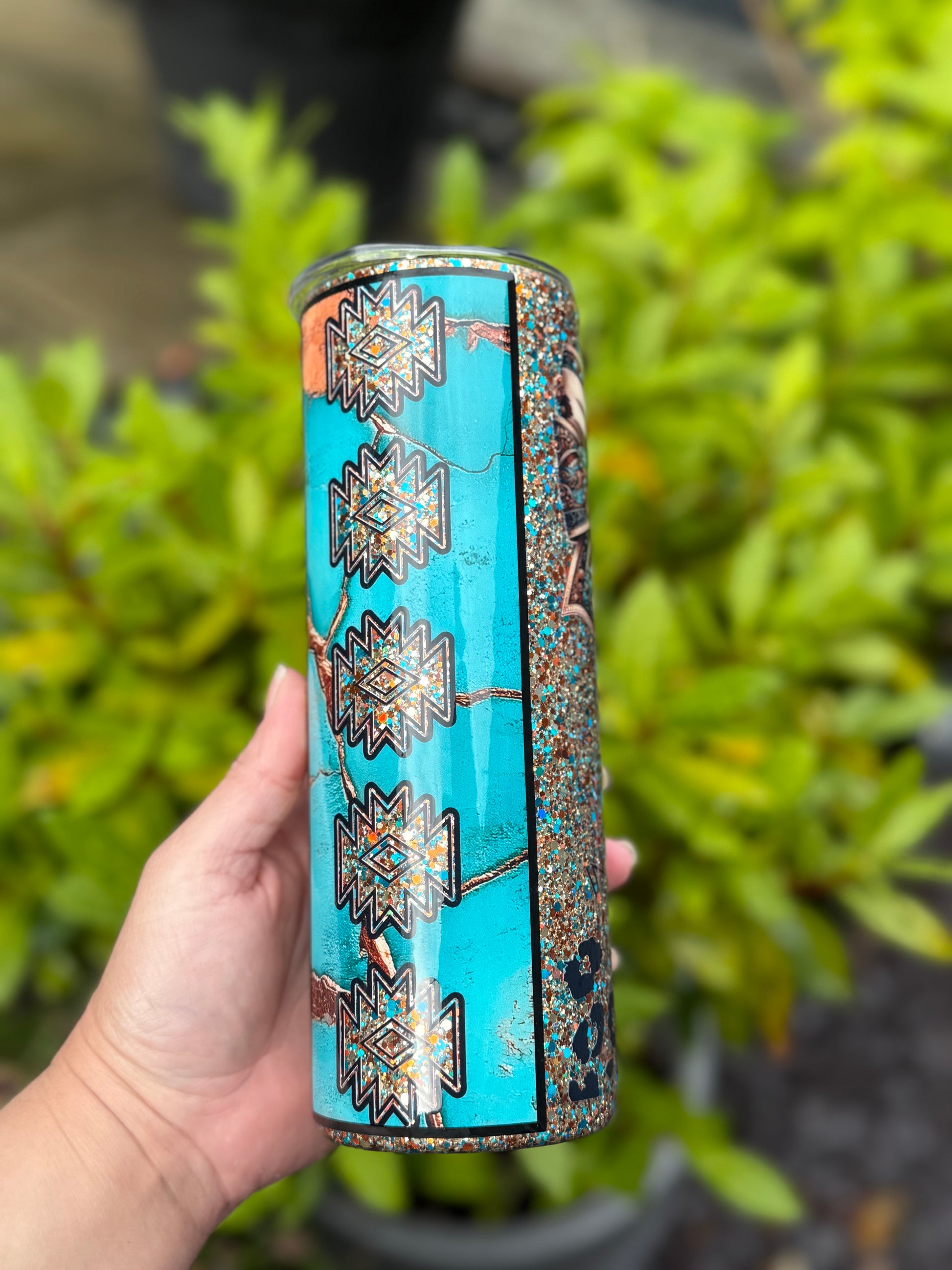 Western design tumbler, stunning glitter mix featuring gold, teals and blues, with added western decals and bow, all sealed with Hyperion for a beautiful finish.